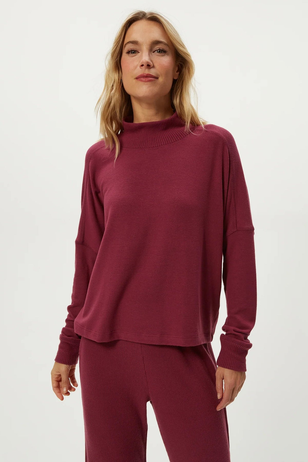 So comfortable you might try to get away with wearing her everyday. Frida has a mock neck with an easy fit and dropped shoulders.