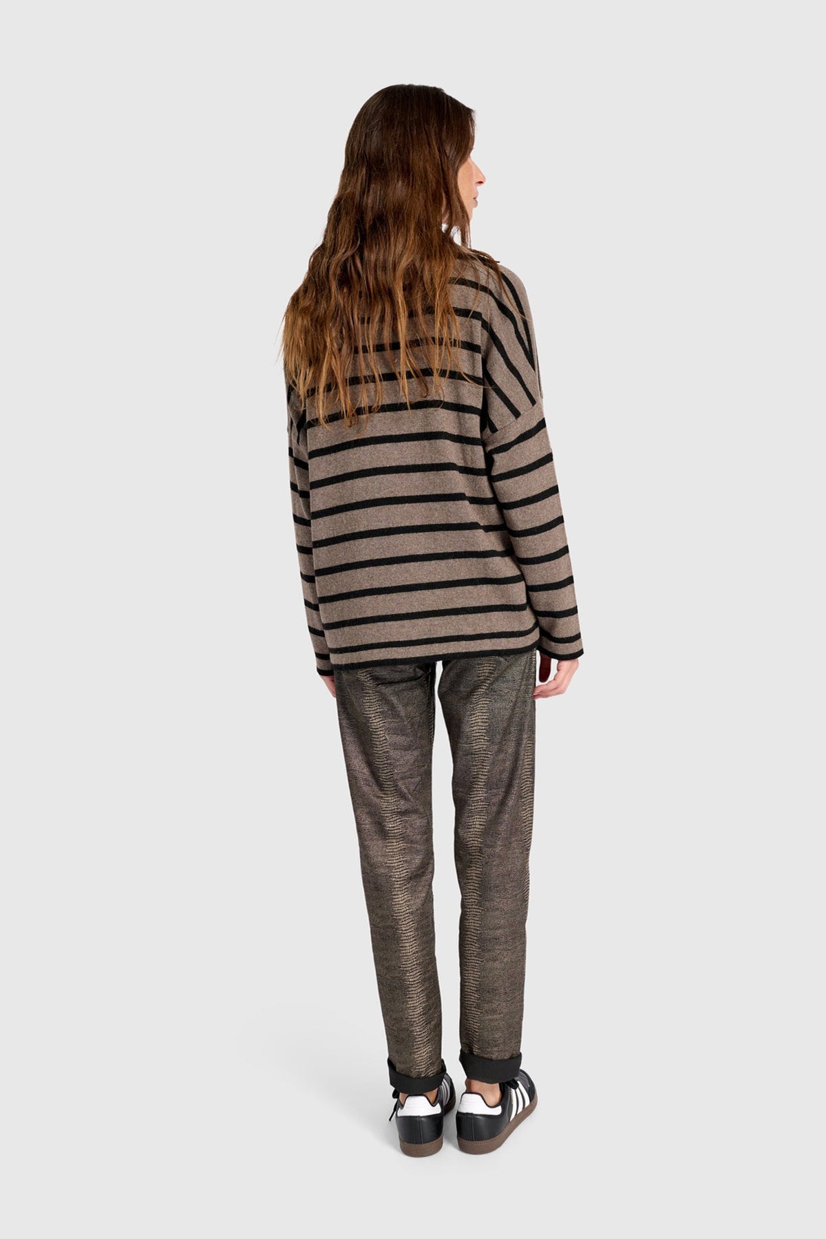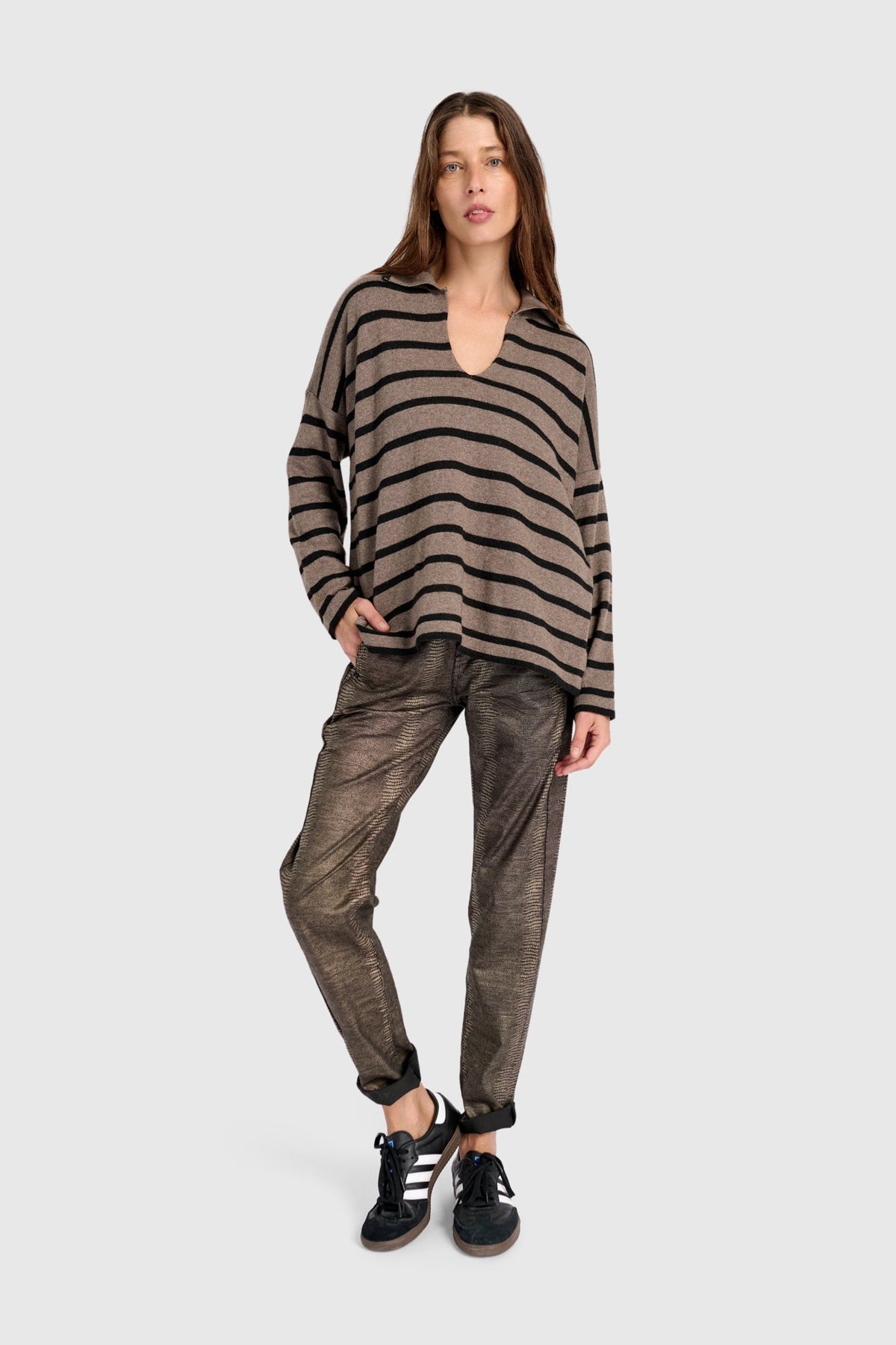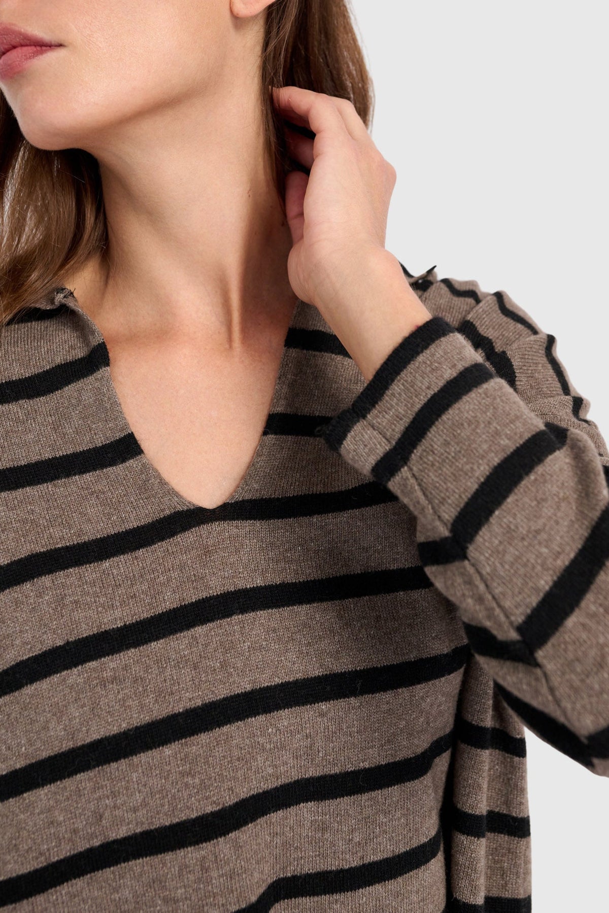 Cozy up in style with the Collard Sweater in Brown and Black Stripe. Its playful stripes add a fun twist to your everyday look, while the soft fabric keeps you warm and comfy. Perfect for layering on crisp days or lounging with flair, this sweater brings both comfort and character to your wardrobe.