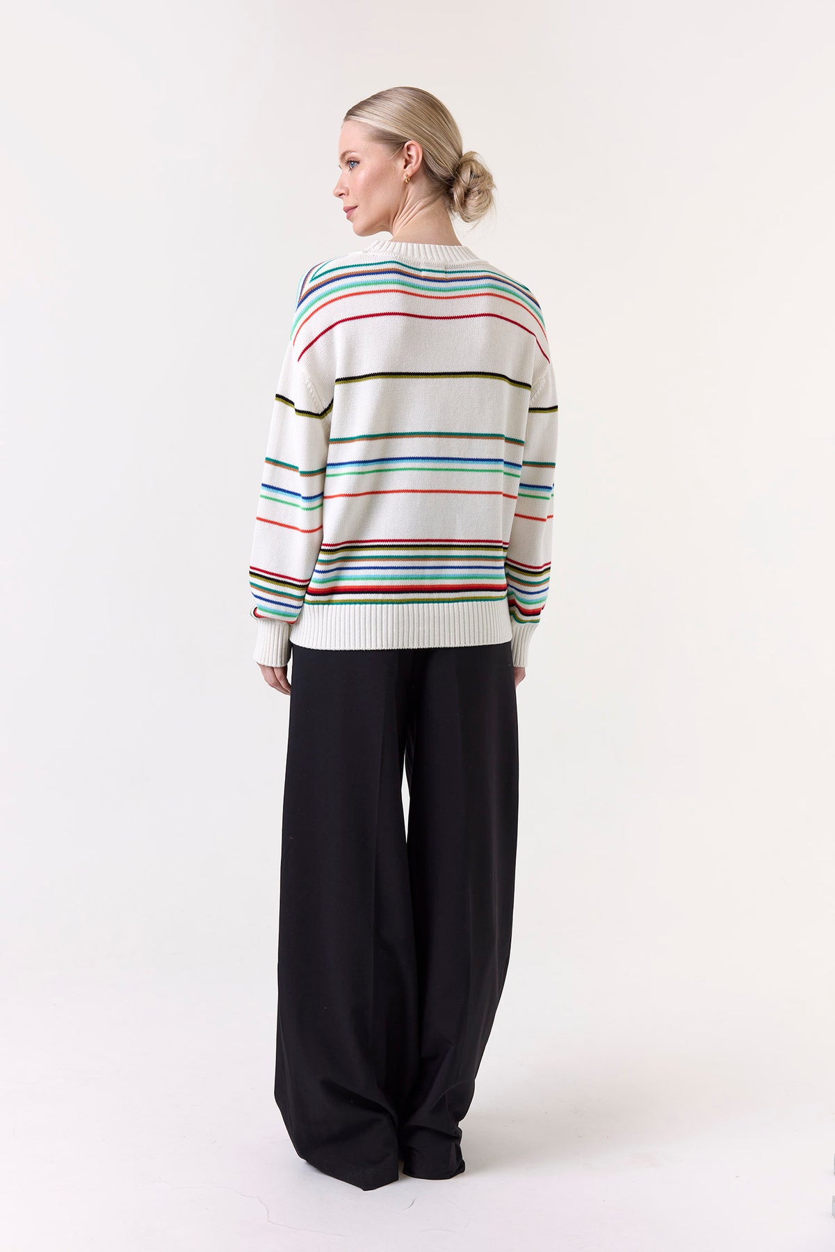Brighten your wardrobe with the Raya Rainbow Stripe Crew in Ivory. This cozy, soft crewneck features cheerful rainbow stripes that add a splash of fun to any outfit. Perfect for layering or wearing on its own, it combines comfort with a playful pop of color to keep your style vibrant and lively all day long.