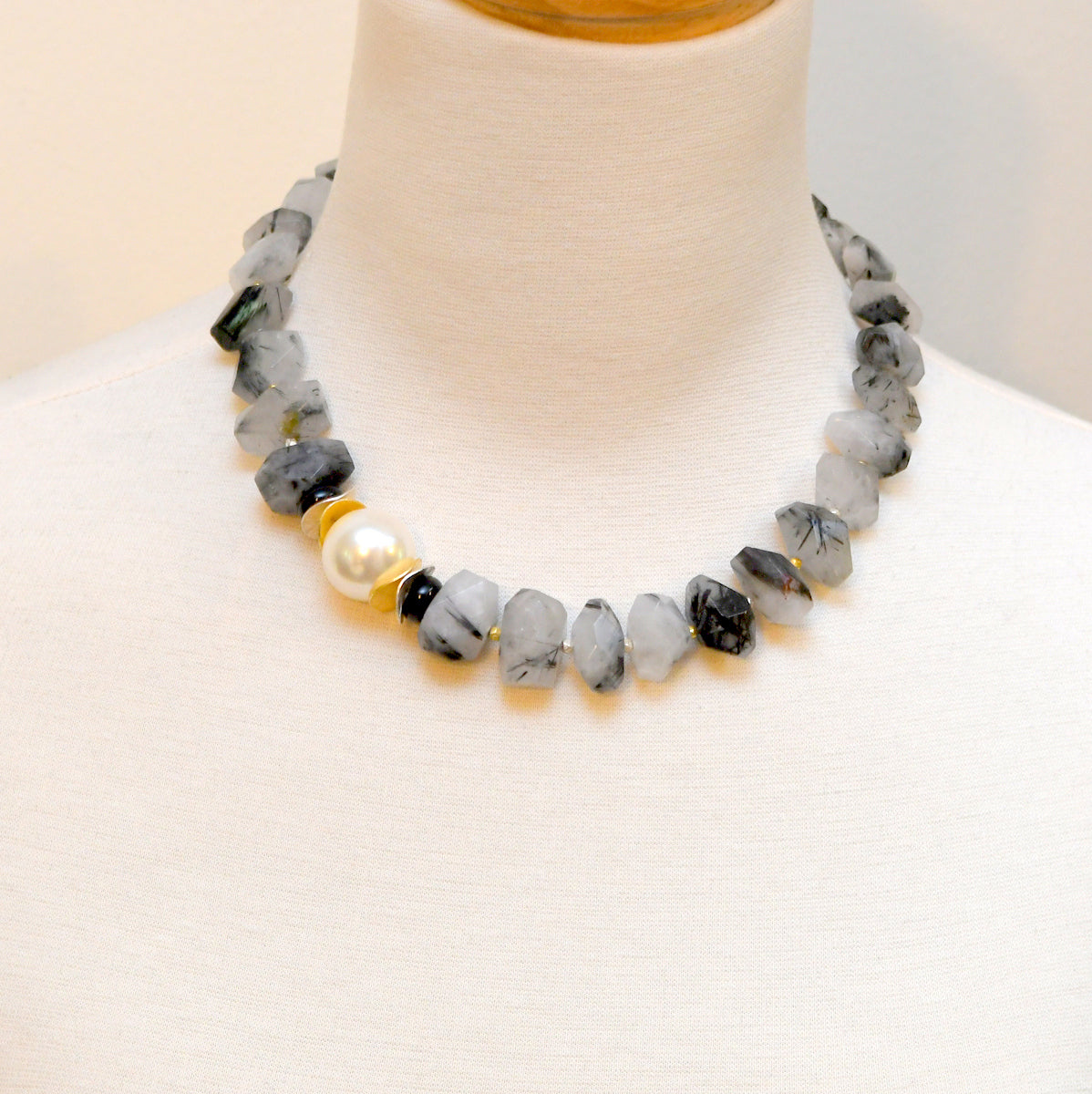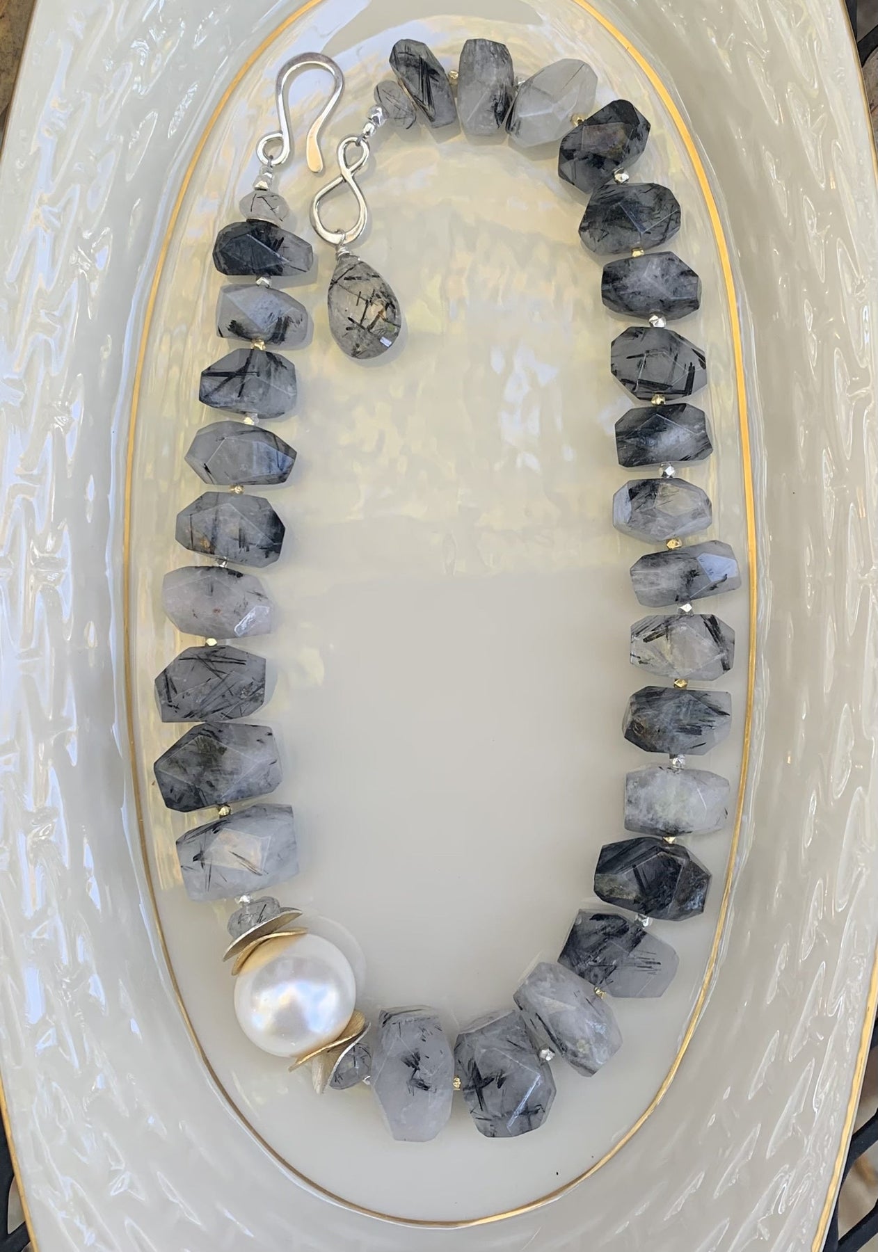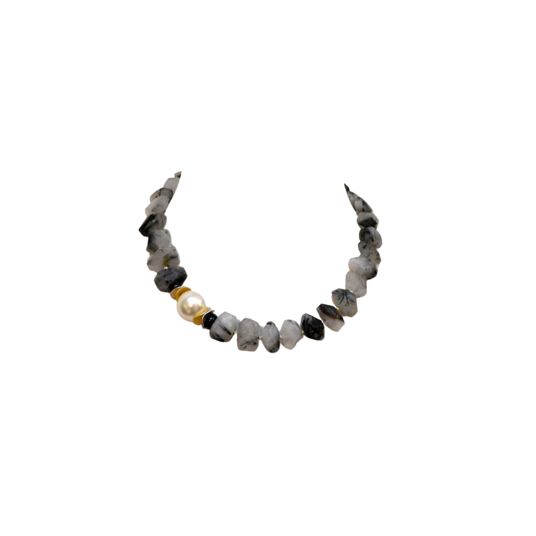Discover a stunning statement piece that showcases luminous mother of pearl, beautifully paired with sterling and vermeil paillettes alongside onyx. Hand-cut rutilated quartz, sprinkled with shimmering vermeil and sterling nuggets, adds dynamic movement to this exquisite design. Versatile for both day and night wear, it's perfect for making an impression at any presentation.