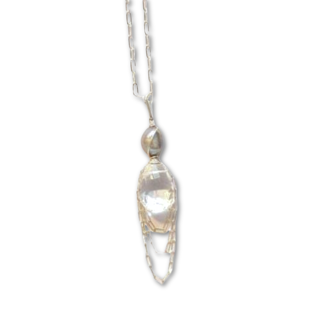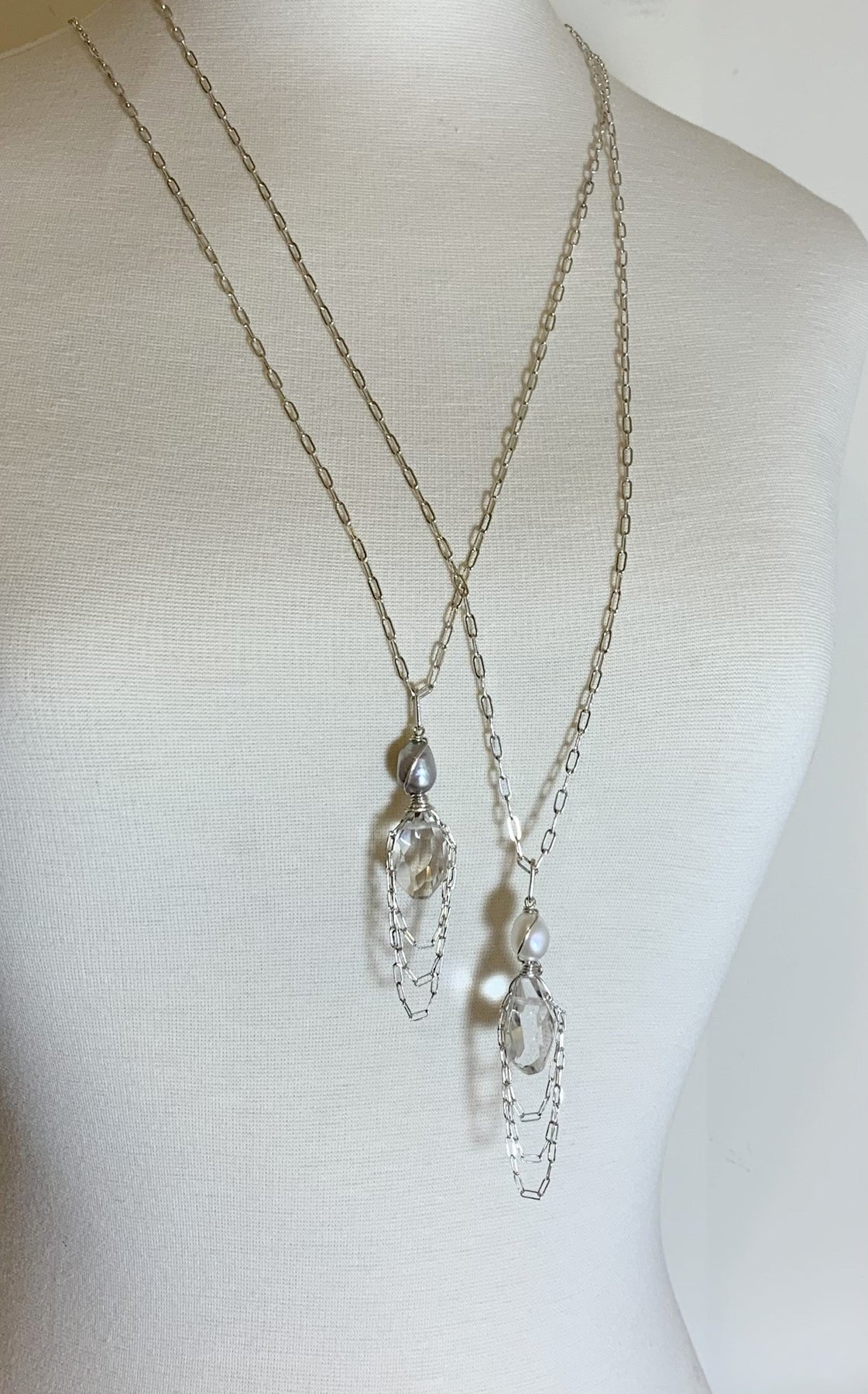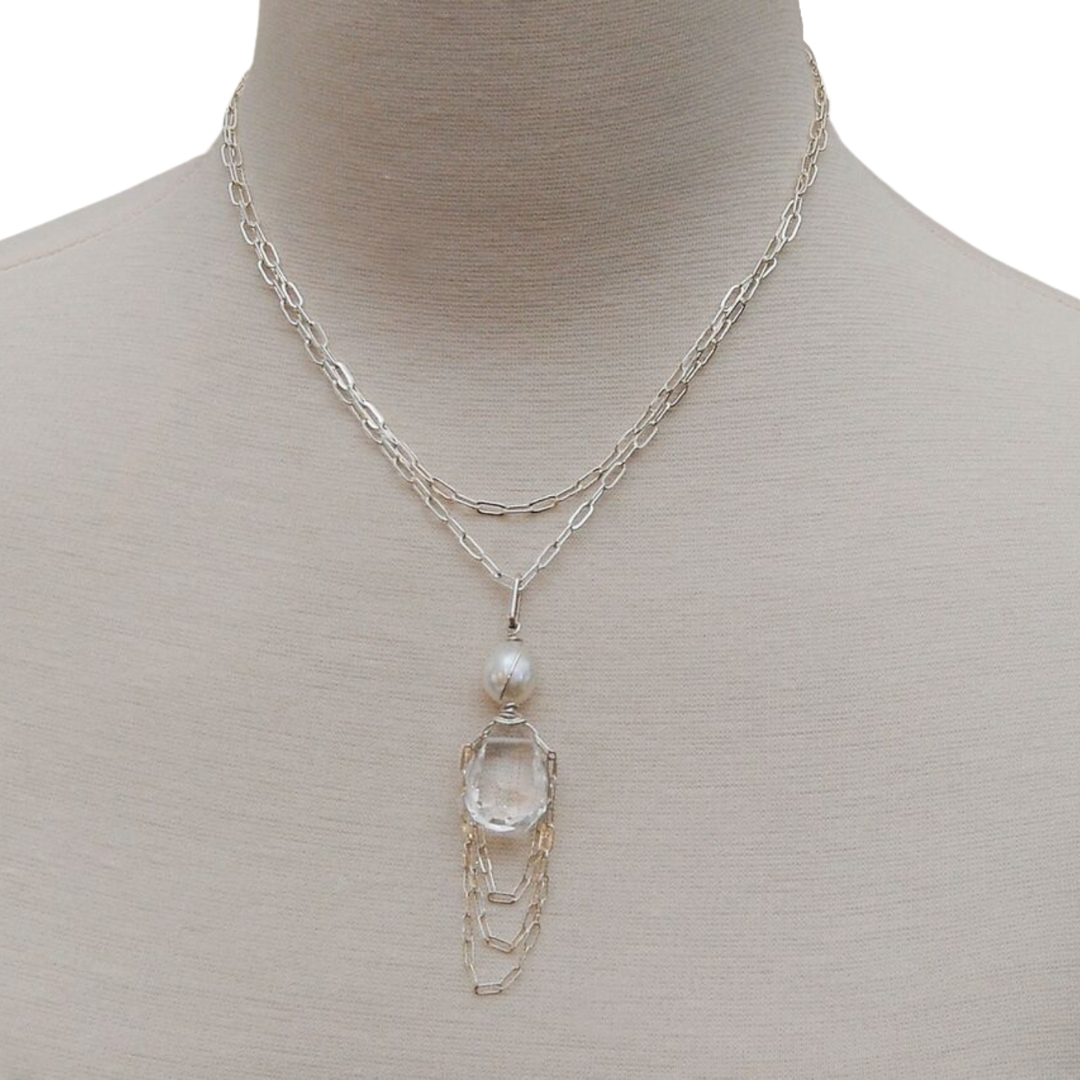 Discover a timeless design with a contemporary flair. This exquisite necklace features a wire-wrapped cultured pearl gracefully positioned atop hand-cut rock crystal. The eye-catching linear linked paperclip chain enhances both the gray and white pearl, infusing sophistication into any outfit.