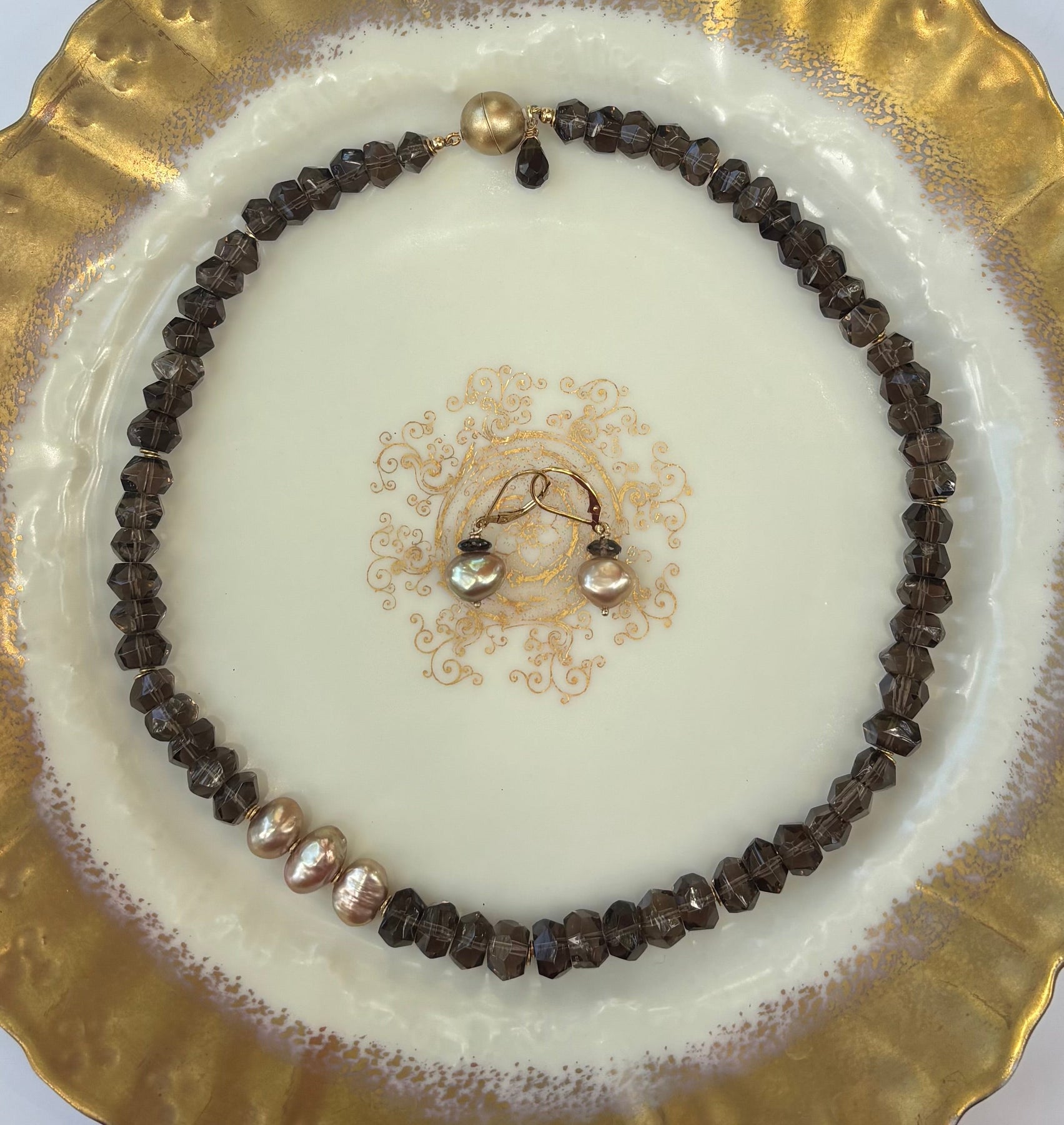 Discover the elegance of these stunning earrings that showcase lustrous golden pearls in a unique irregular shape, enhancing their natural beauty. Accented with exquisite smoky topaz gems, these earrings embody the rich colors of the season, making them perfect for everyday wear or as a beautiful complement to the Lennox Necklace.