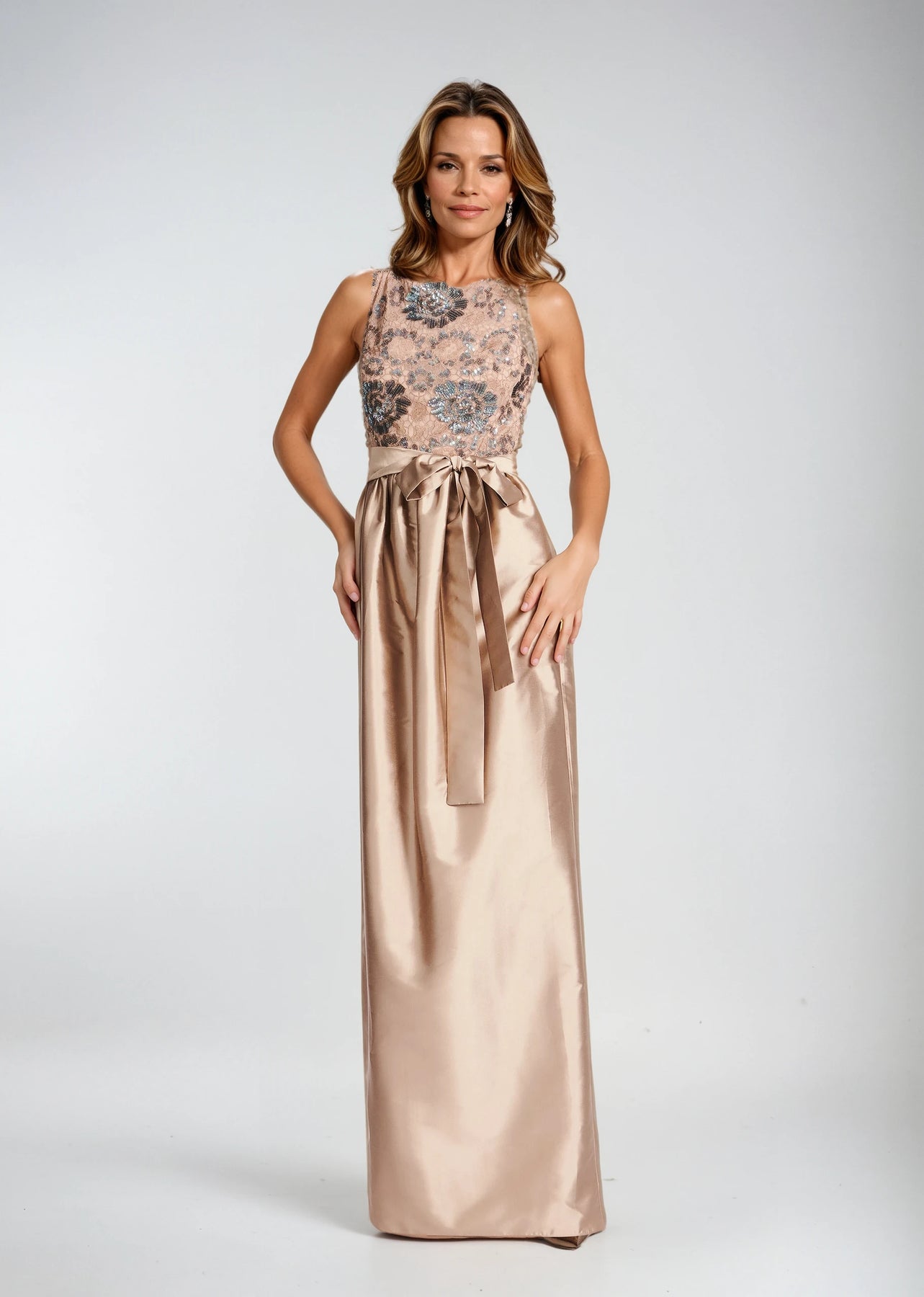 SEQUINED LACE GOWN WITH TAFFETA SKIRT SUNTAN