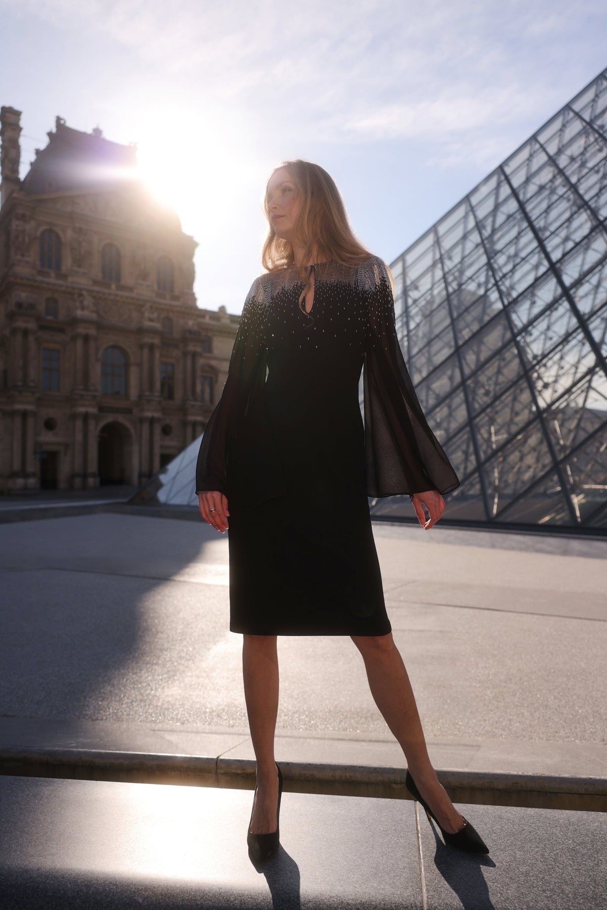 Elevate your cocktail attire with this stunning dress adorned with gold glass beads that create a striking ombre effect starting from the shoulder. The design includes sheer chiffon sleeves and features a chic front keyhole detail, ensuring a sophisticated look. Fully lined in luxurious stretch satin, this dress is both comfortable and stylish.