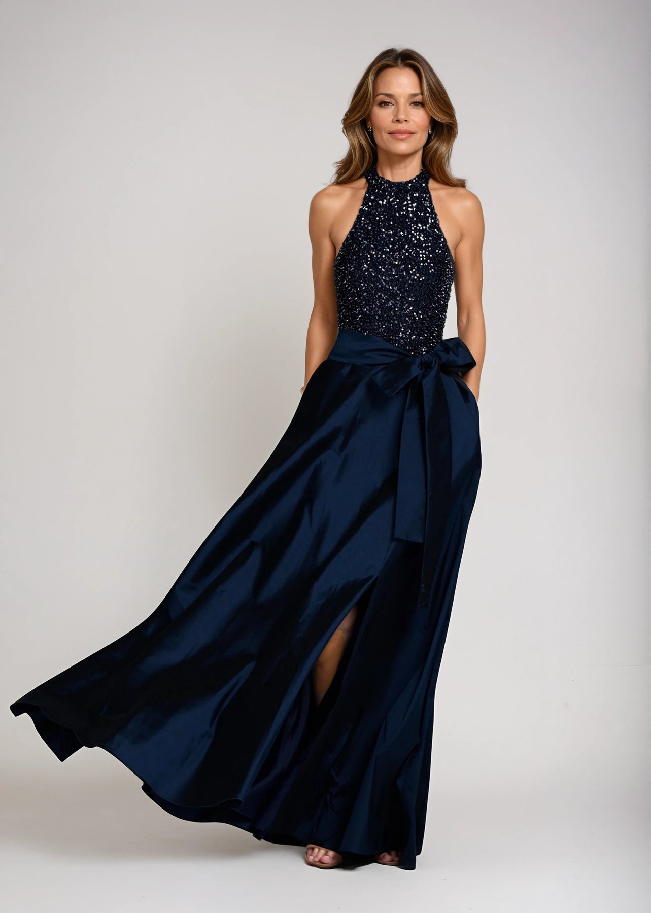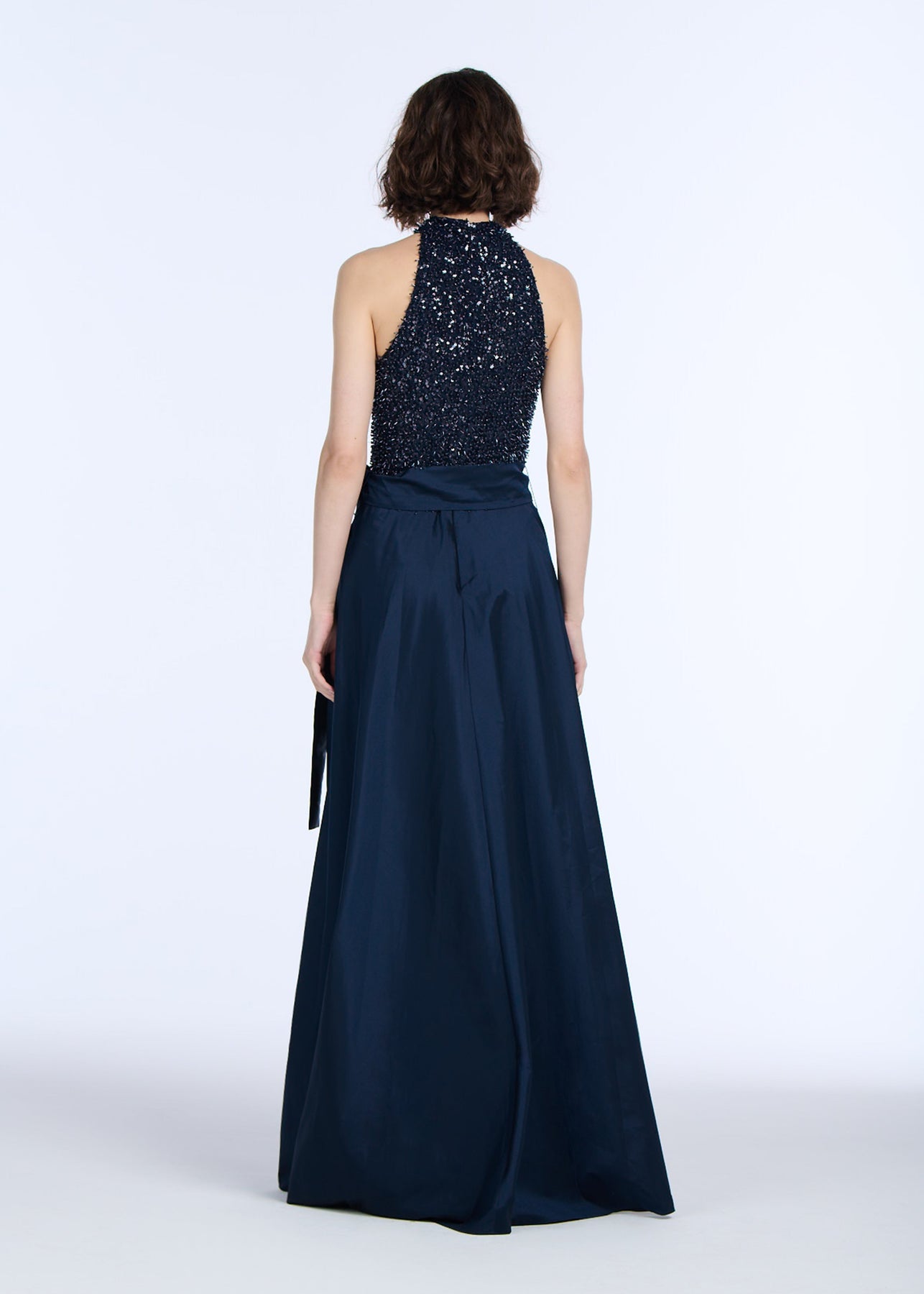 Discover the perfect combination of glamour and comfort with this exquisite dress. The dazzling bodice is designed with gentle stretch for a flattering fit, while the expertly cut taffeta skirt enhances your silhouette. Adorned with hand-beaded glass beads and sequins in a rich navy, this piece exudes a subtle sparkle, complemented by a stylish front slit and convenient pockets.