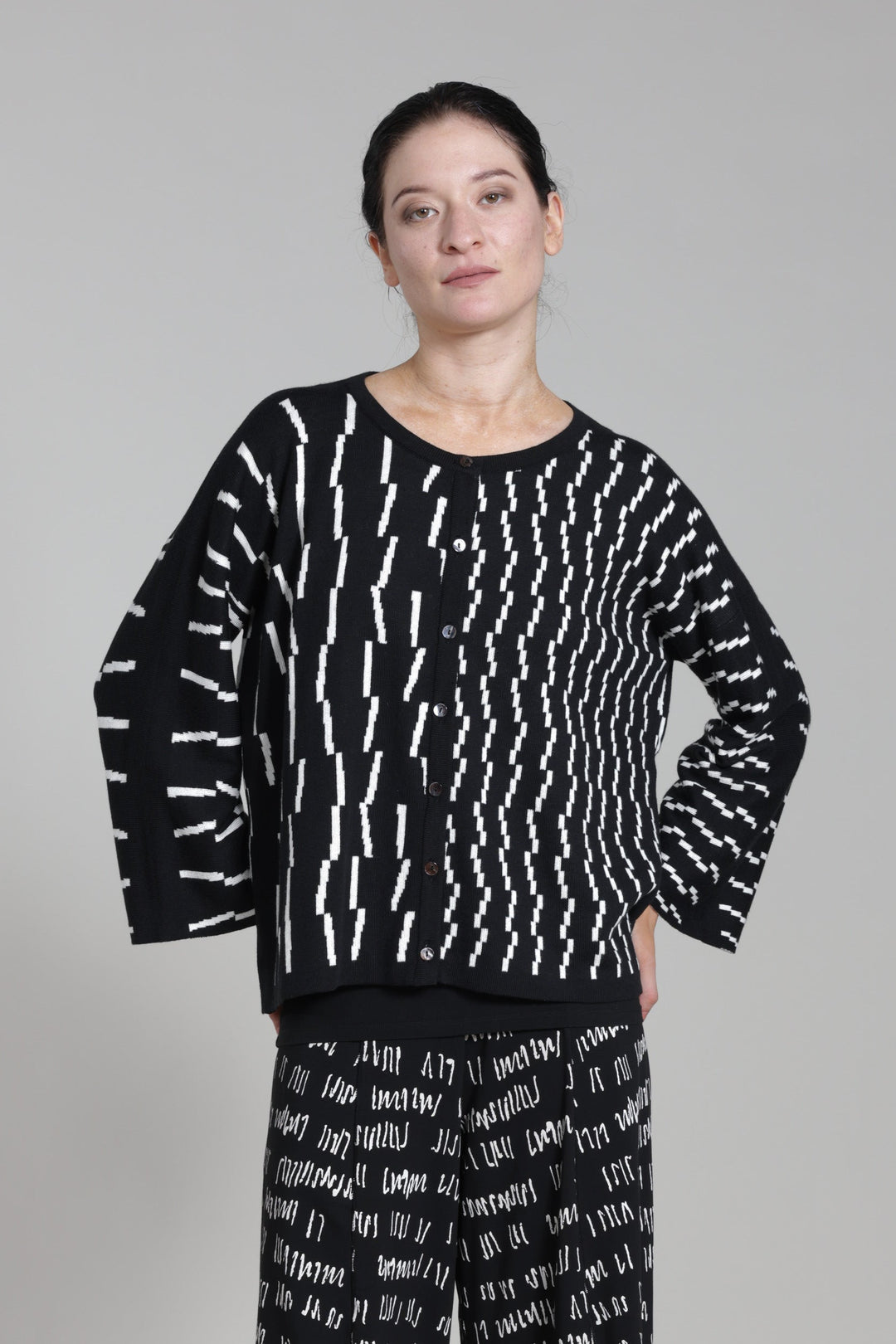 The Enya Reversible Cardigan is your new favorite wardrobe plot twist. This Spring Summer 26 essential flips between black and ivory, giving you two looks in one. The boxy silhouette pairs perfectly with the eye-catching 3D Jacquard pattern—because why choose when you can have both? Crafted from a luxe 50% cotton and 50% viscose blend, it's as comfortable as it is versatile. Double the style, double the fun.