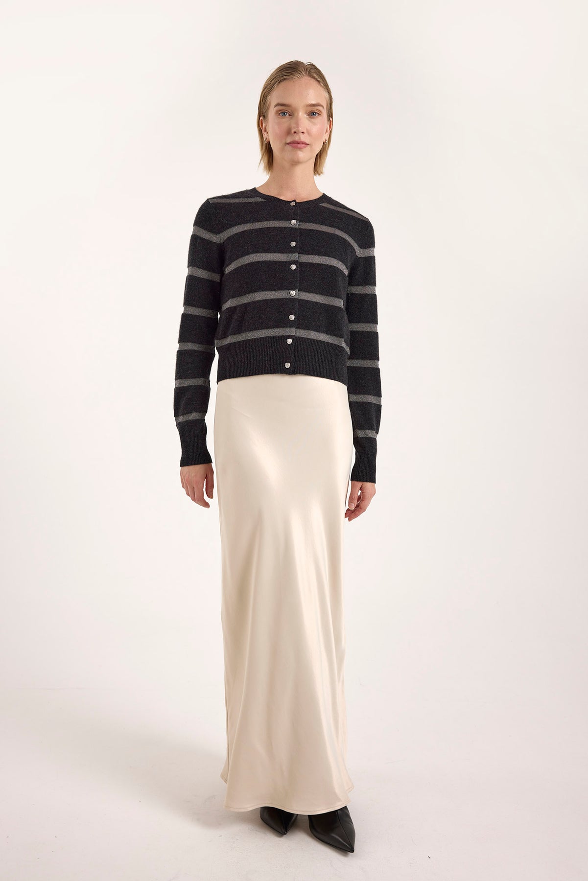 Elevate your everyday style with the Simone Lurex Stripe Cardigan in charcoal gray stripe. This chic layering piece features shimmering lurex details that catch the light beautifully, adding just the right amount of sparkle to your outfit. Perfect for dressing up a casual look or adding dimension to your work wardrobe, this versatile cardigan transitions seamlessly from day to night. Cozy, sophisticated, and undeniably fun to wear.