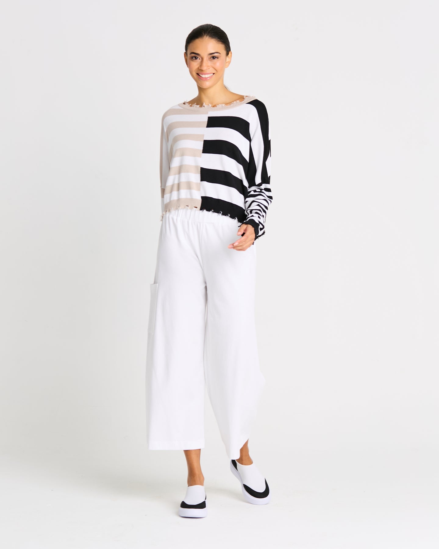 Soft, sophisticated, and just a little bit fun—this Pima cotton sweater brings effortless style to your everyday rotation. The mixed stripe pattern adds visual interest while raw edges give it an intentionally undone vibe that feels fresh and modern. Crafted from premium Pima cotton, it's breathable enough for layering and cozy enough to wear solo. Perfect for those moments when you want to look put-together without trying too hard.