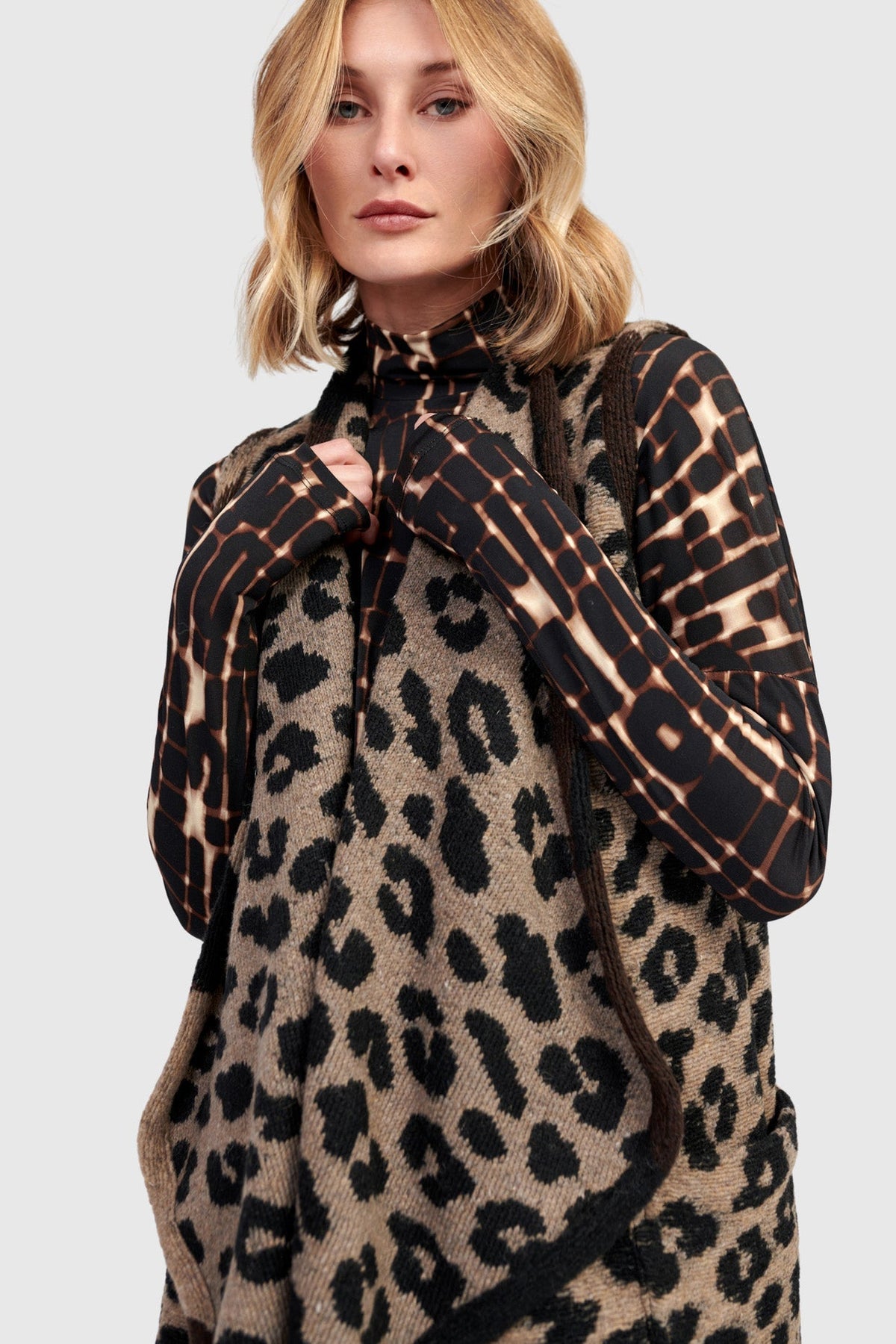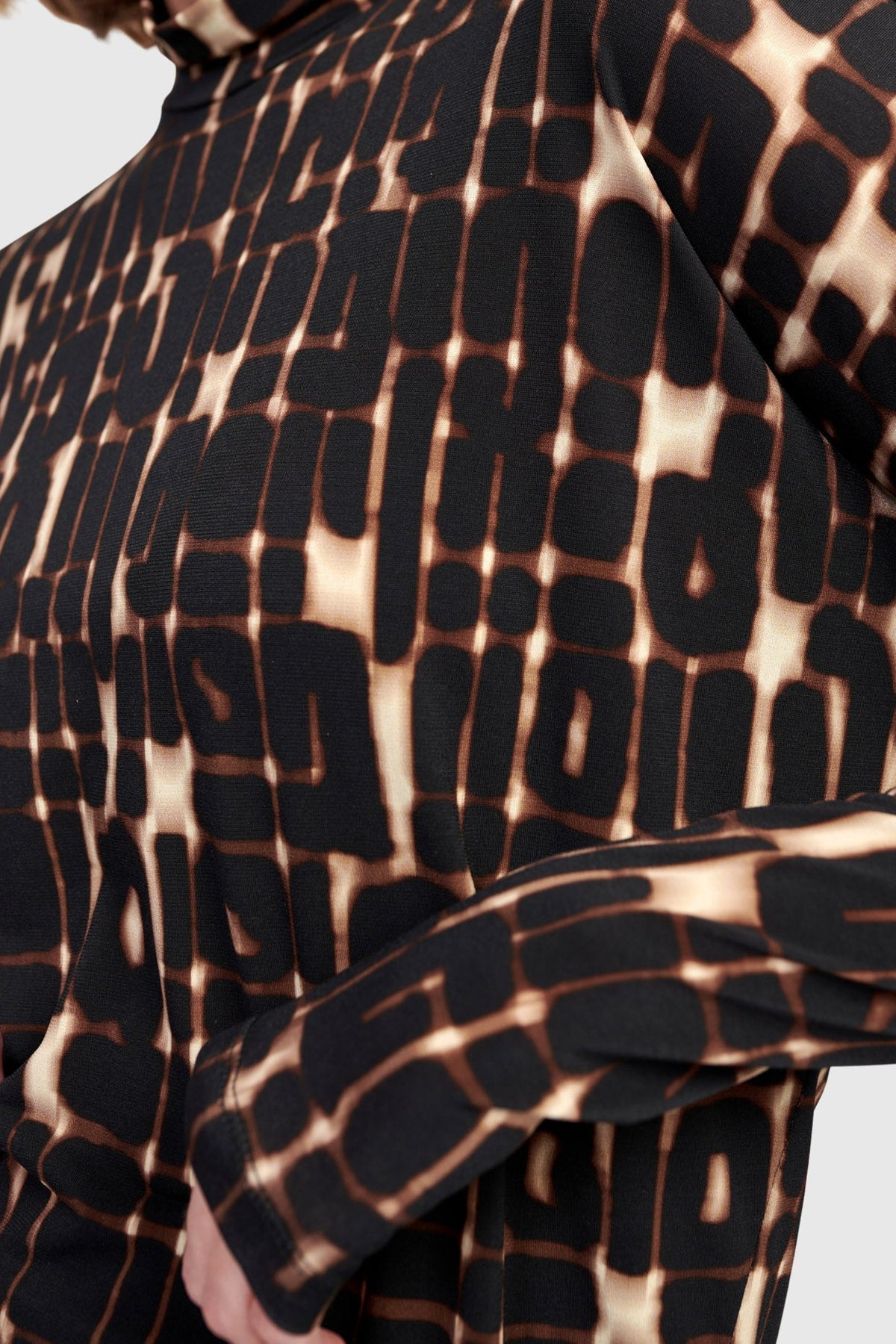 Designed to be tucked, scrunched, or left loose, this mockneck top adapts to how you move. The boxy tunic silhouette is balanced by slim lower sleeves for a flattering line, while the printed stretch knit offers softness and flexibility. Ideal for layering or on its own with statement trousers.