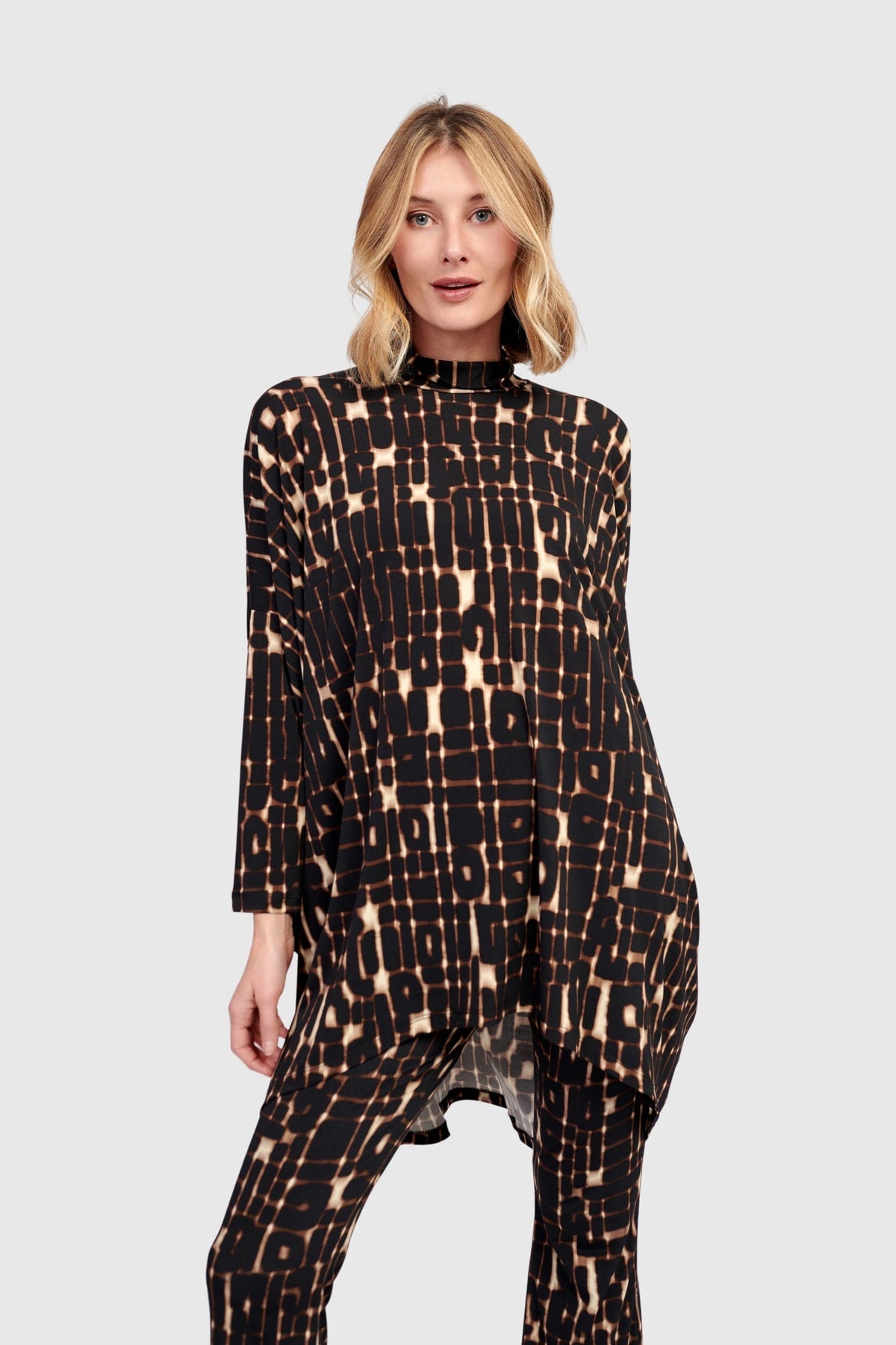 Soft and sculptural, this oversized tunic top flows from a mock neck into a swingy, rounded hem. The matte jersey offers gentle stretch and drapes beautifully under the arms for ease in motion. A true comfort piece with elevated shape.