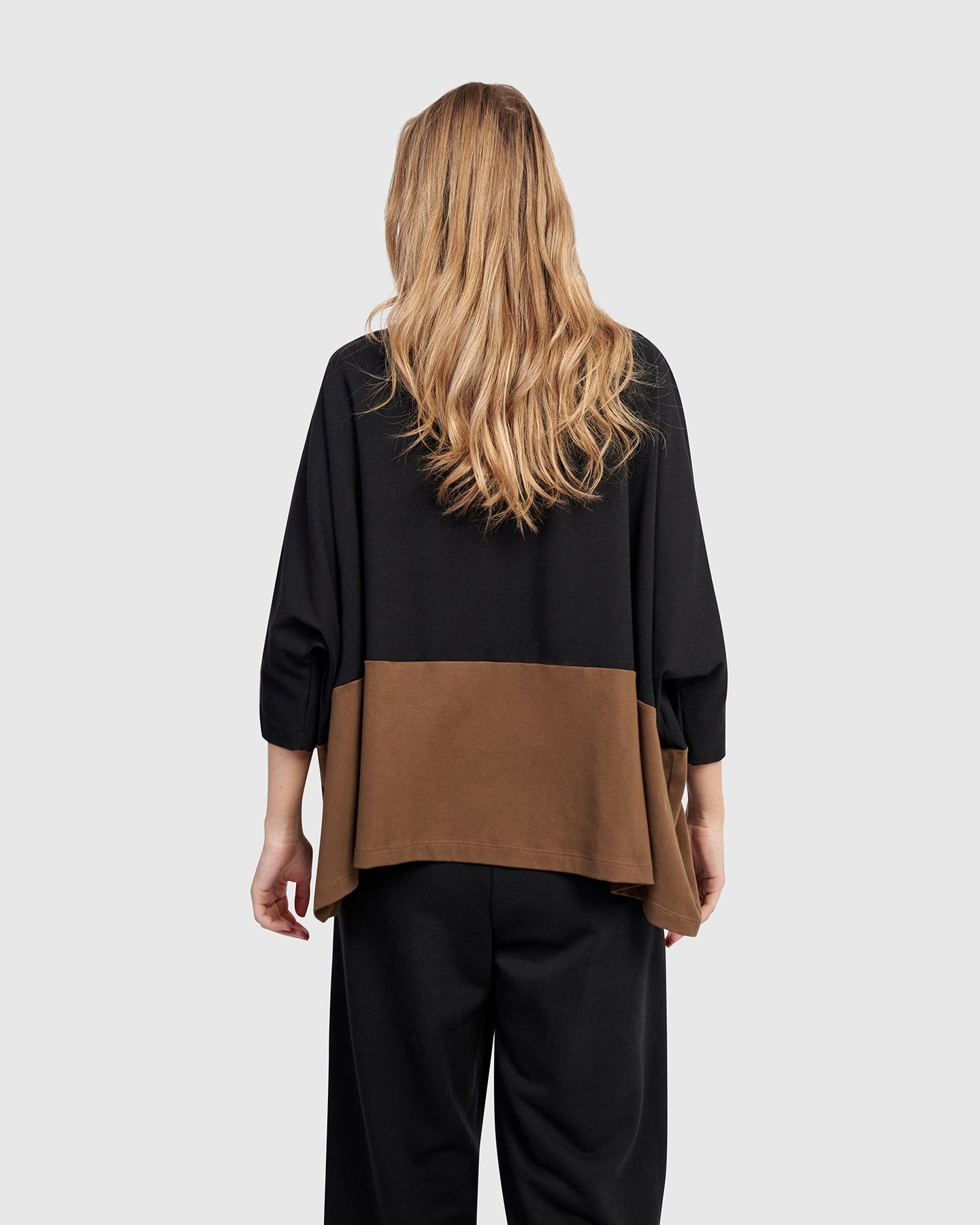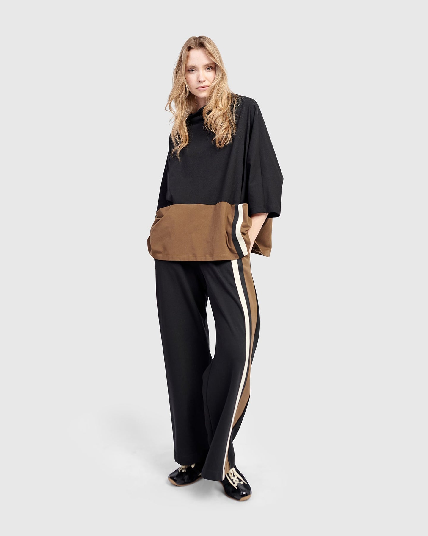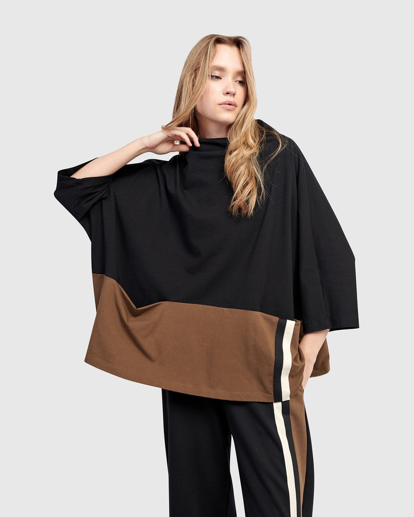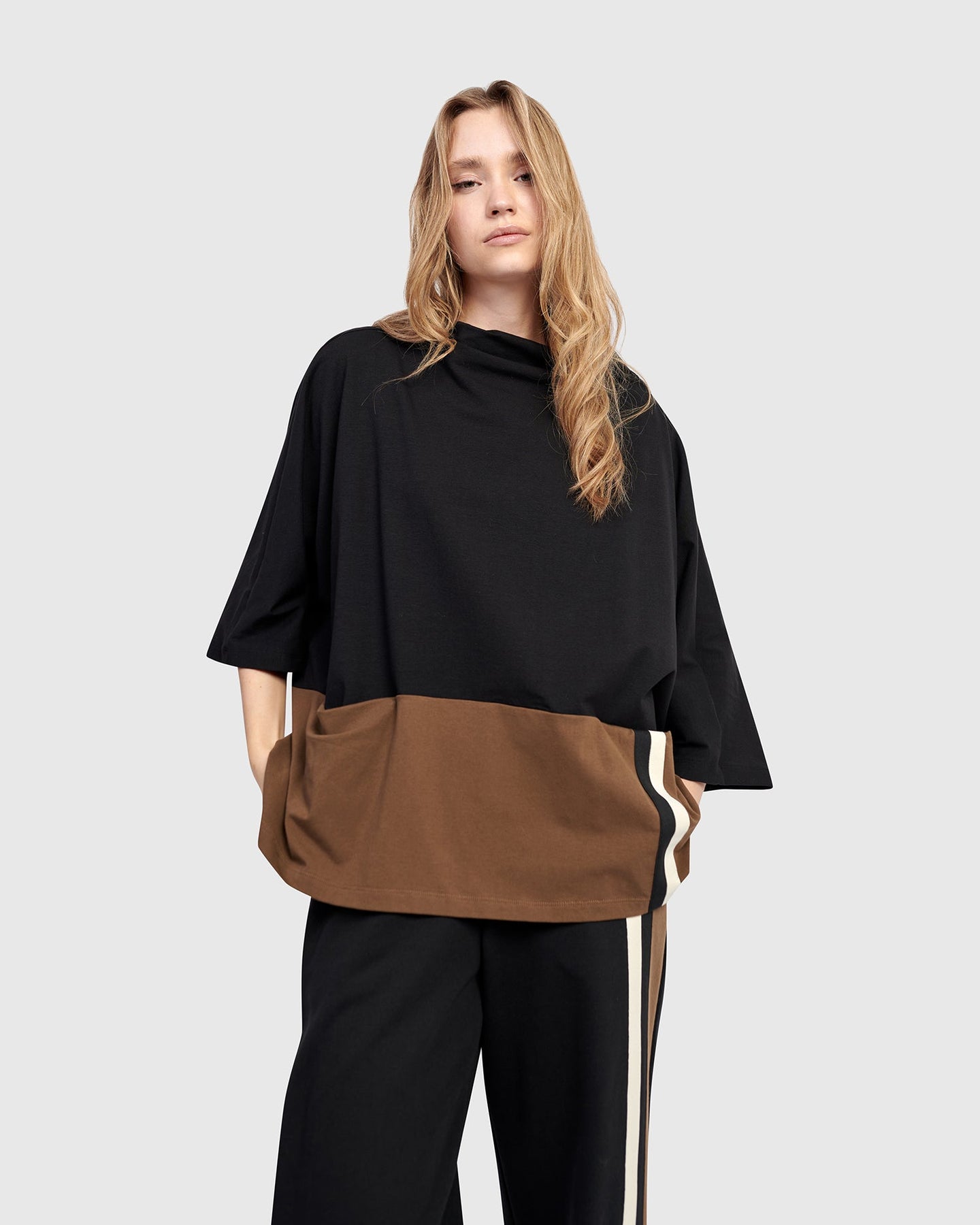 With bold colorblocking and sporty detail, this boxy jersey top makes a confident statement. Designed with a structured funnel neck and roomy 3/4 dolman sleeves, it features welted pockets and a dynamic racing stripe for unexpected polish. Crafted from substantial stretch cotton for a clean yet flexible fit.