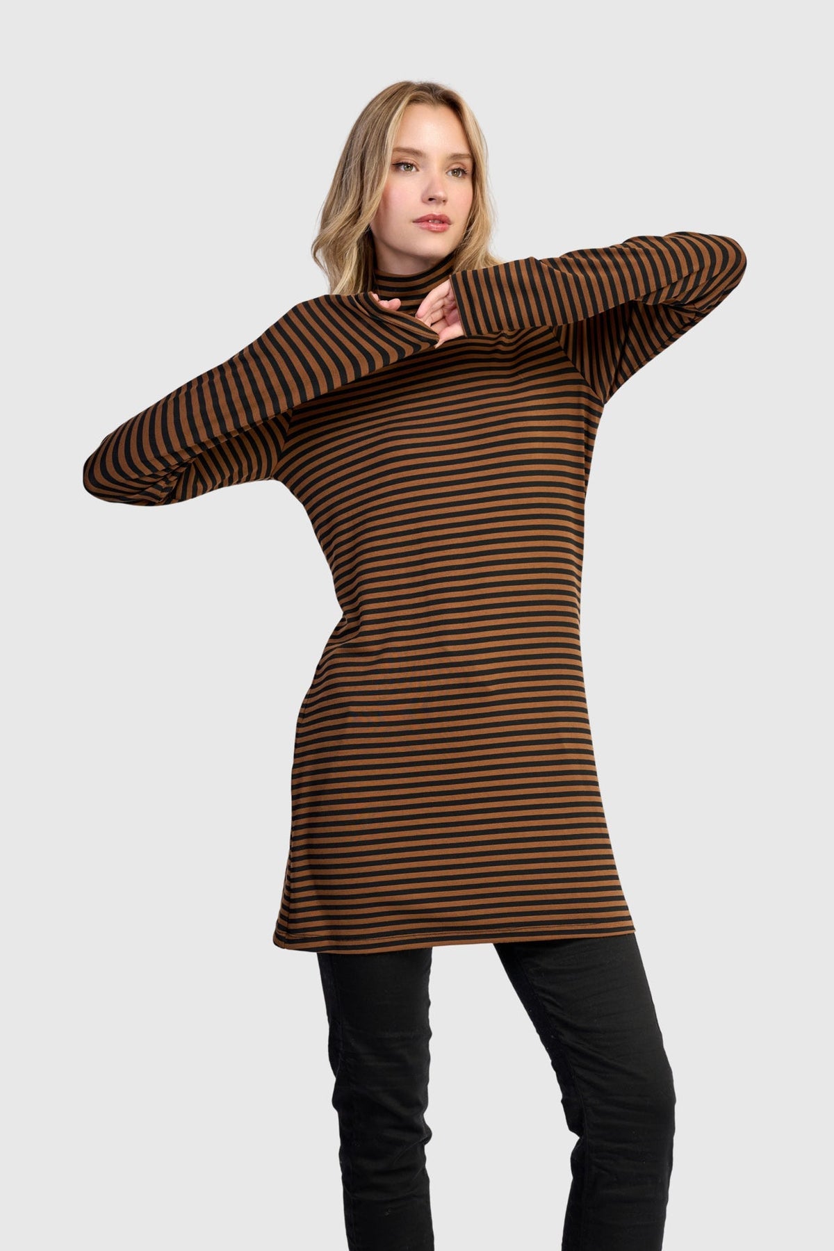 A versatile essential with subtle texture, this tunic-length turtleneck is cut for a relaxed yet polished silhouette. The foldover collar and extra-long sleeves provide cozy coverage, while soft viscose jersey lends stretch and drape. Its understated stripes make it ideal for layering or wearing solo as a minimalist statement.