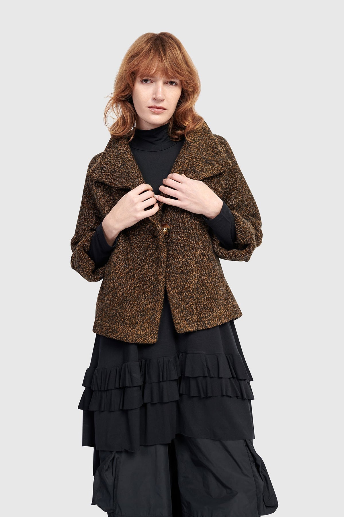 Effortlessly modern, this cropped jacket combines soft structure with smart design. The brushed knit fabric lends cozy texture, while a boxy A-line shape and raglan sleeves enhance its relaxed appeal. Oversized lapels and a single button closure elevate the finish. Layer it over dresses, knits, or trousers for an easy-chic statement.