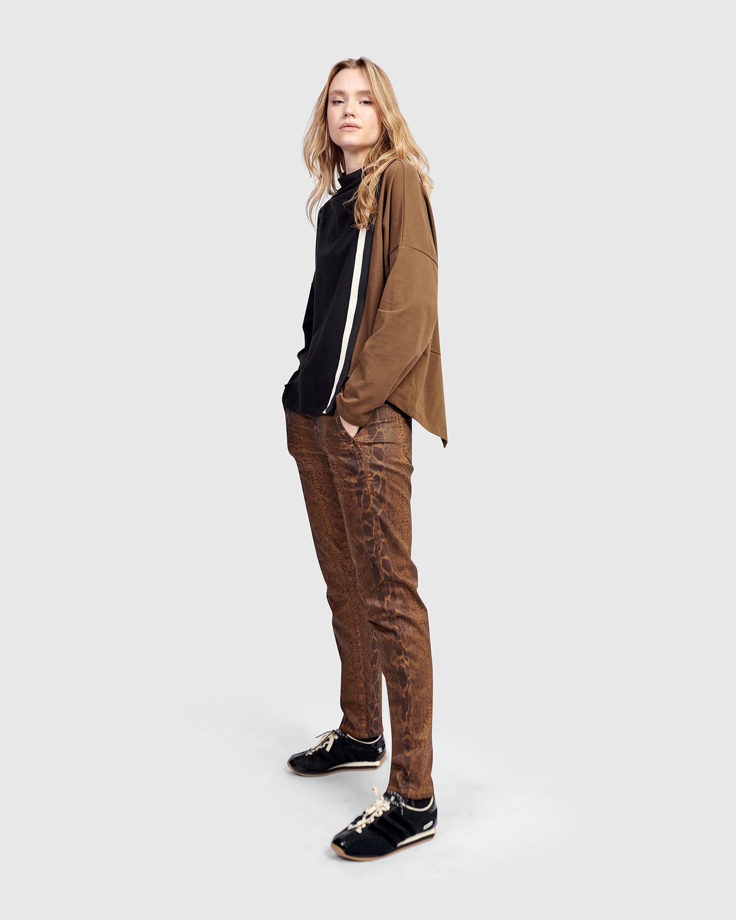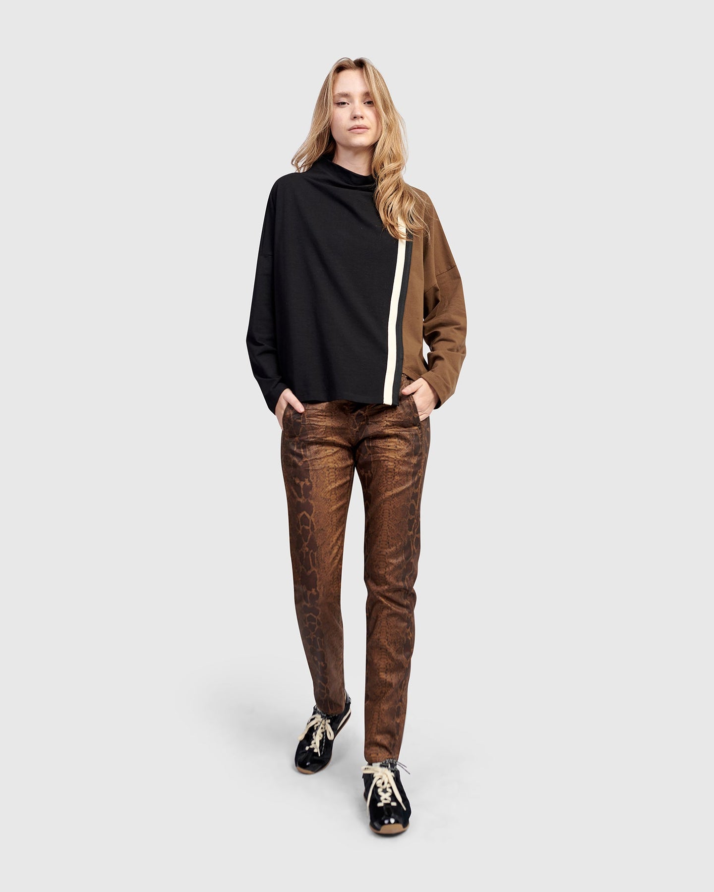 Sporty and streamlined, this funnel neck popover top features colorblocked panels and a modern racing stripe down one sleeve. The jersey knit is smooth and stretchy, and the asymmetric hemline adds polish. Wear it layered over slim pants or contrast it with voluminous skirts.