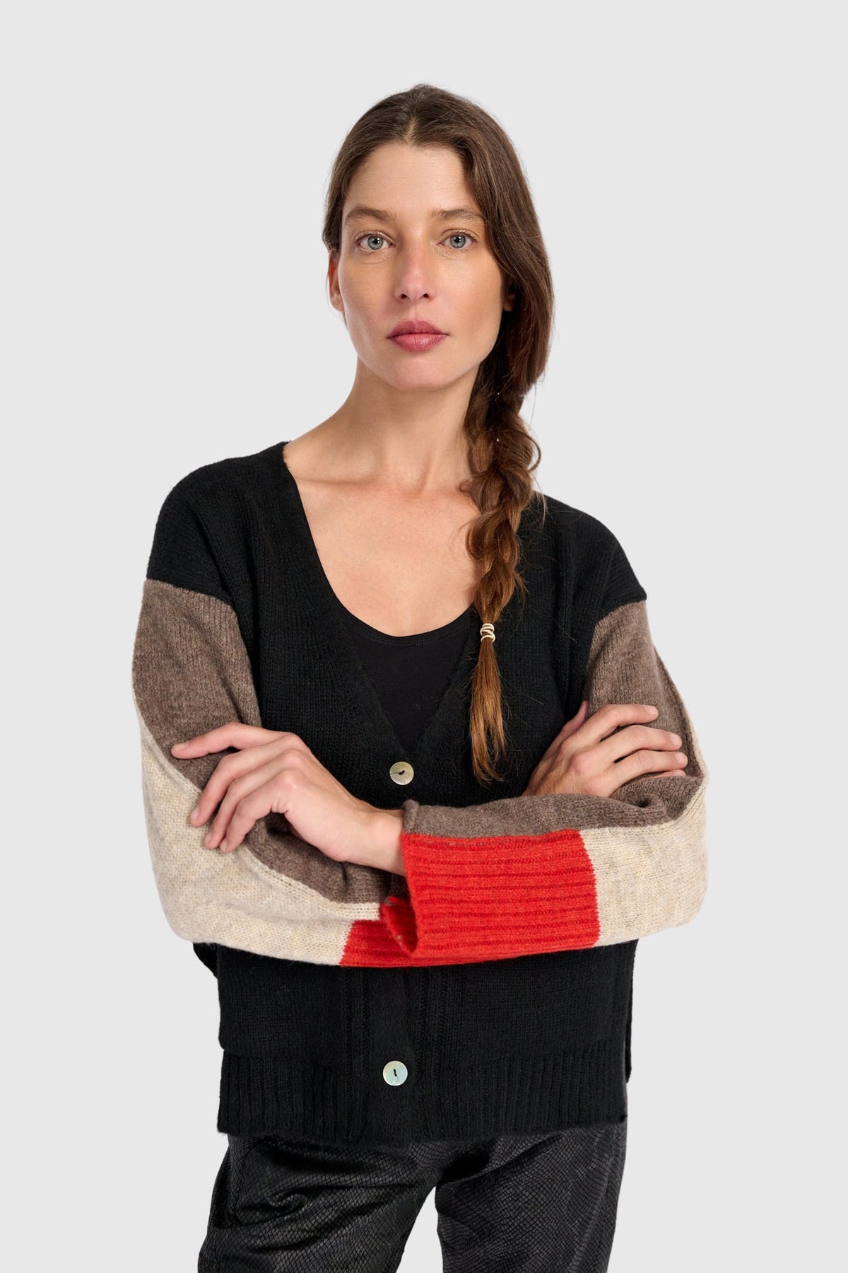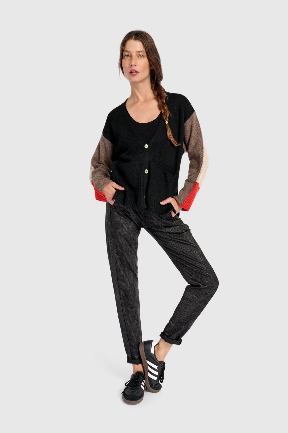Contrast Sleeve Cardigan in Black, Brown, Red, Mix