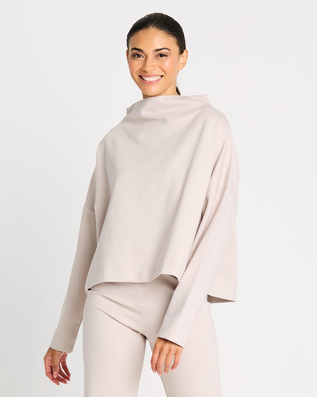 A modern essential designed with sculptural ease. This Scuba Audrey Tee is crafted from structured yet breathable scuba fabric that offers a smooth, contoured fit with comfortable stretch. The softly draped mock turtleneck adds architectural interest, while the cropped silhouette delivers a confident, contemporary edge.