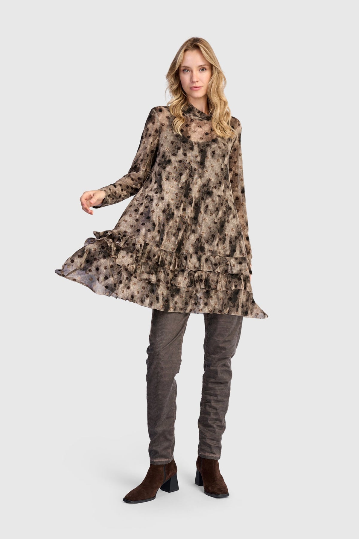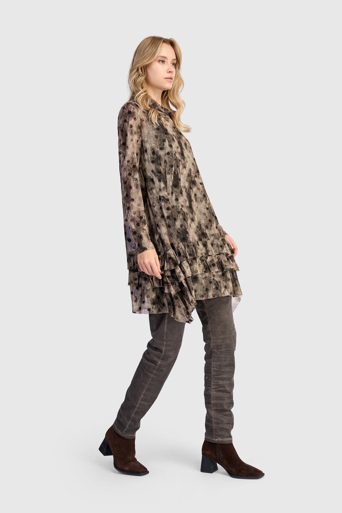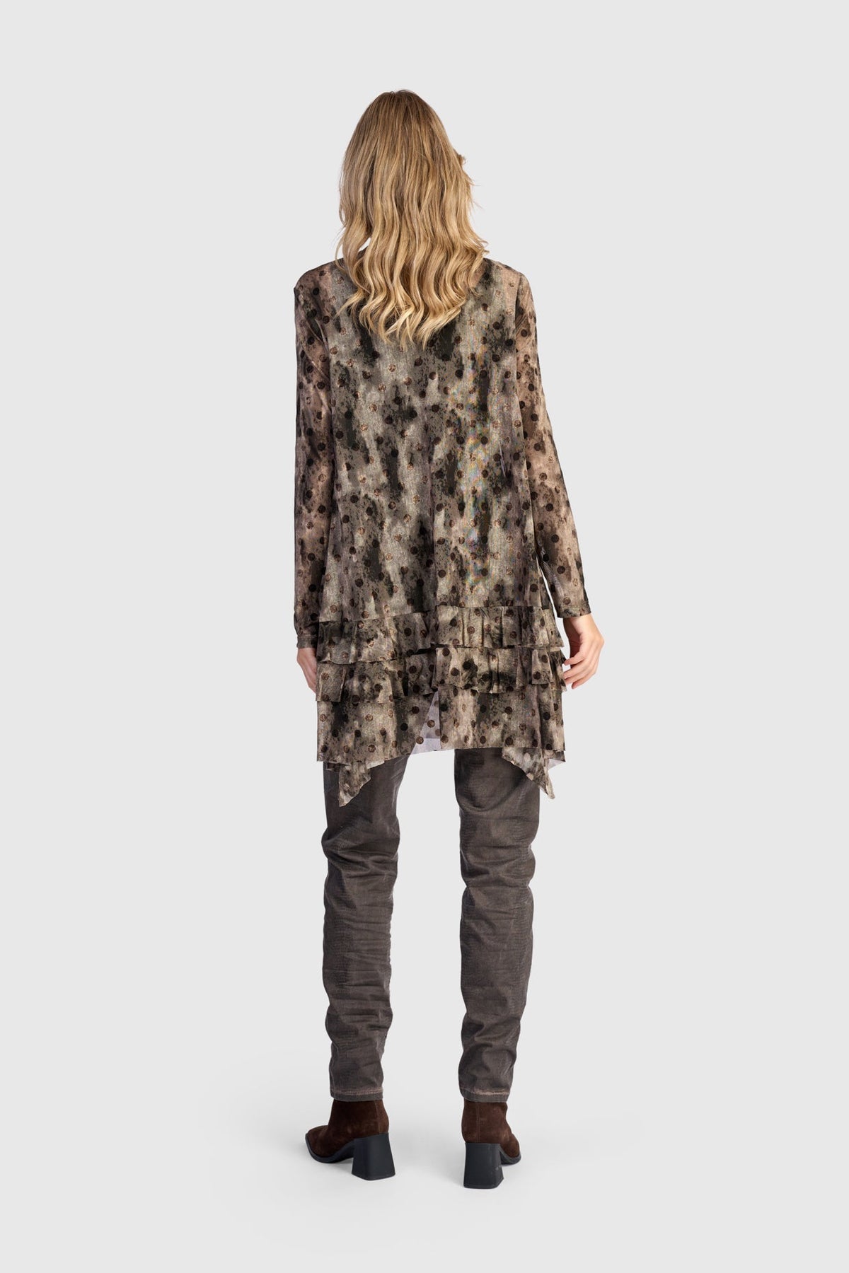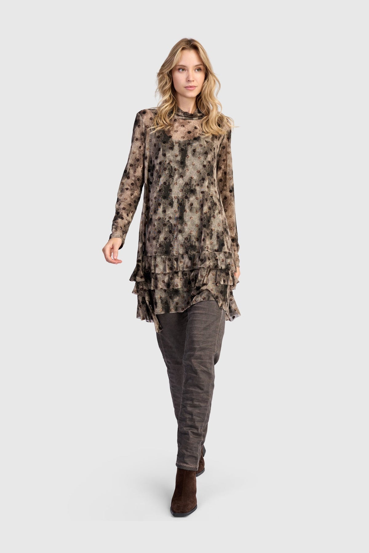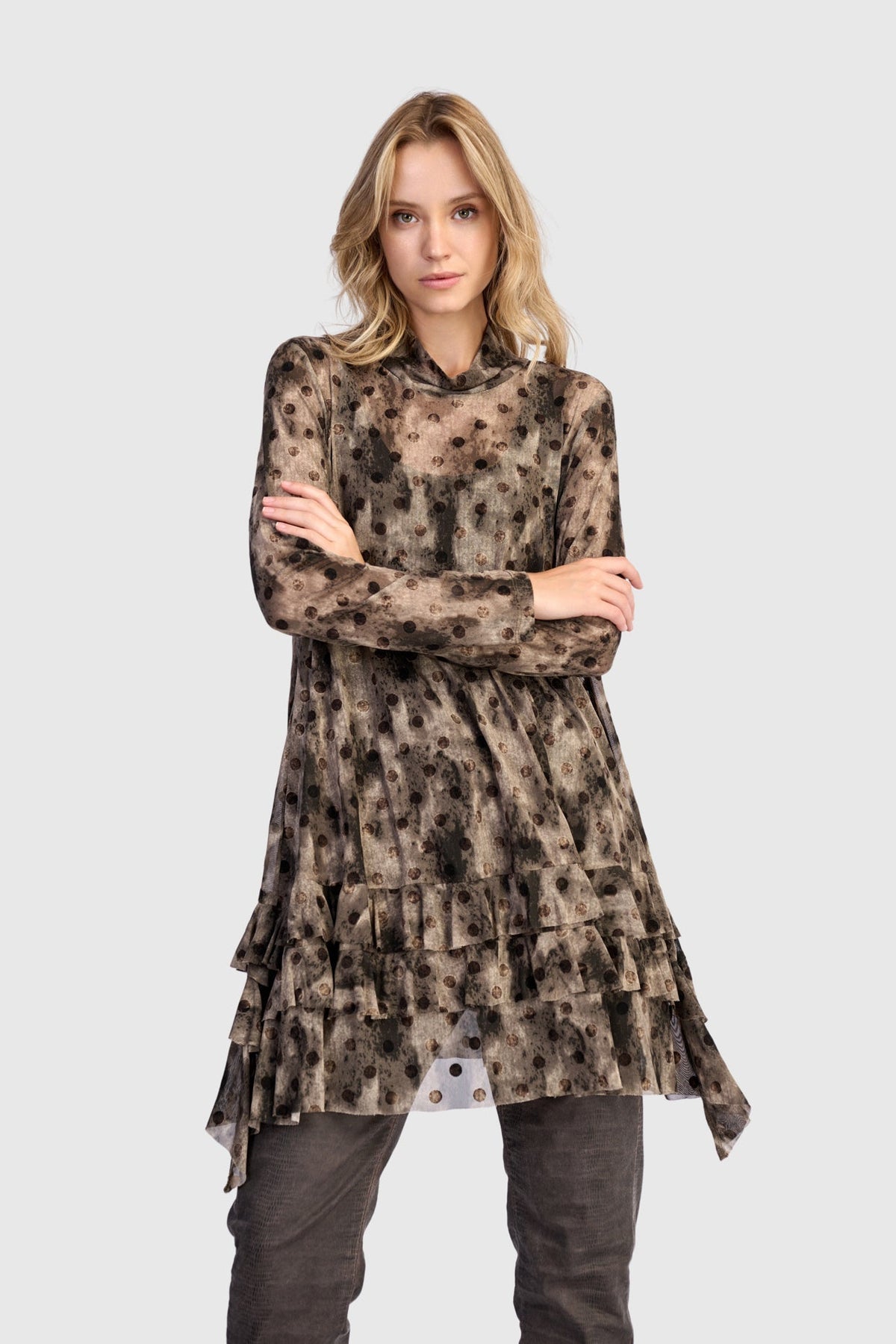 This swingy mesh tunic brings volume and softness to the spotlight. Tiered raw-edge ruffles cascade below a draped mock neck, creating depth without weight. A playful yet polished piece, complete with a coordinating slip.