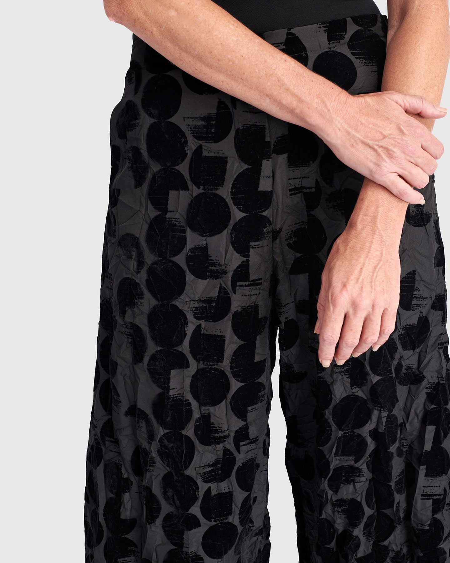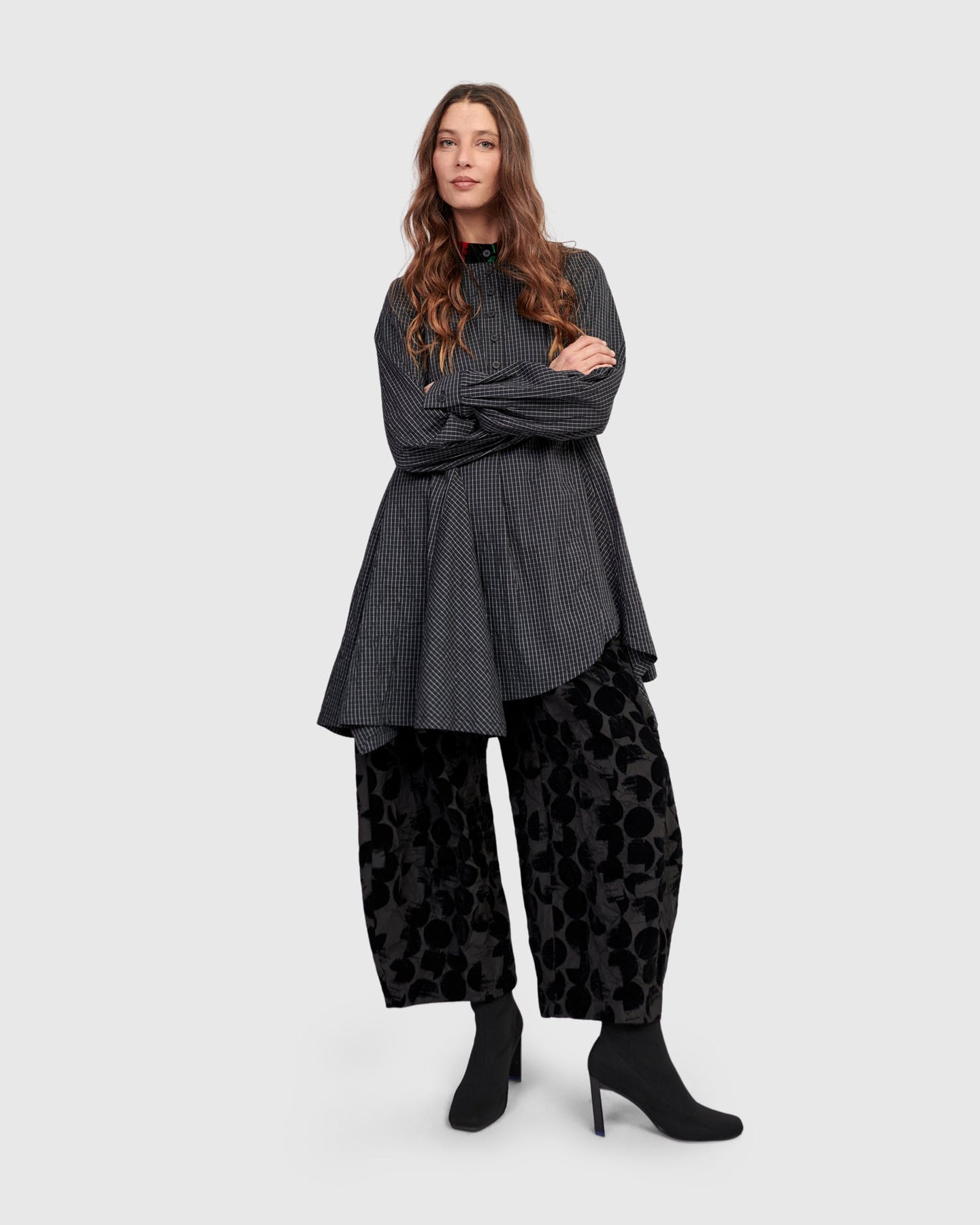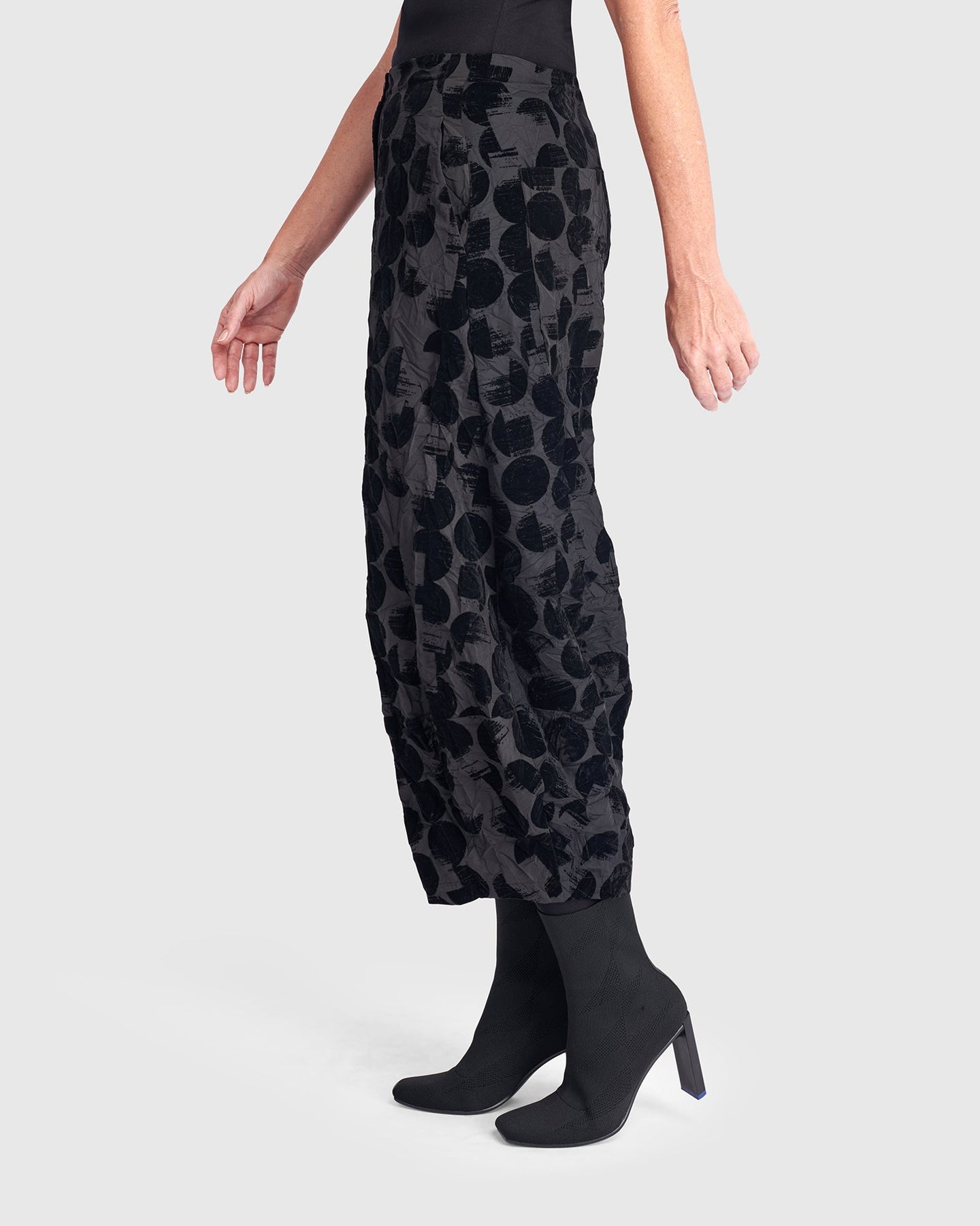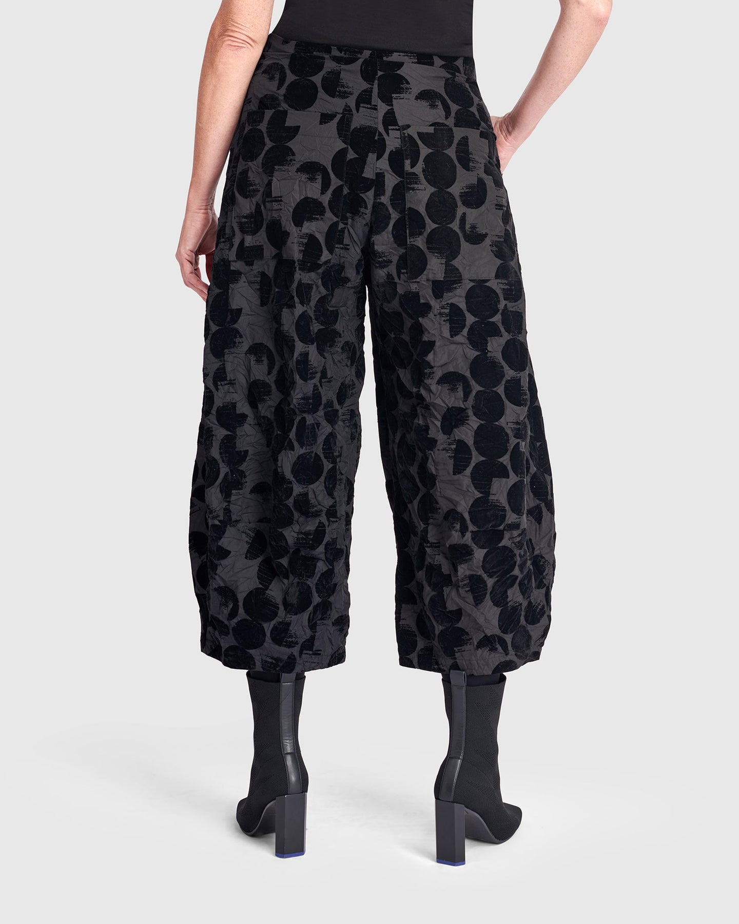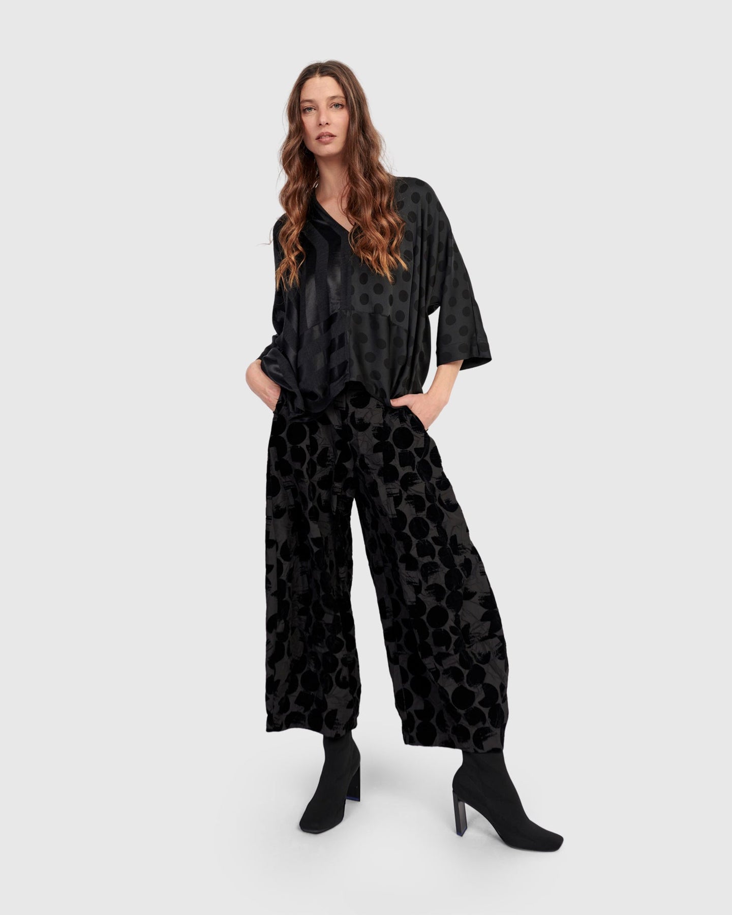 Cut in a modern barrel leg shape, these cropped trousers blend structure with whimsy. The velvet-dotted taffeta brings texture and light play, while a flexible waistband and generous pockets prioritize comfort. Their sculptural silhouette balances volume and ease, making them a go-to for day-to-dinner transitions.