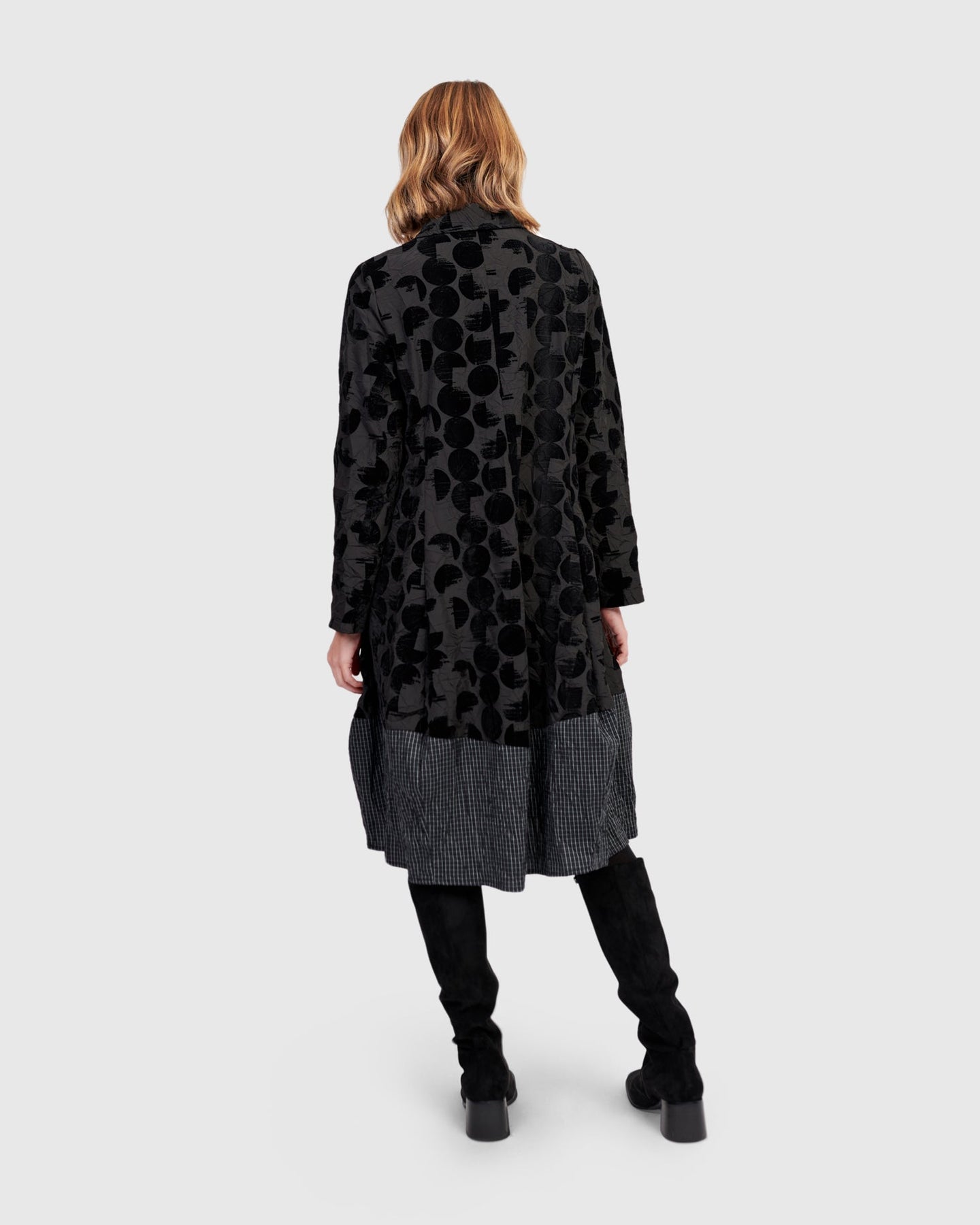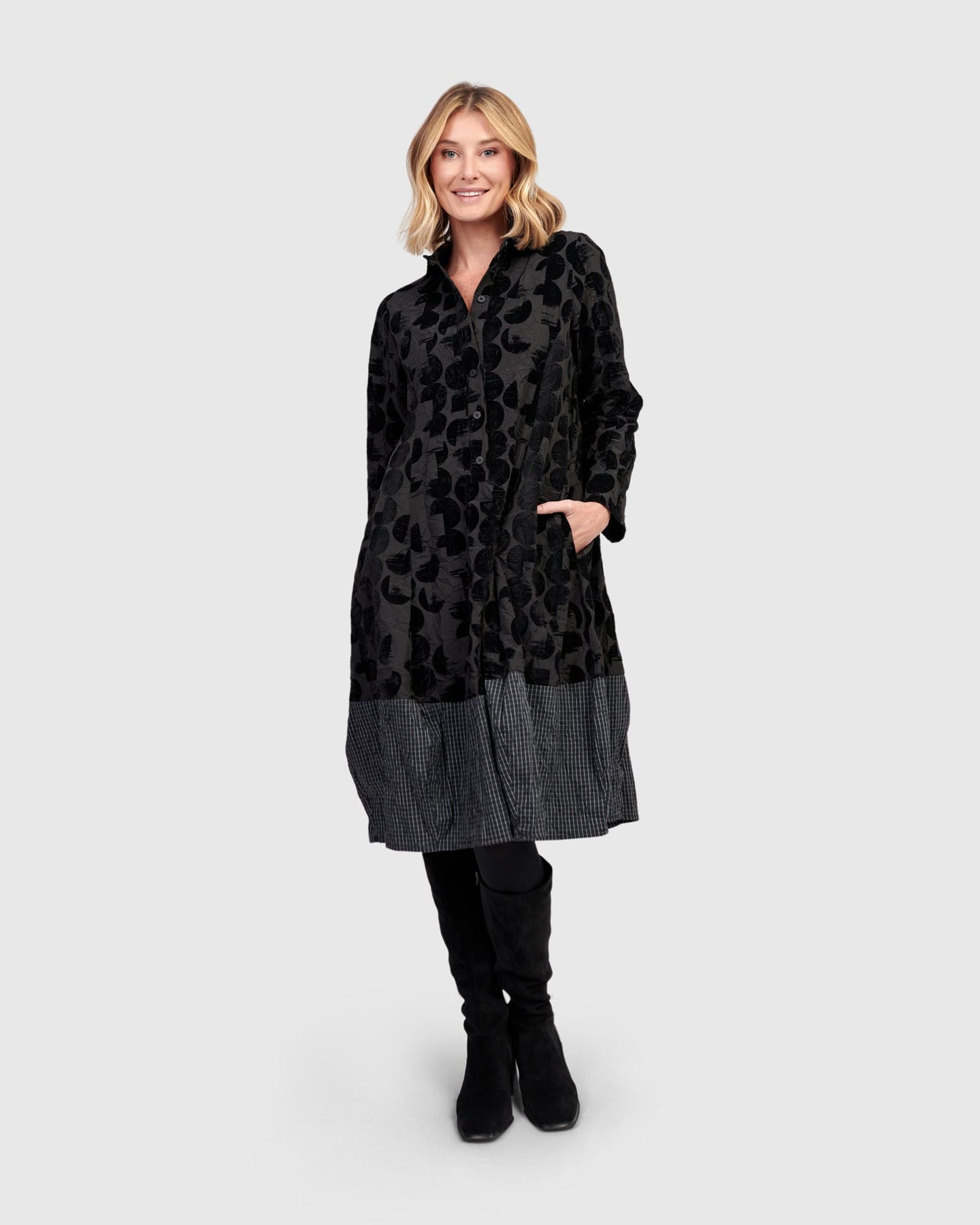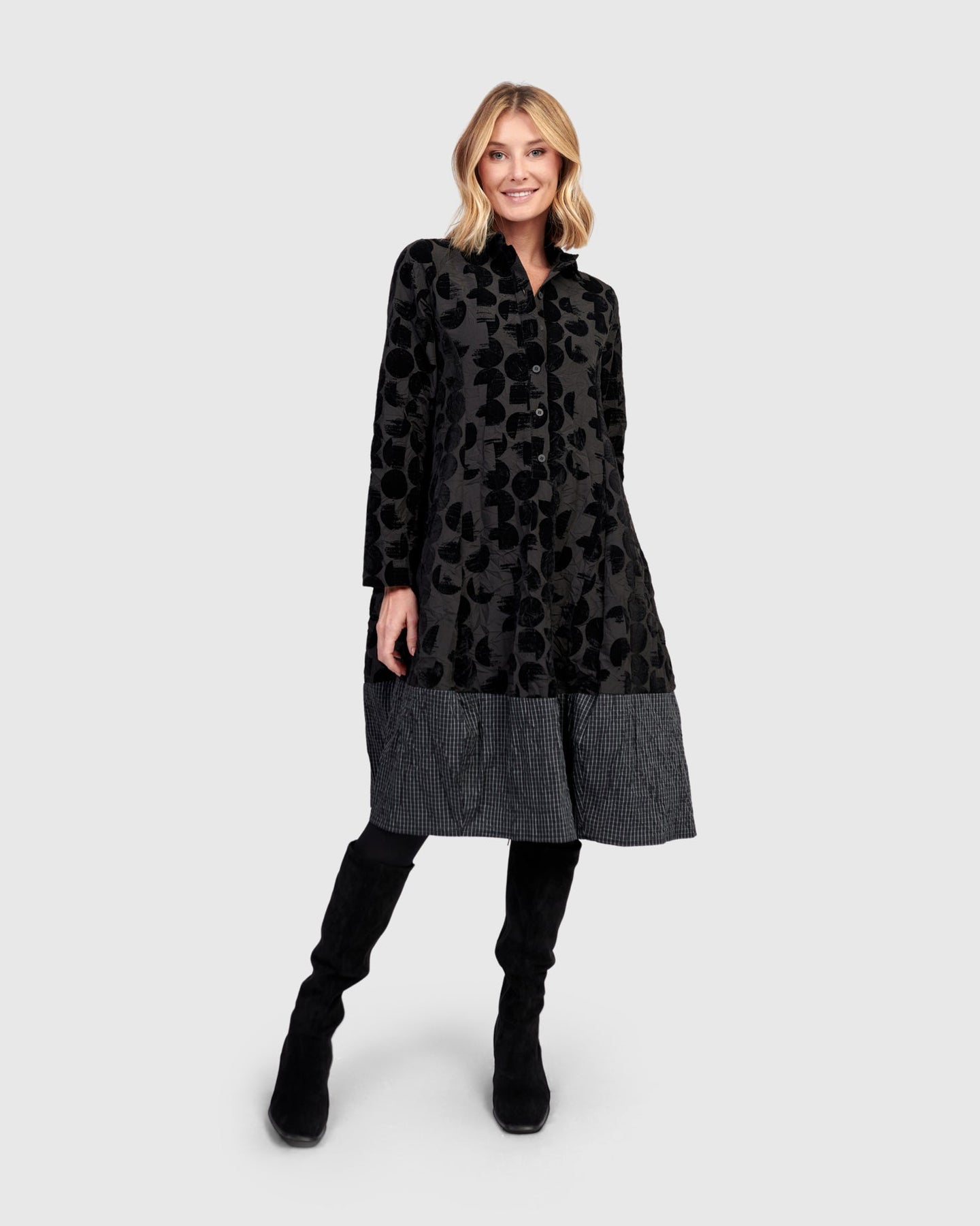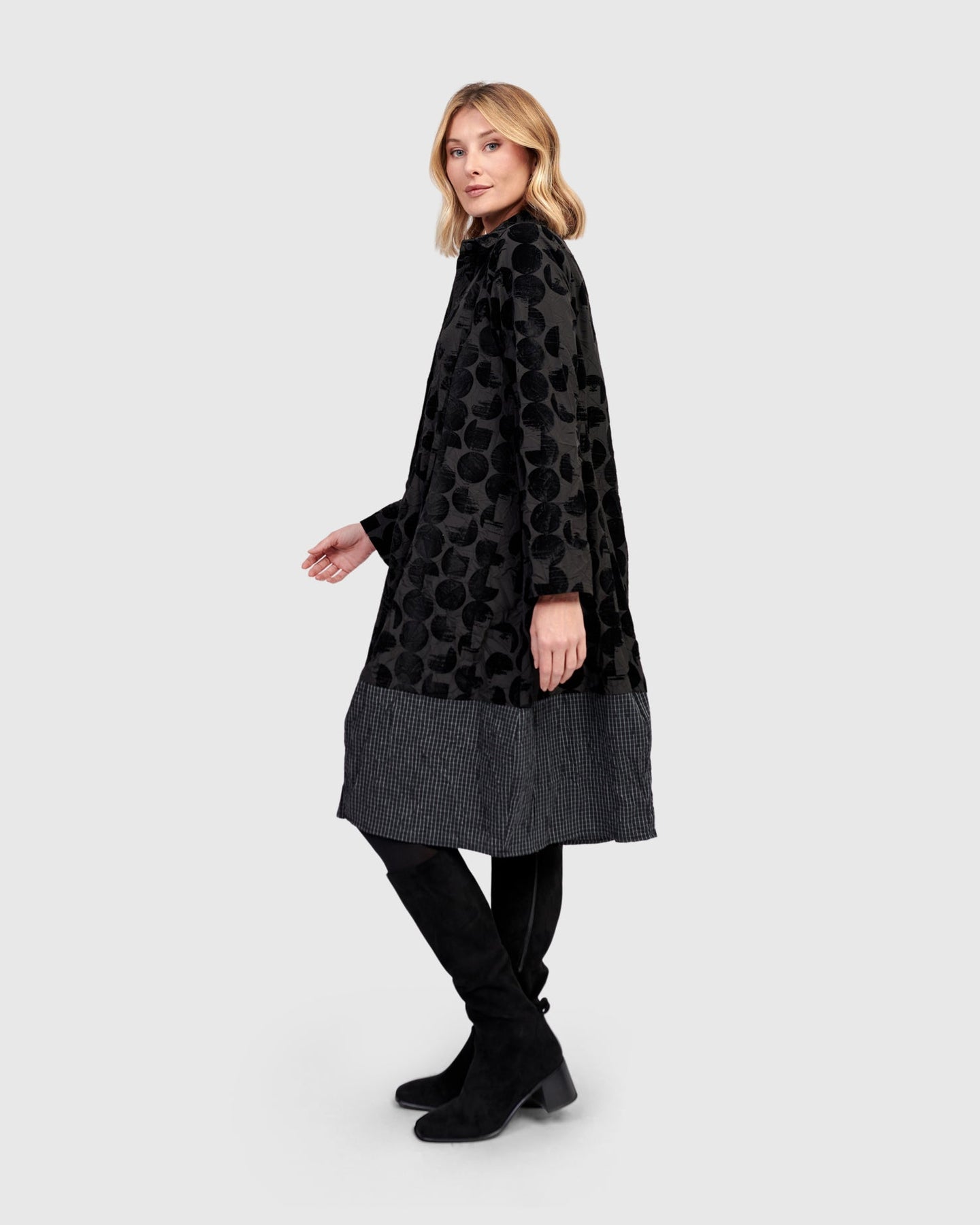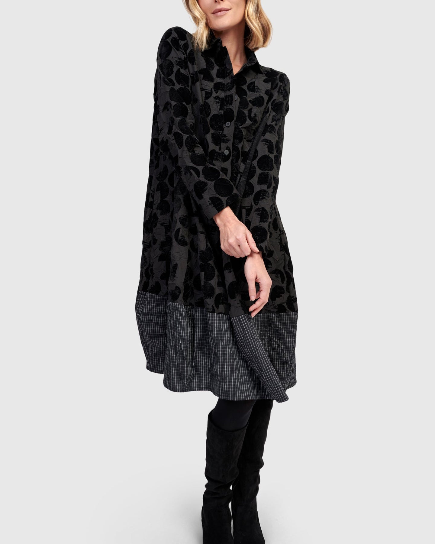 Designed for ease and elegance, this softly structured cocoon dress balances refined tailoring with a relaxed feel. Made from textured crinkled taffeta, it features velvet dot detailing and thoughtful shaping through the shoulder and bust. Finished with a foldover collar and hidden pockets.