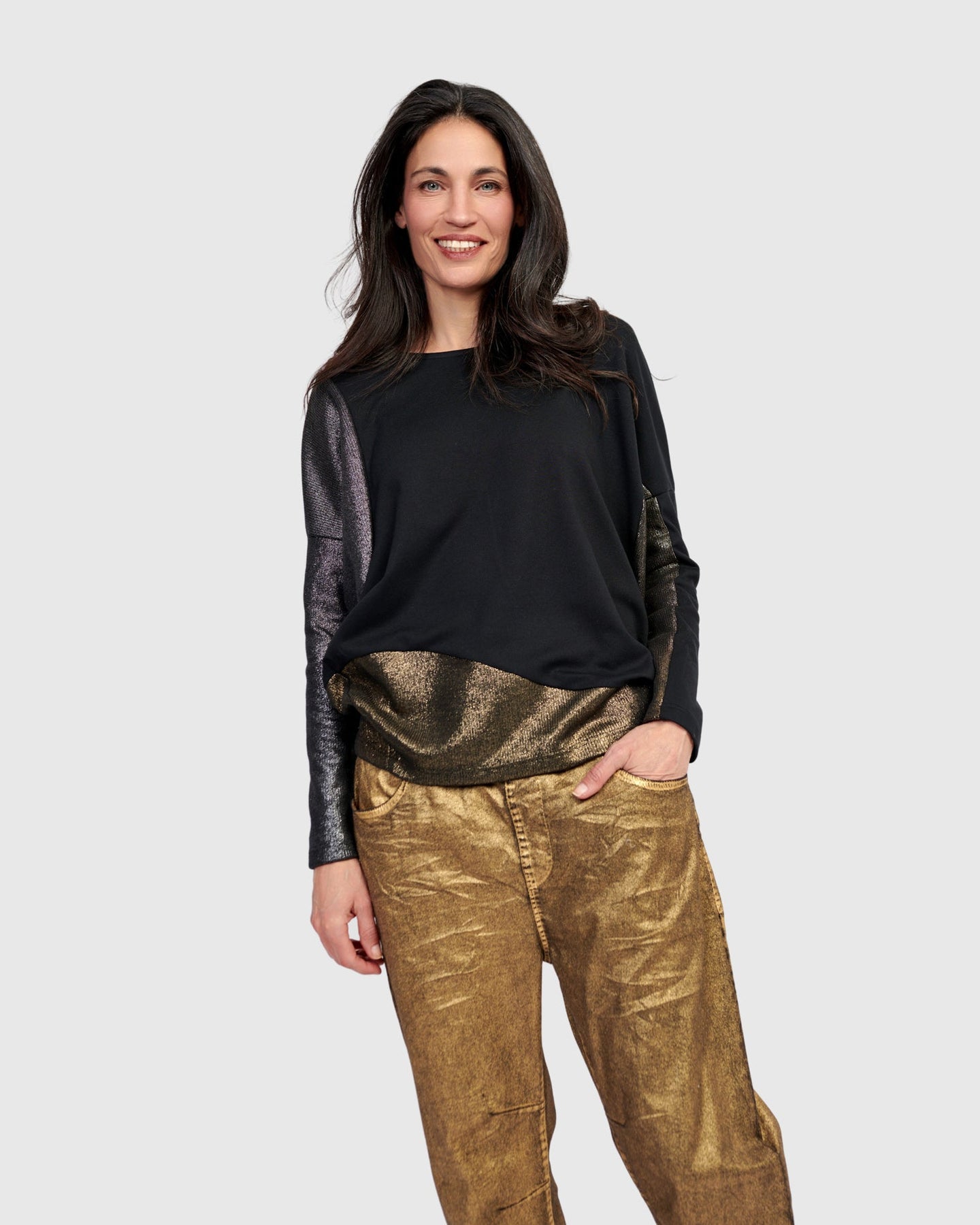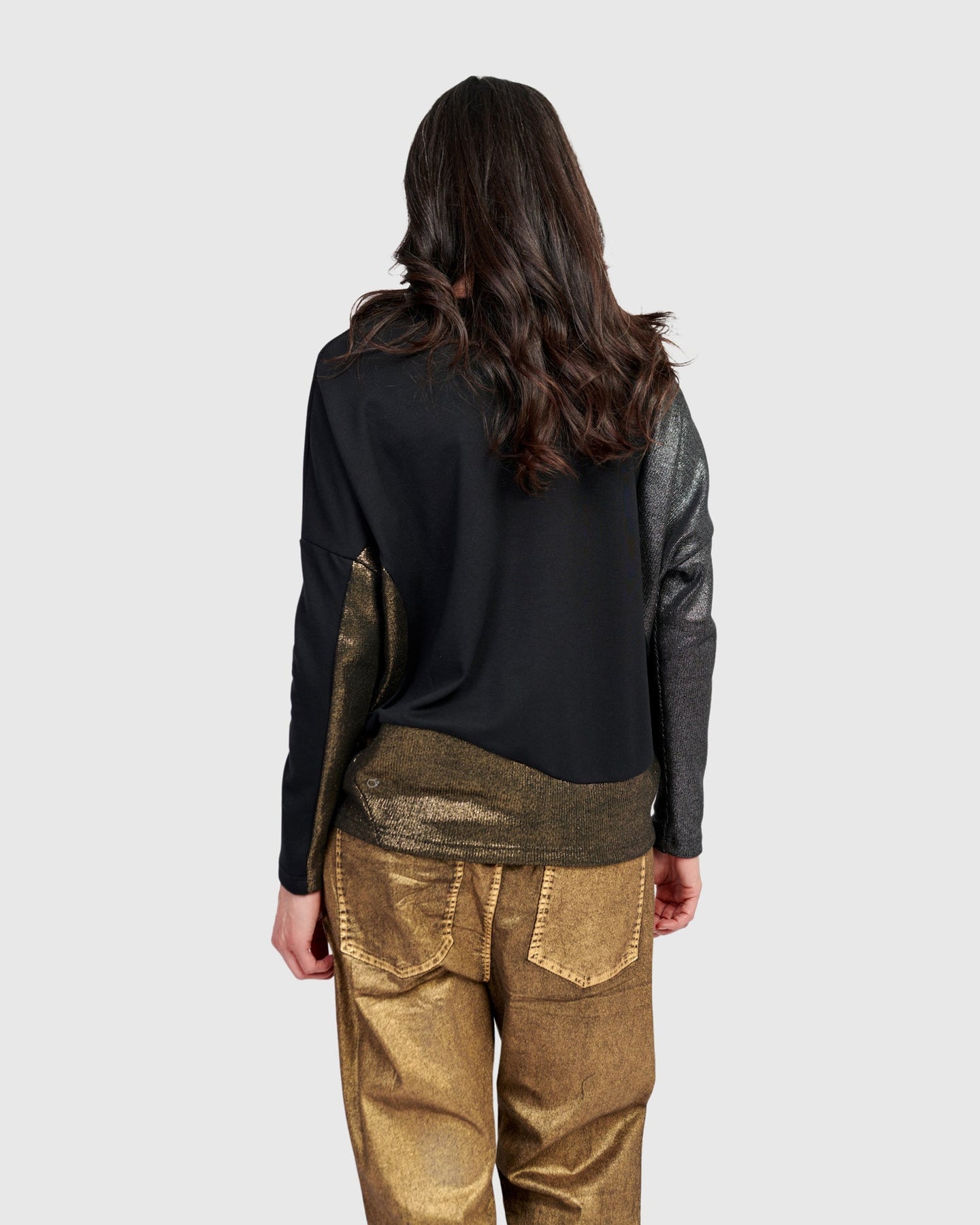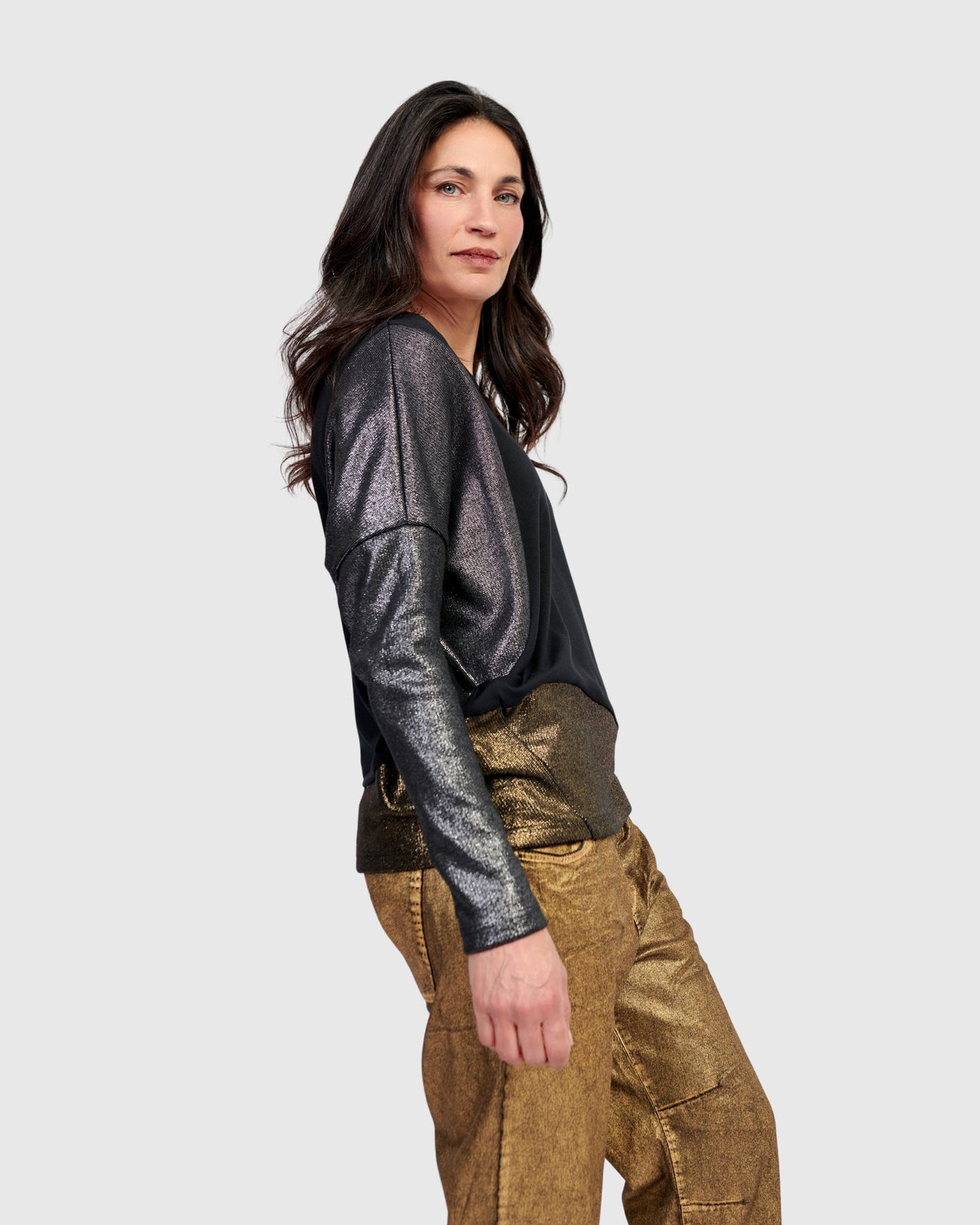 This glimmering jersey knit top blends softness with statement. Tapered at the hem for a gentle scrunch, it offers subtle shaping and shimmer in all the right places. Contrast sweater-knit sleeves elevate the everyday, making it ideal for dressing up denim or soft tailoring.