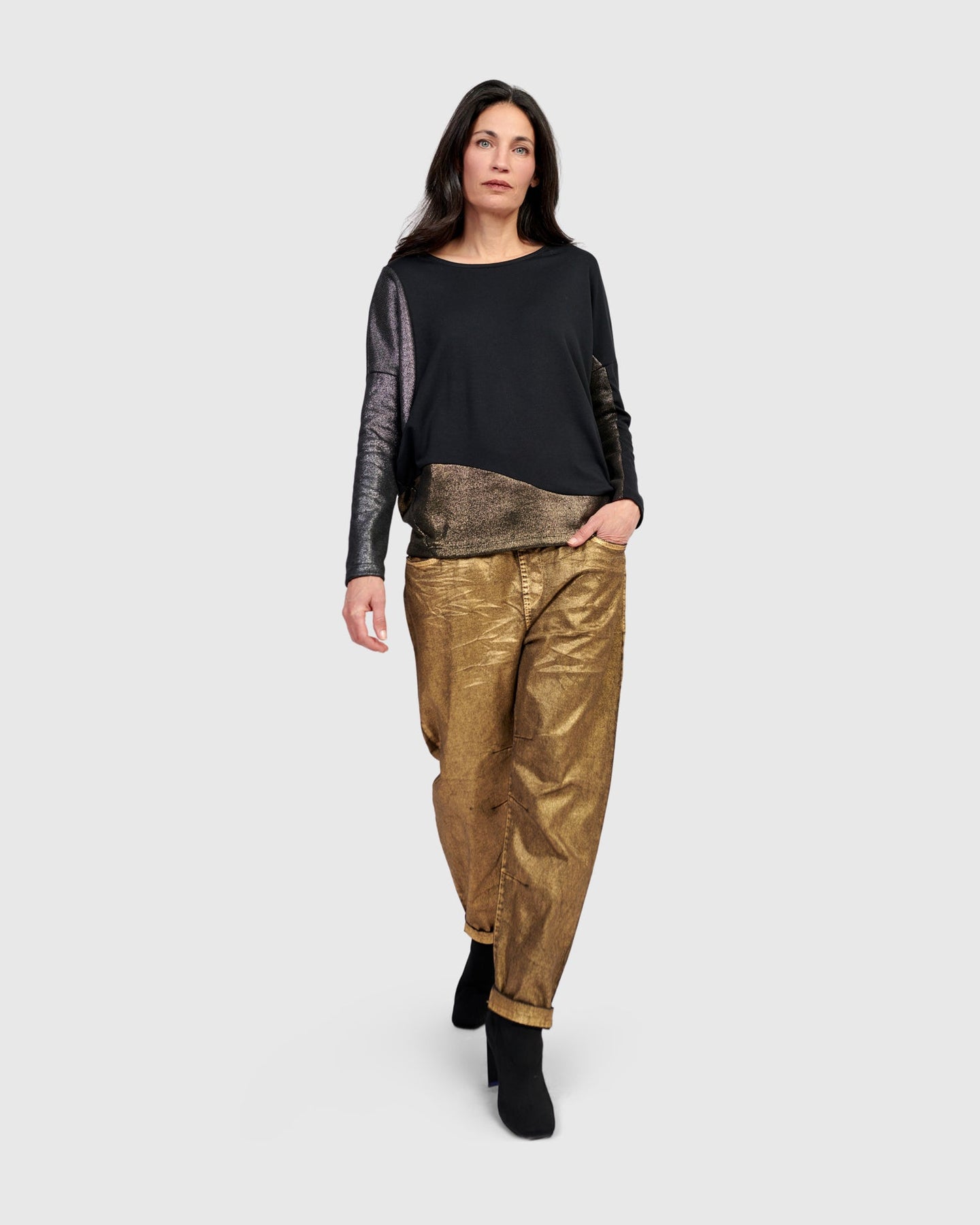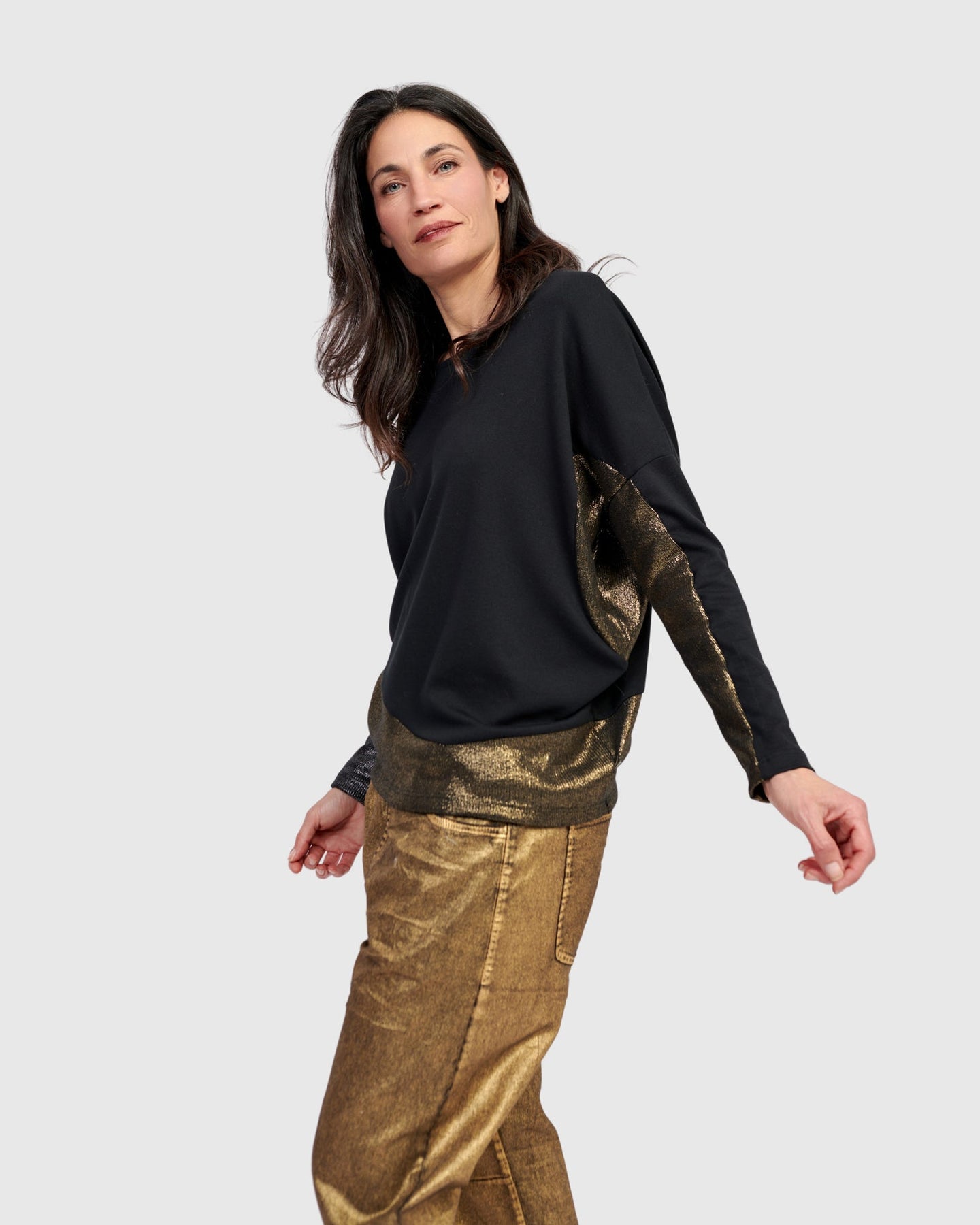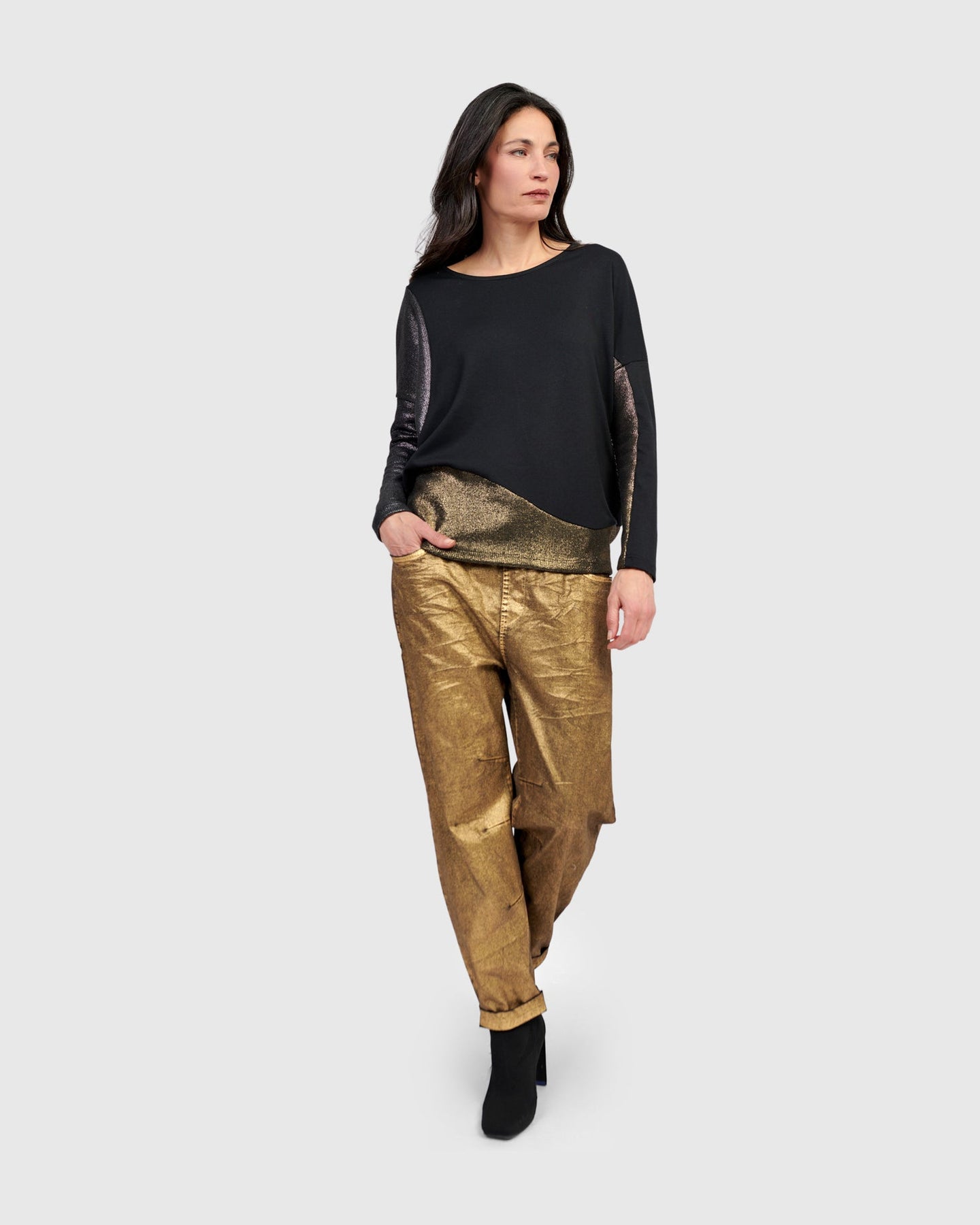 This glimmering jersey knit top blends softness with statement. Tapered at the hem for a gentle scrunch, it offers subtle shaping and shimmer in all the right places. Contrast sweater-knit sleeves elevate the everyday, making it ideal for dressing up denim or soft tailoring.