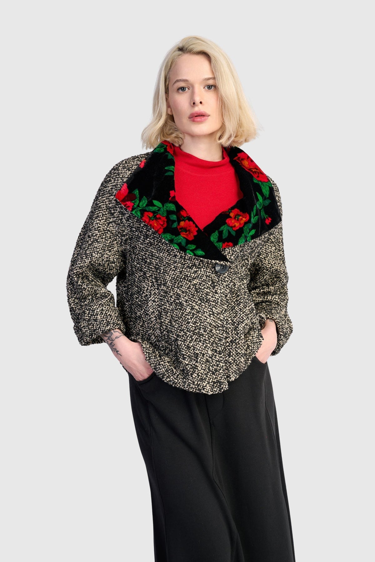 This cropped boucle jacket features velvet detailing and a relaxed boxy shape. The draped collar and dropped shoulder lend softness, while the 3/4 sleeve and single-button front keep it'sculptural and easy to wear.