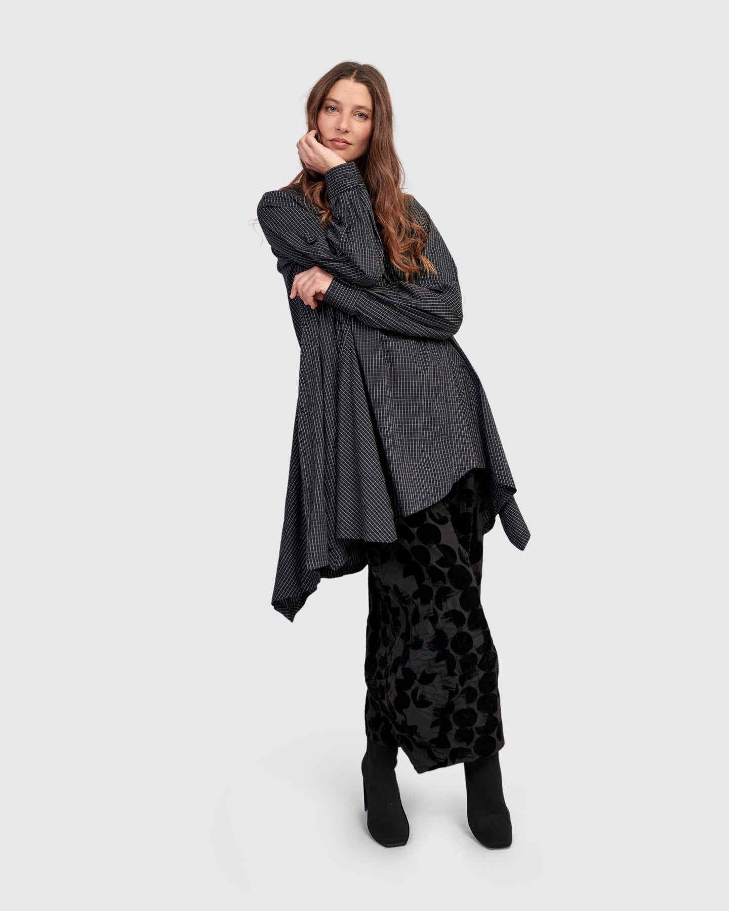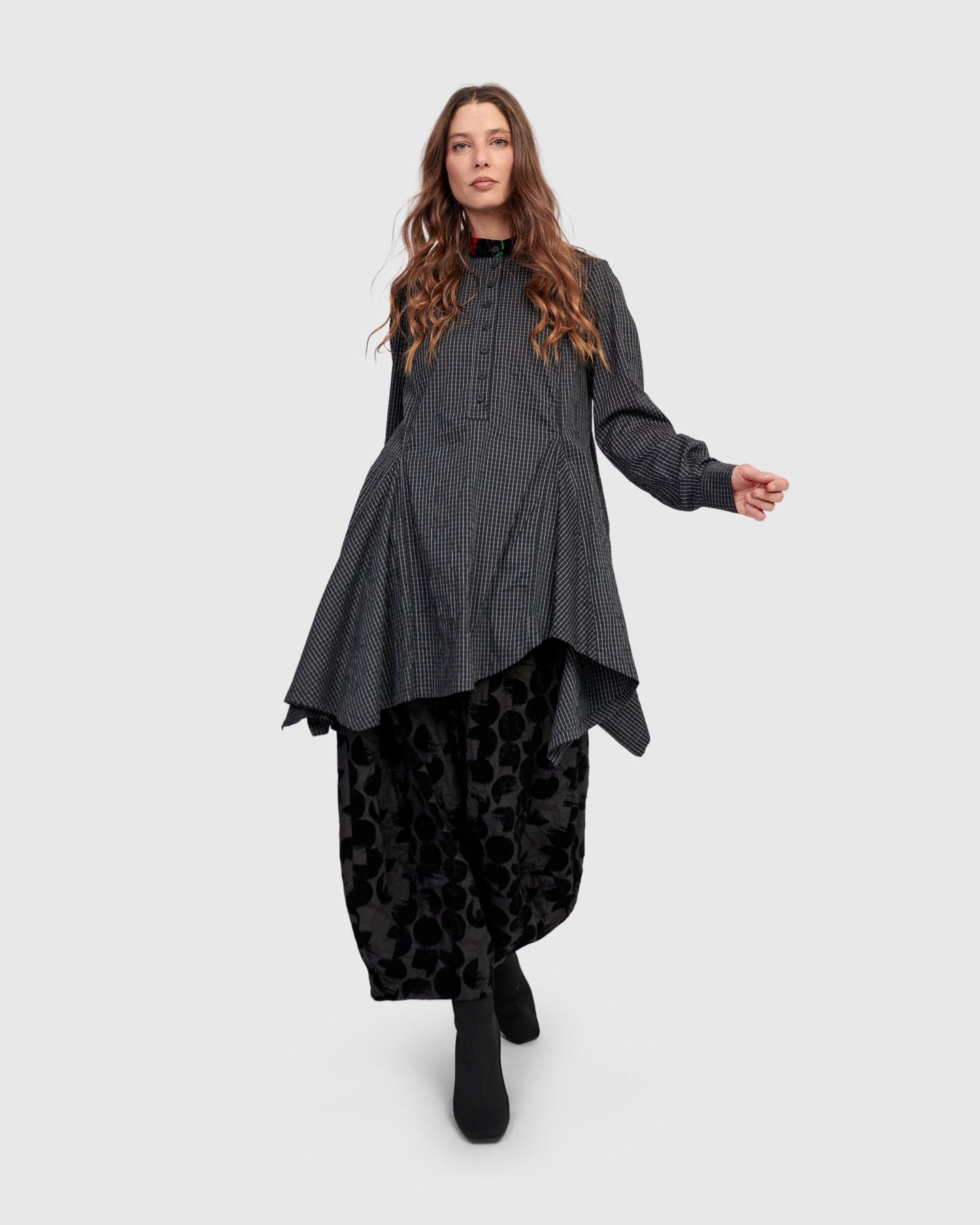Cut in a flattering A-line silhouette, this tunic-length shirt combines the structure of a woven top with the movement of a pieced, handkerchief-hem skirt. The soft crinkled fabric offers ease and texture, while the mandarin collar and partial placket elevate the look. A graceful option with jeans, pants, or leggings.