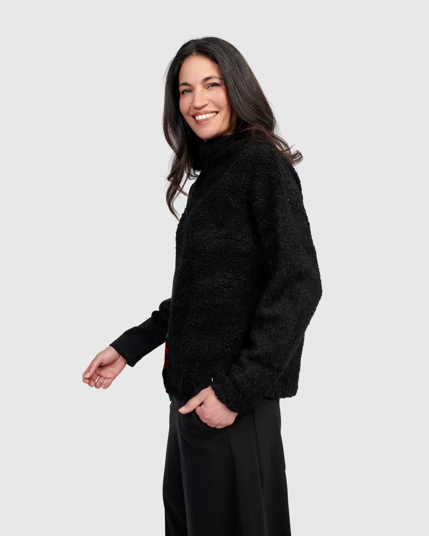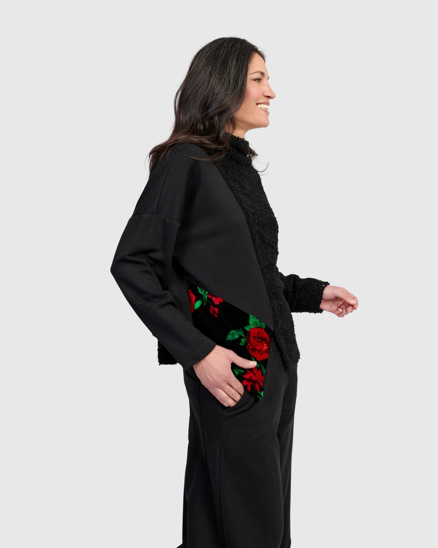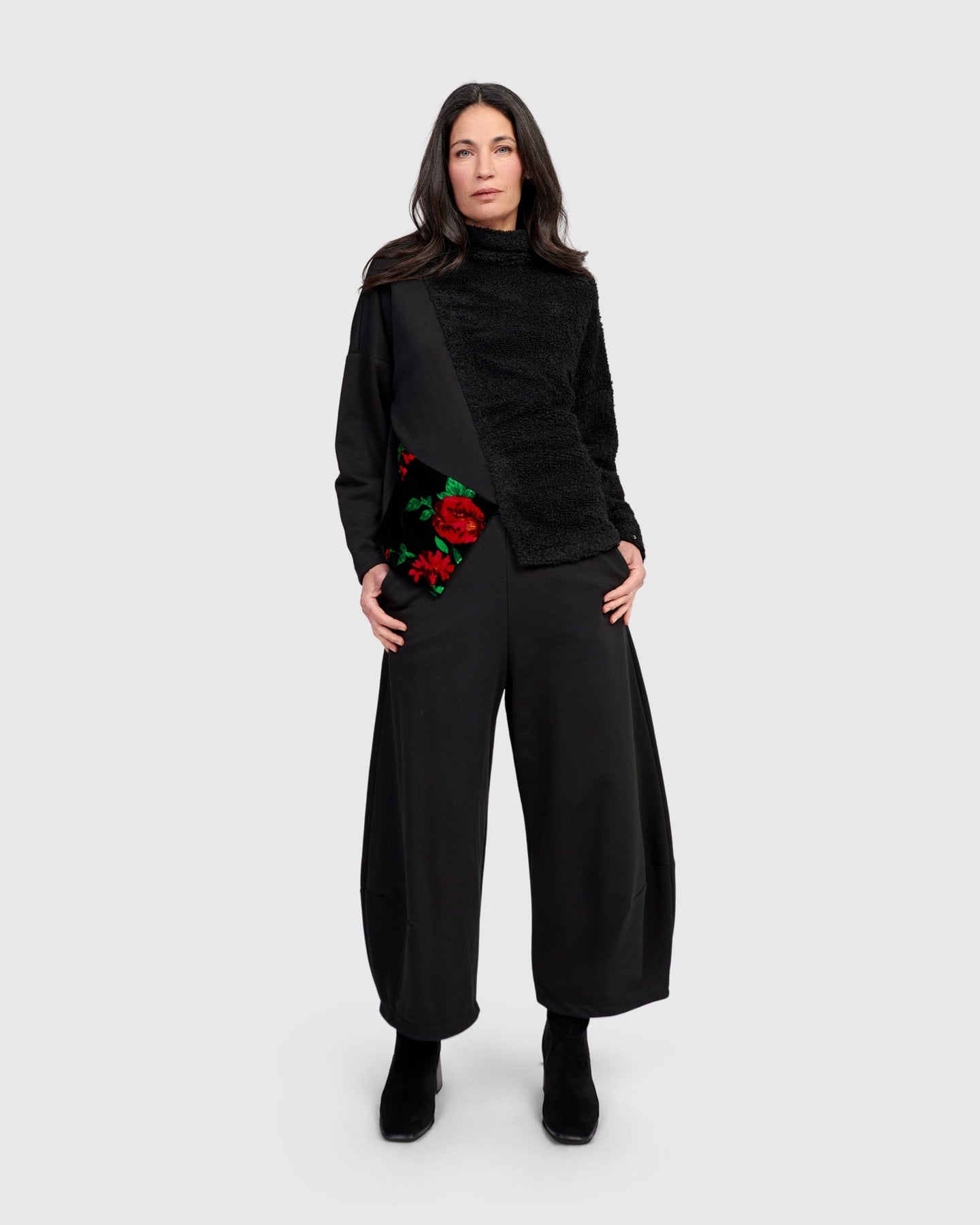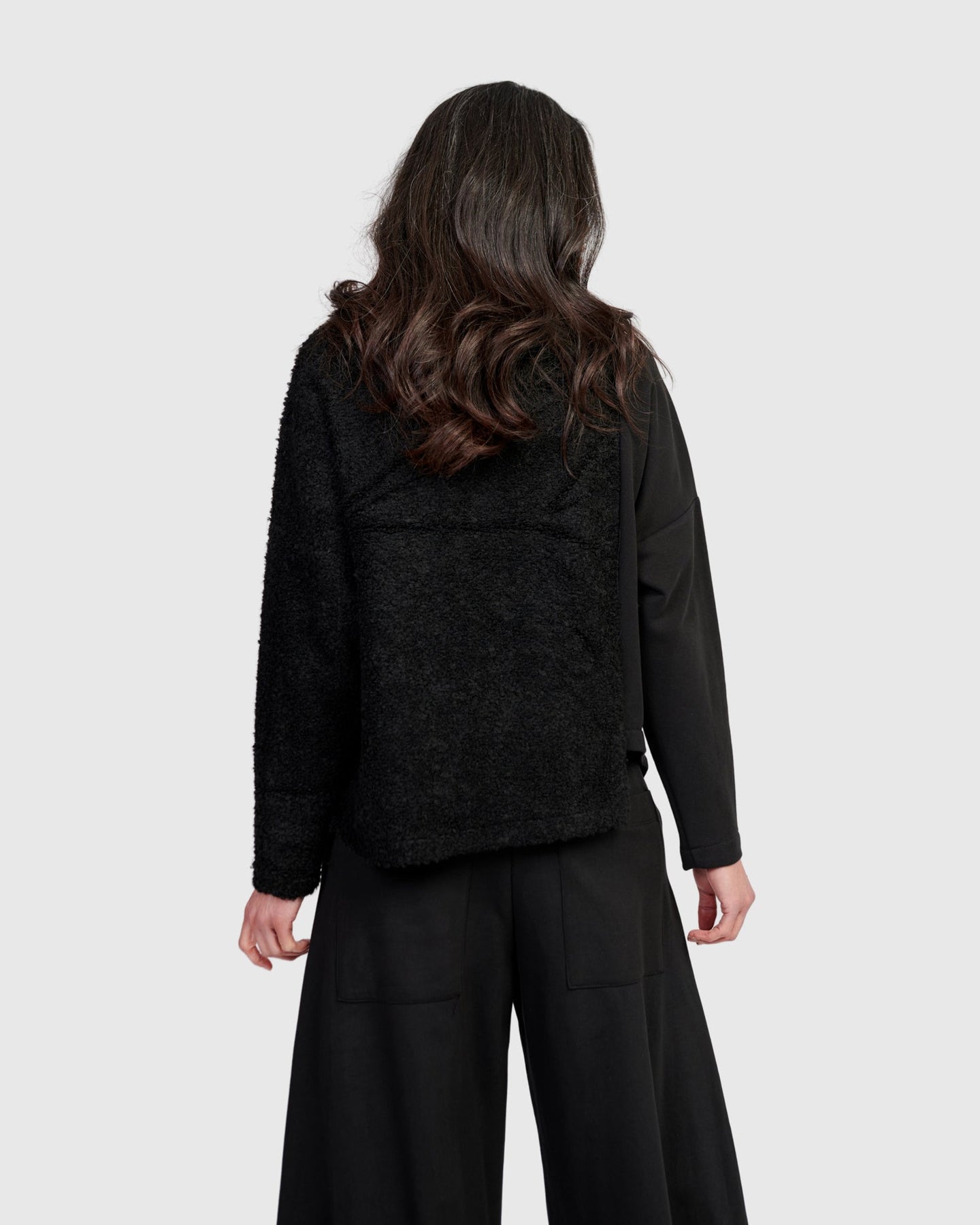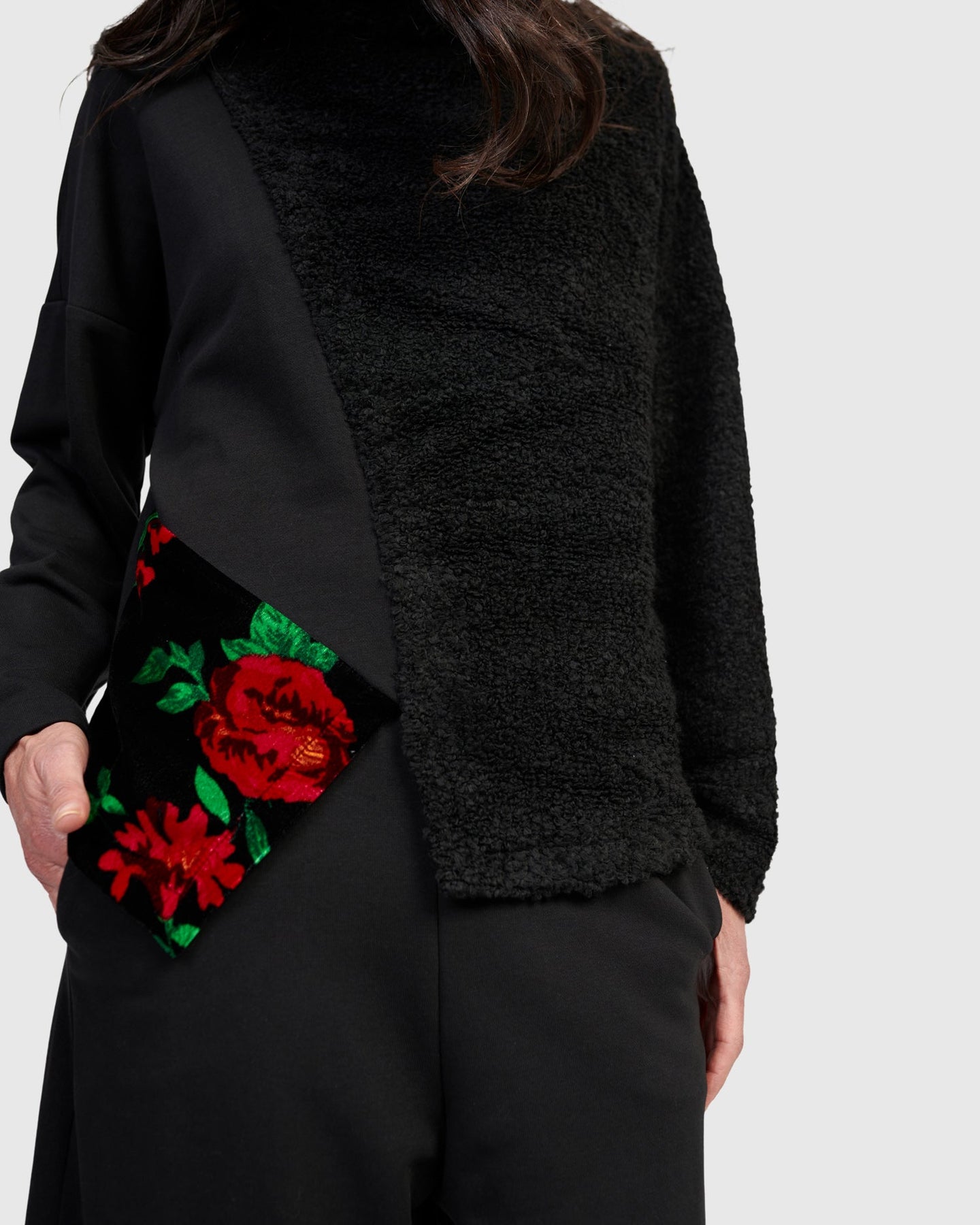 Designed for softness and shape, this pullover brings together plush boucle, French terry, and velvet trim in a dynamic boxy silhouette. The funnel neck and asymmetrical hem add polish, while the relaxed cut provides all-day ease. A contemporary layer for cool-weather style with an artful edge.