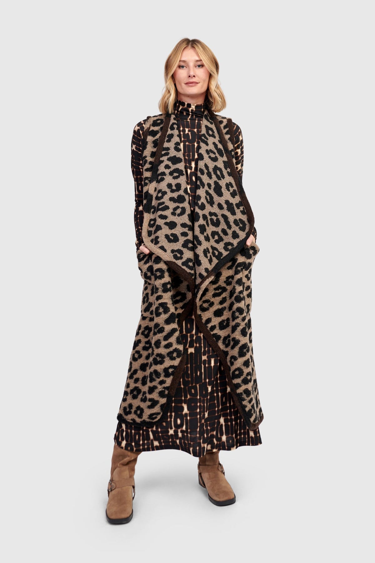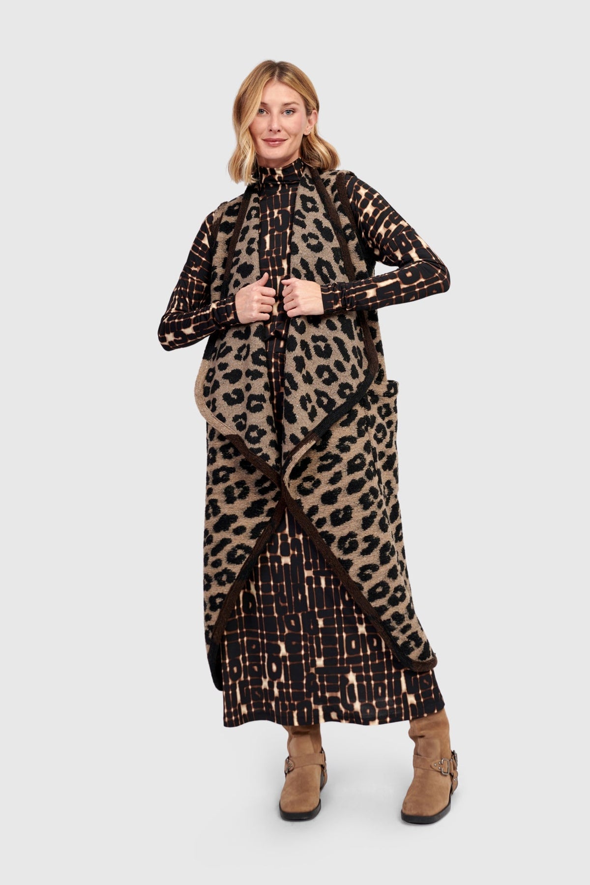 Layered drama meets loungewear ease in this relaxed leopard vest. The longline cut features draped front lapels and roomy patch pockets, offering soft structure in a cozy brushed knit. An ideal topper for transitional weather or added flair indoors.