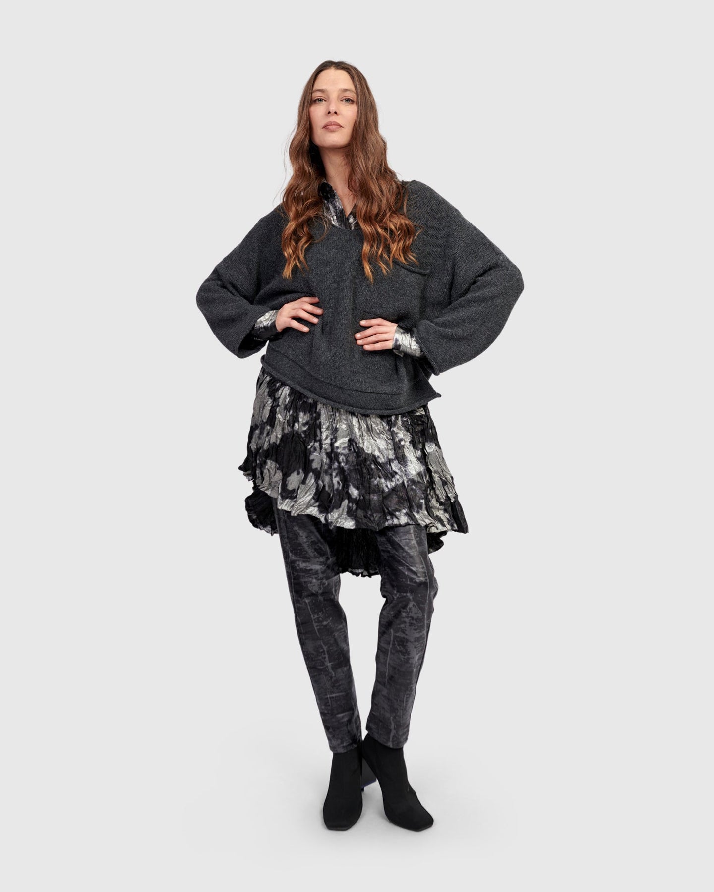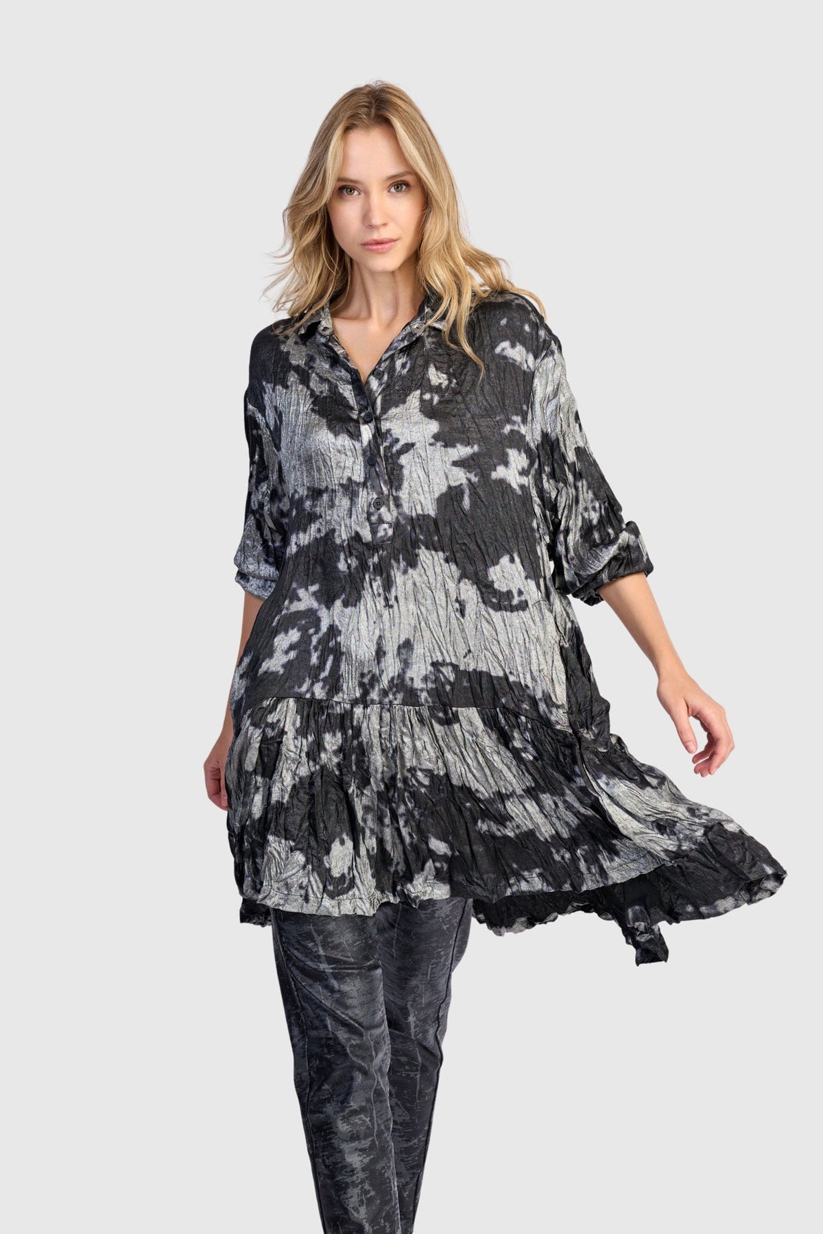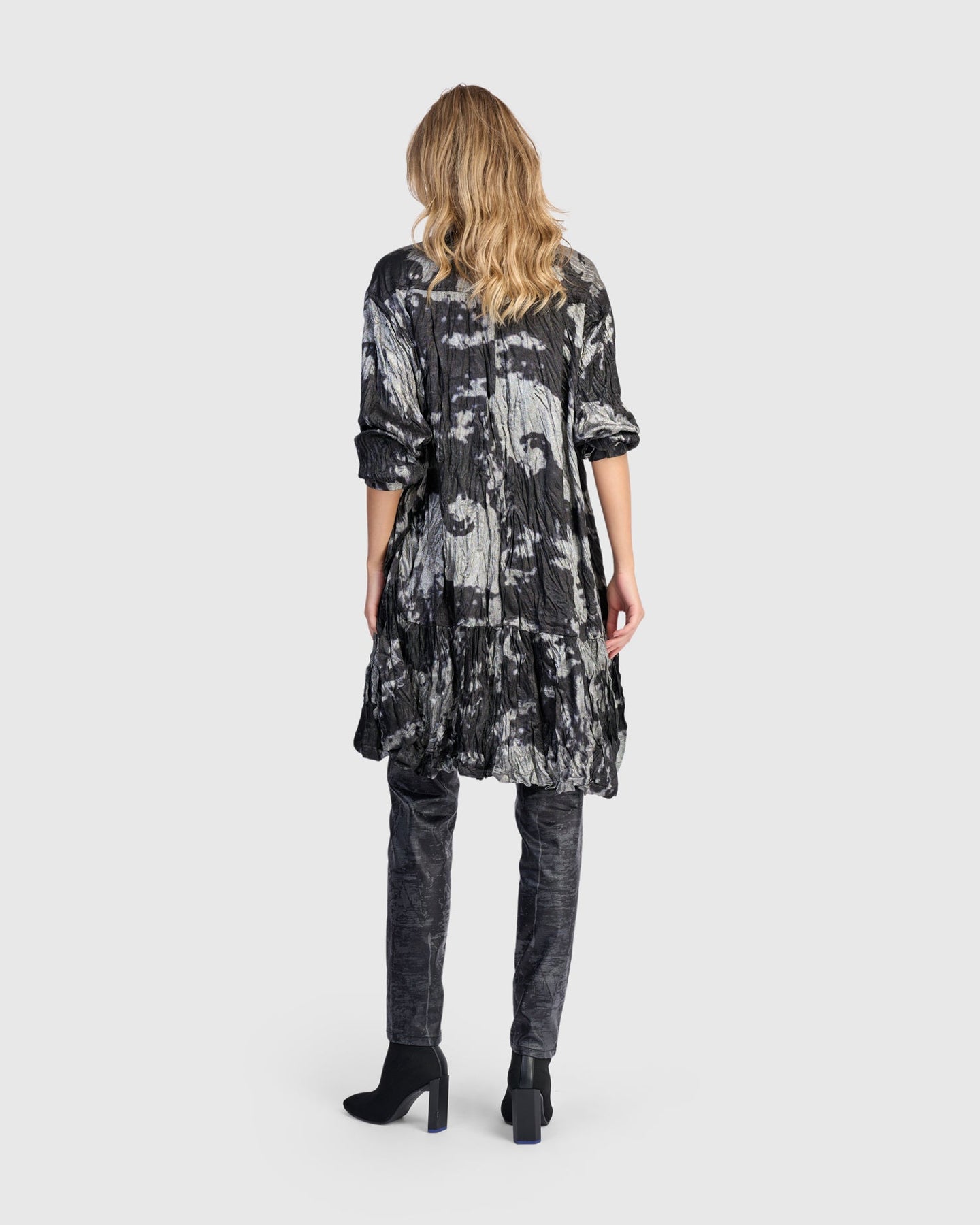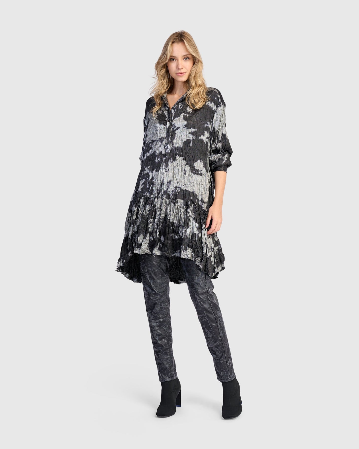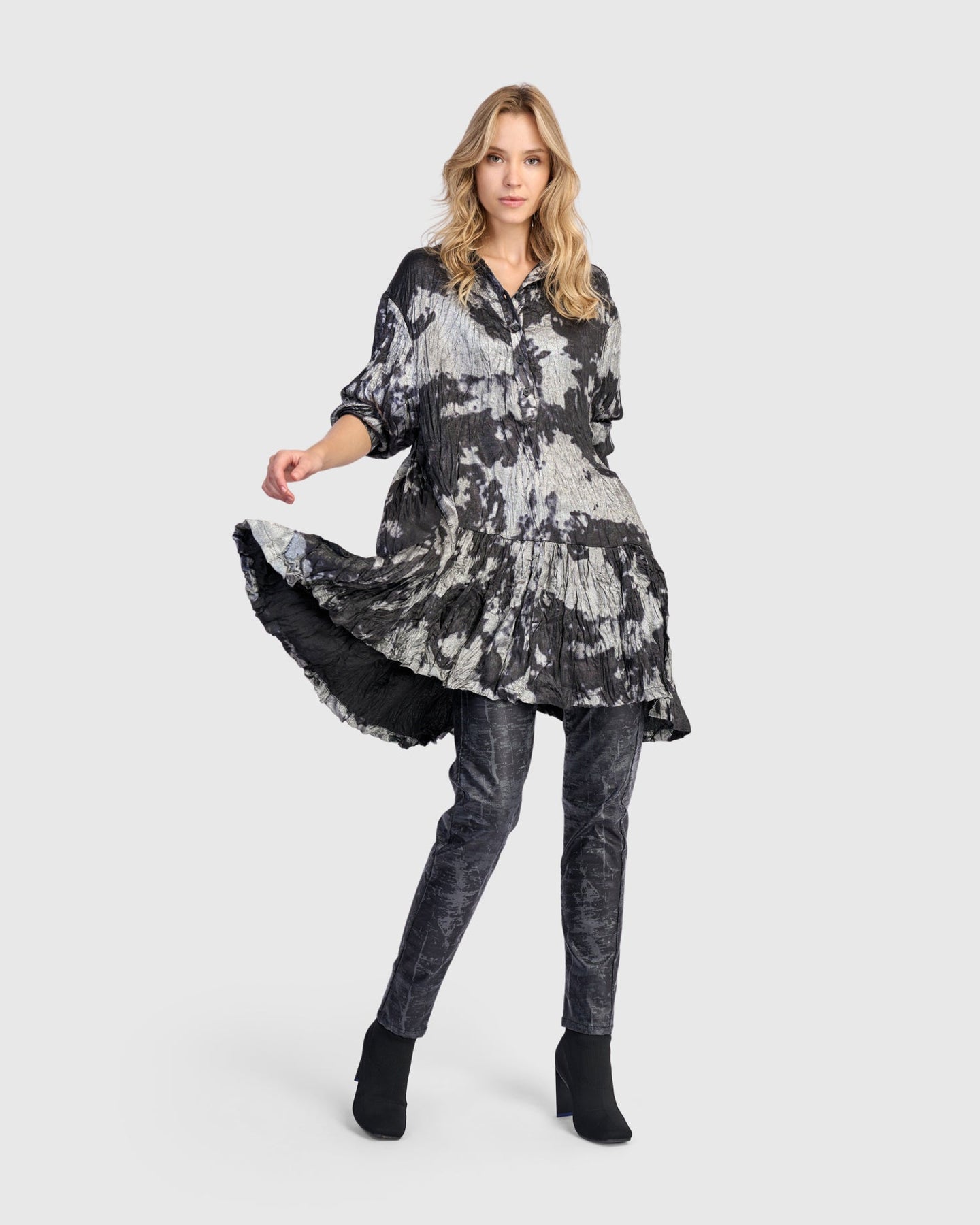 Rendered in silver shimmer, this tunic makes a sophisticated impact with its textural crinkle and fluid silhouette. The flared drop waist and button-front detail lend graceful movement, while discreet pockets keep things functional. Wear it as a festive top or layered open as a statement piece.