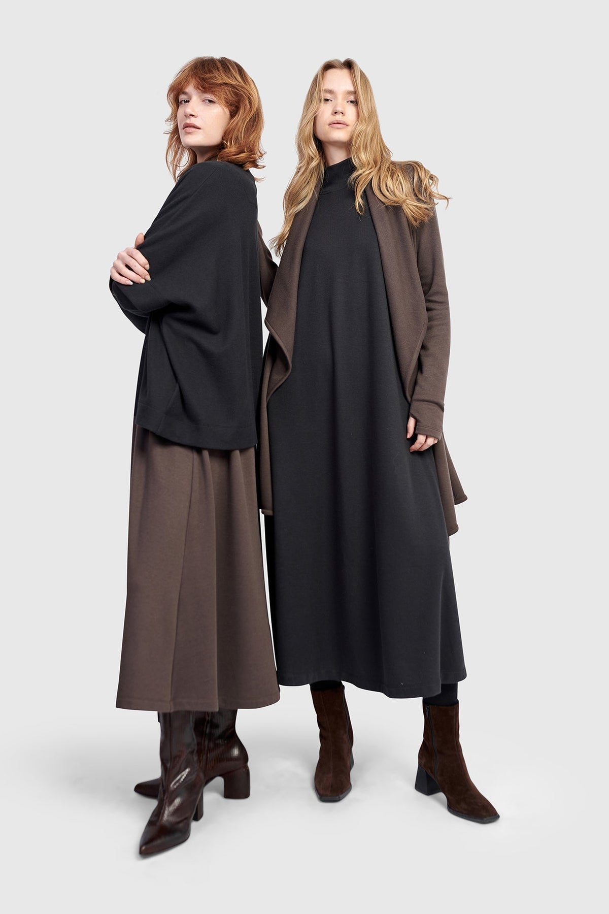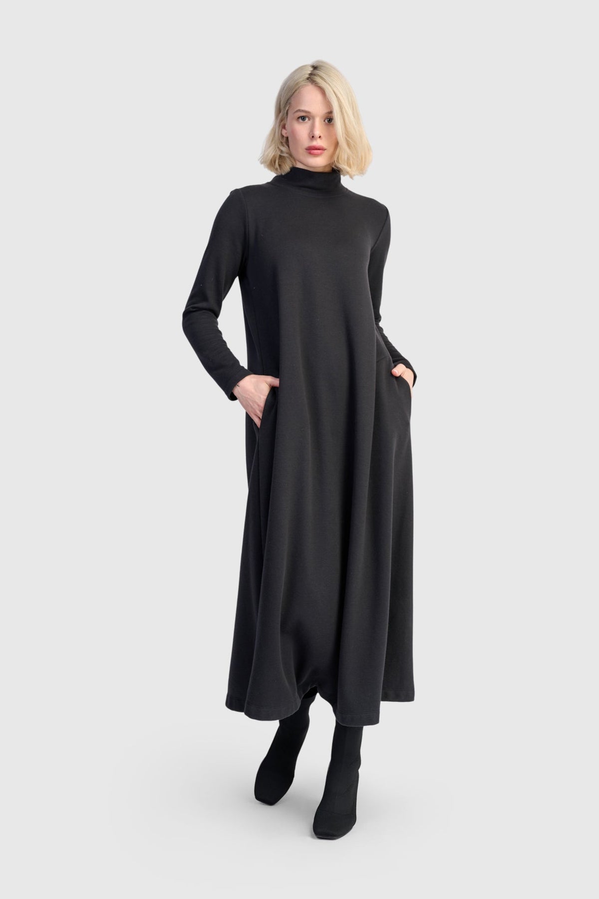 A streamlined A-line silhouette with gentle tapering through the bust gives this maxi dress a clean, flattering shape. Crafted from plush cotton-blend terry with a soft brushed interior, it offers midweight warmth without bulk. The mock neck and long sleeves provide seasonal coverage, while side-seam pockets add function to its polished profile. A core piece in your casual-chic rotation.