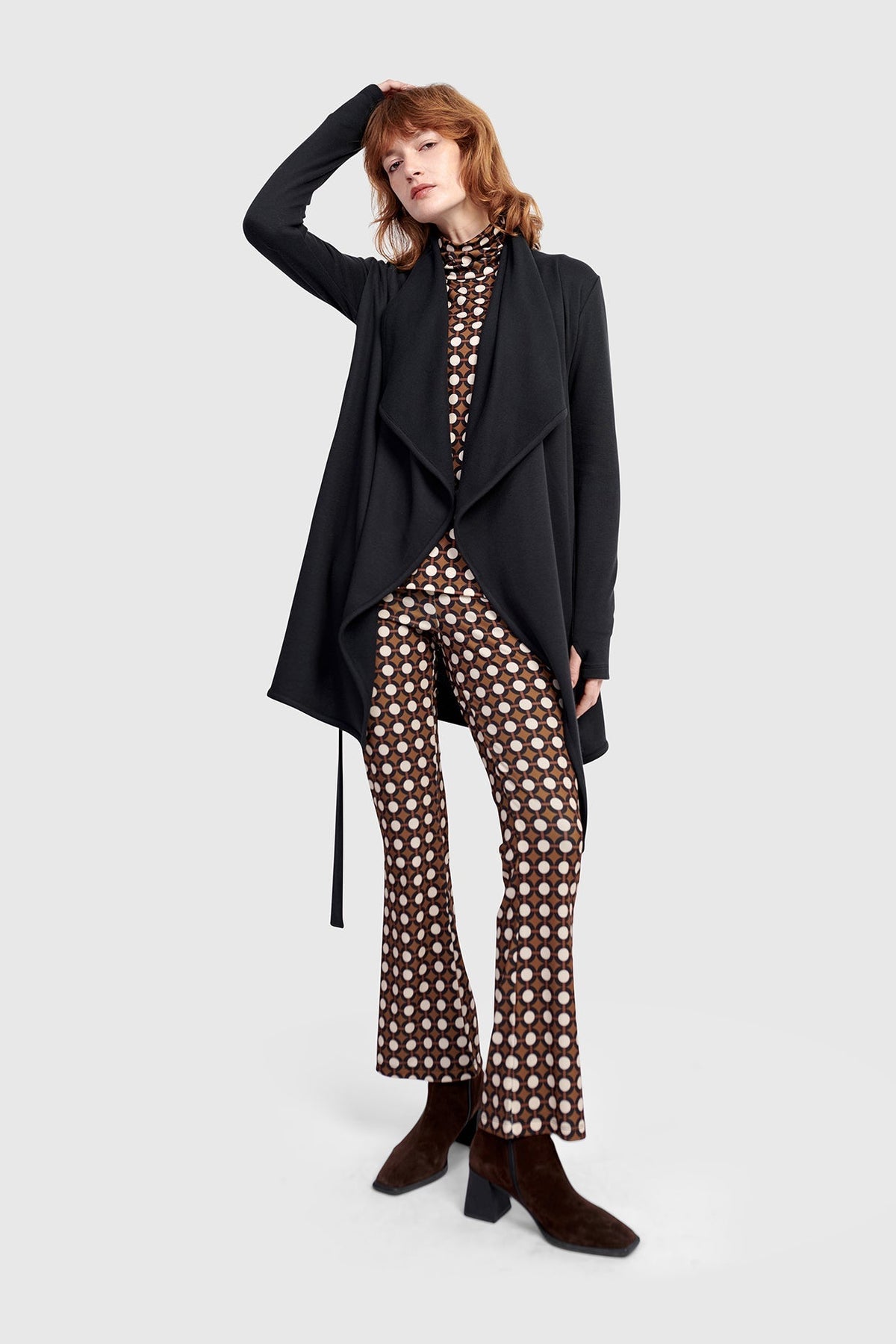 This modern wrap cardigan offers structured softness in a midweight knit with a plush interior. Cut in a flattering A-line shape, it features gently draped lapels and a self-belt to define the waist. Set-in sleeves and practical side pockets round out this elevated layering piece, perfect indoors or out.