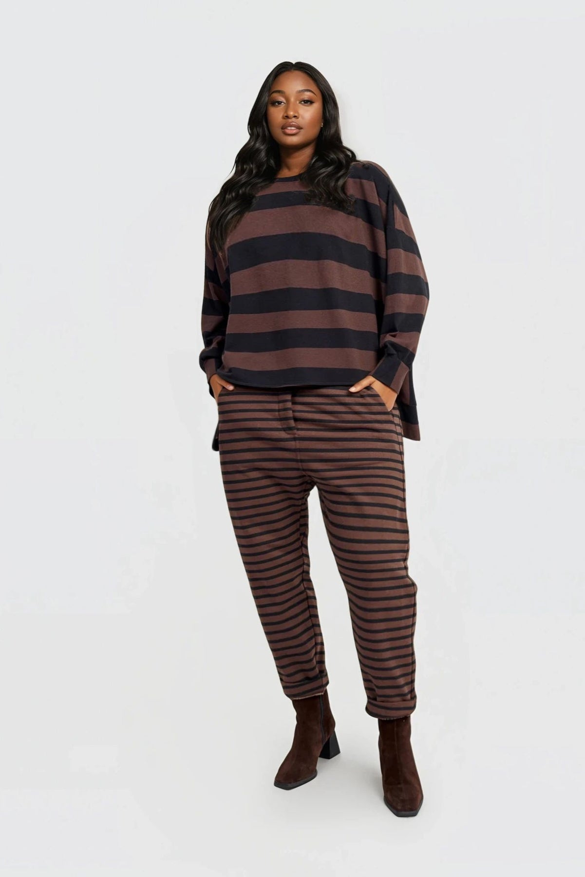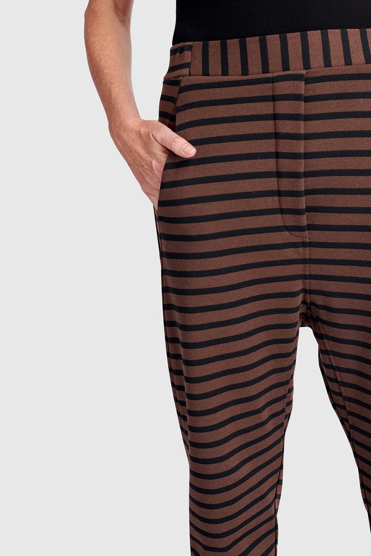 These striped harem pants feature a drop crotch and tapered ankle for directional shape. With a slim relaxed fit and comfortable elastic waist, they deliver laid-back structure in a graphic palette.