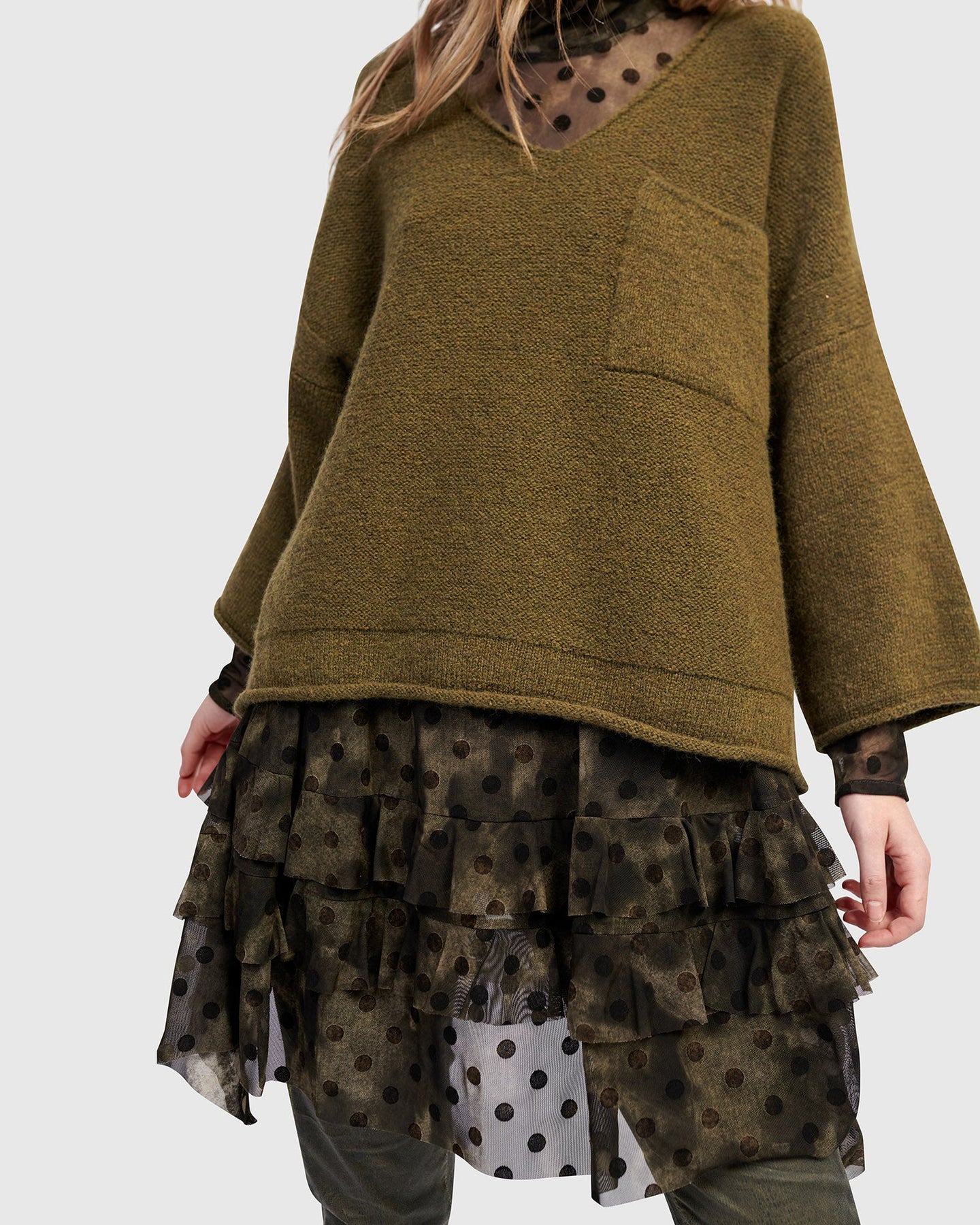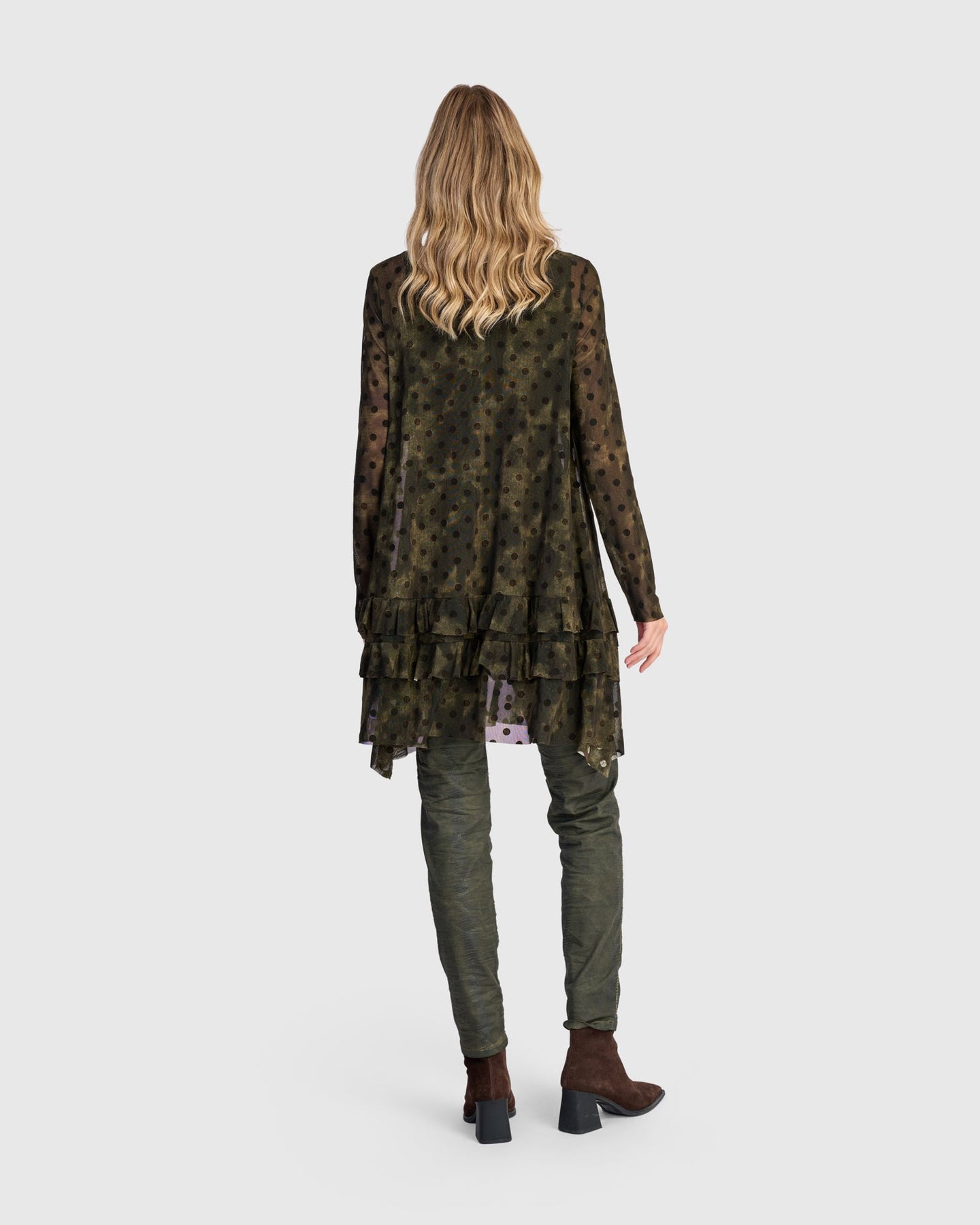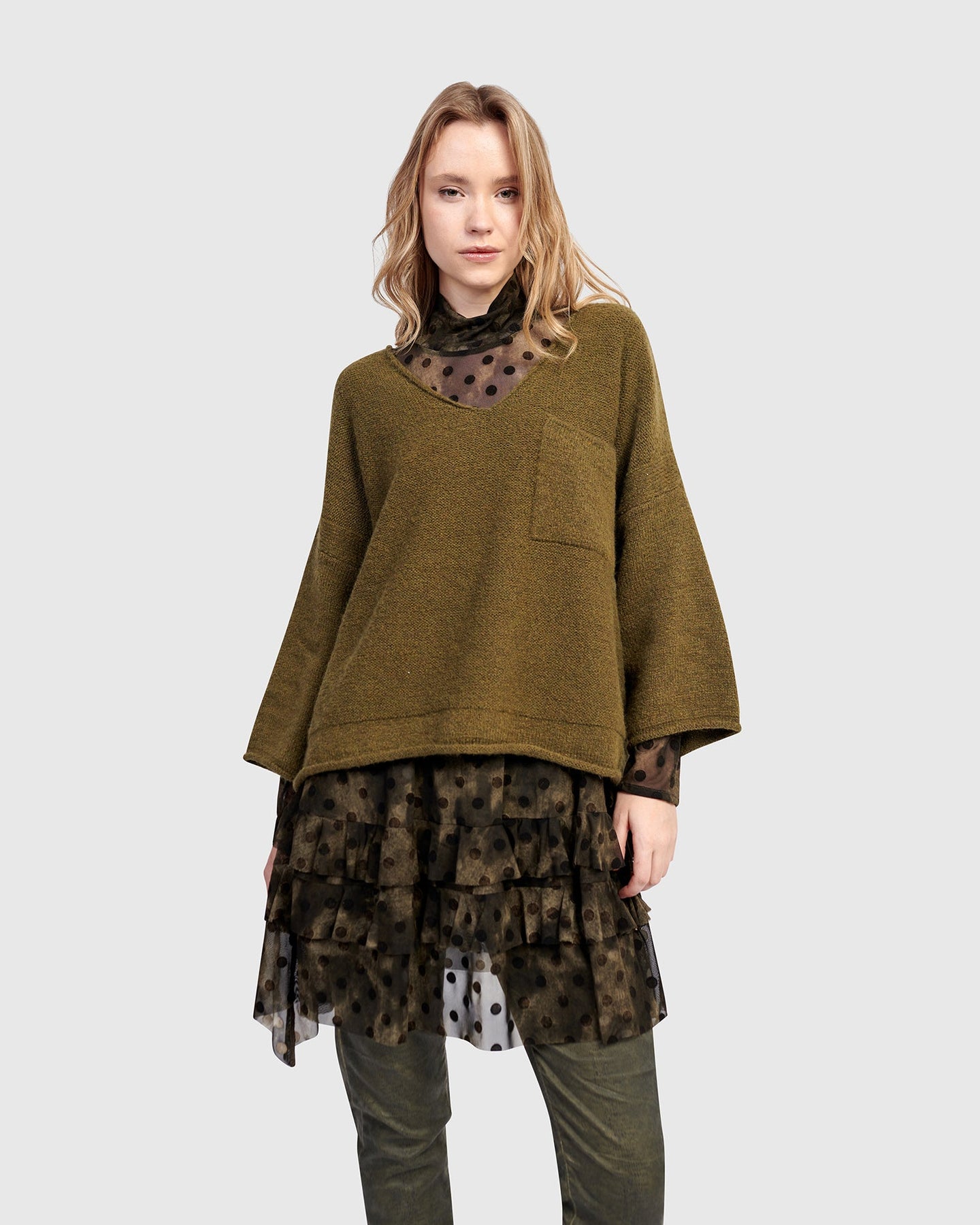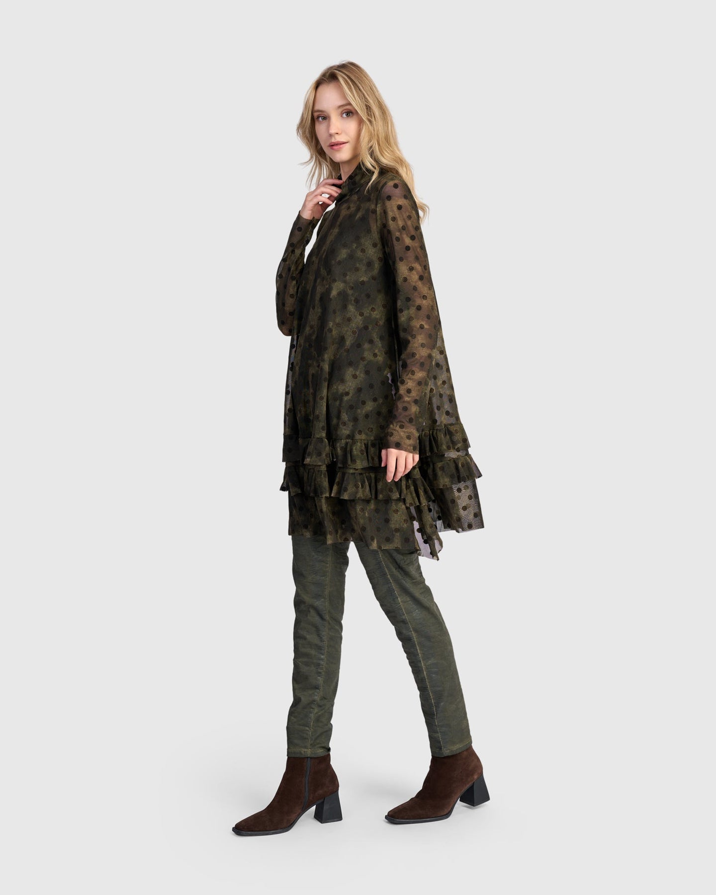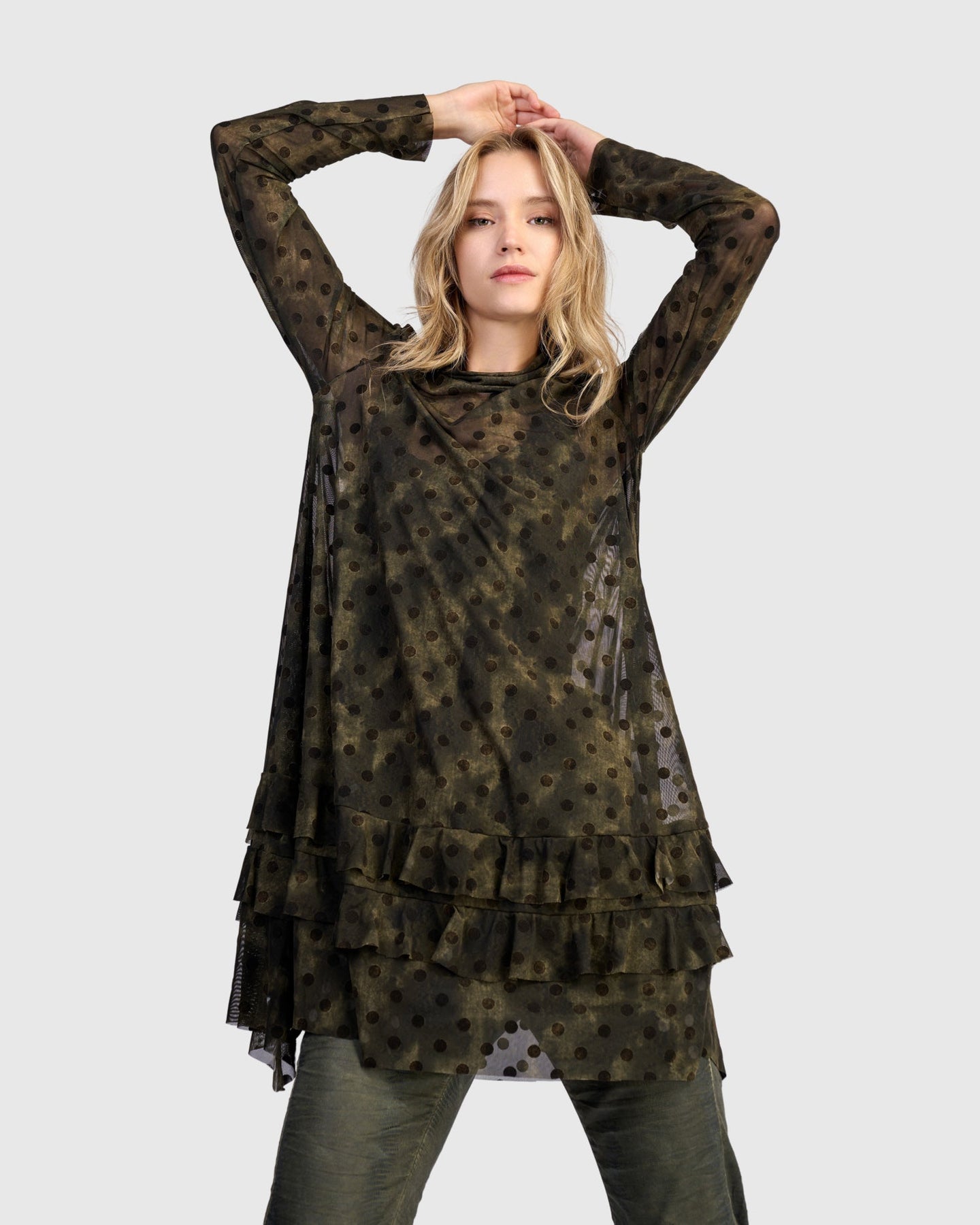 This romantic mesh tunic blends structured shape with soft movement. Tiered ruffles flow from the A-line cut, and a draped mock neck adds elevated dimension. Sheer yet substantial, it includes a slip for coverage. Wear it to introduce texture and drama to everyday layering.