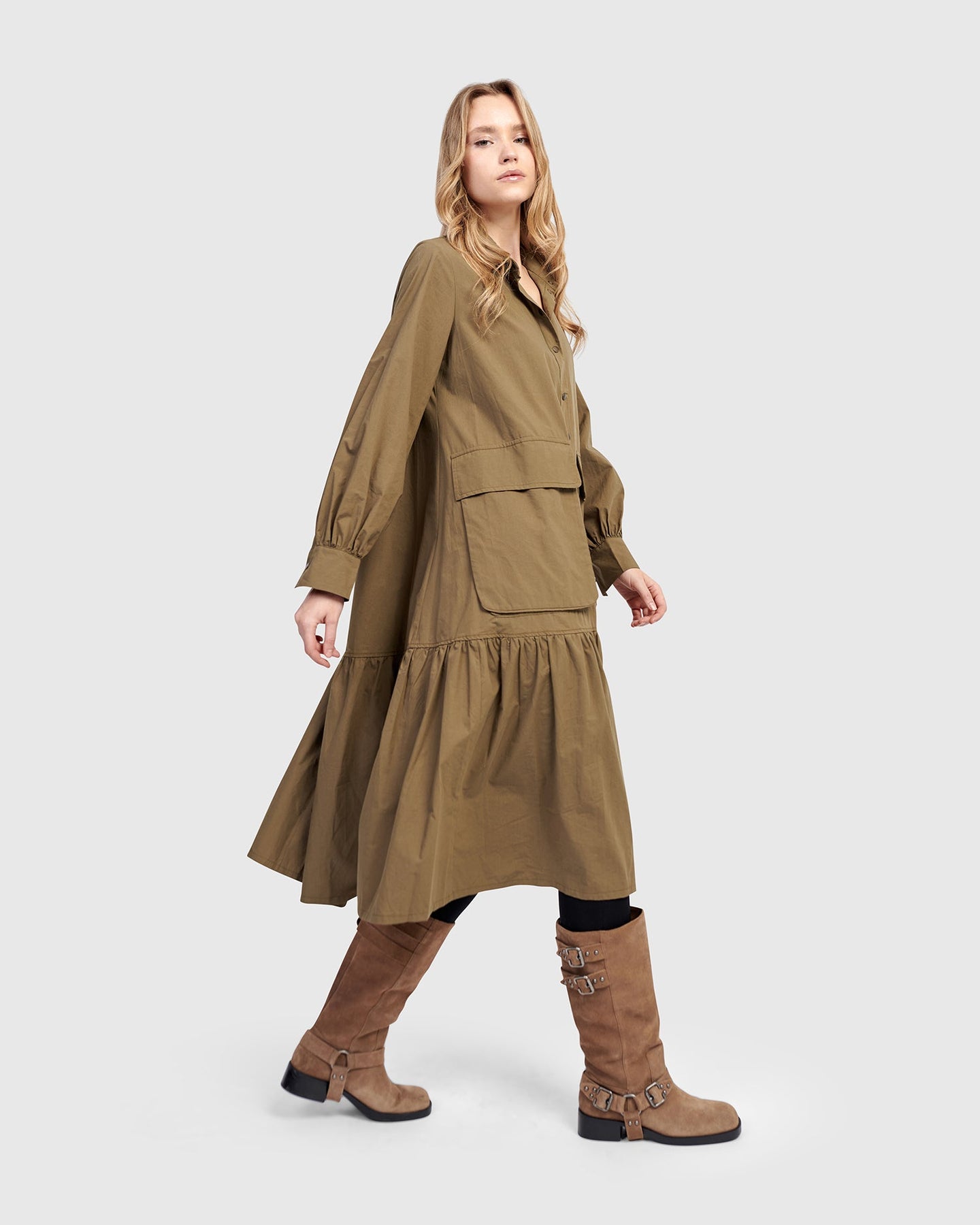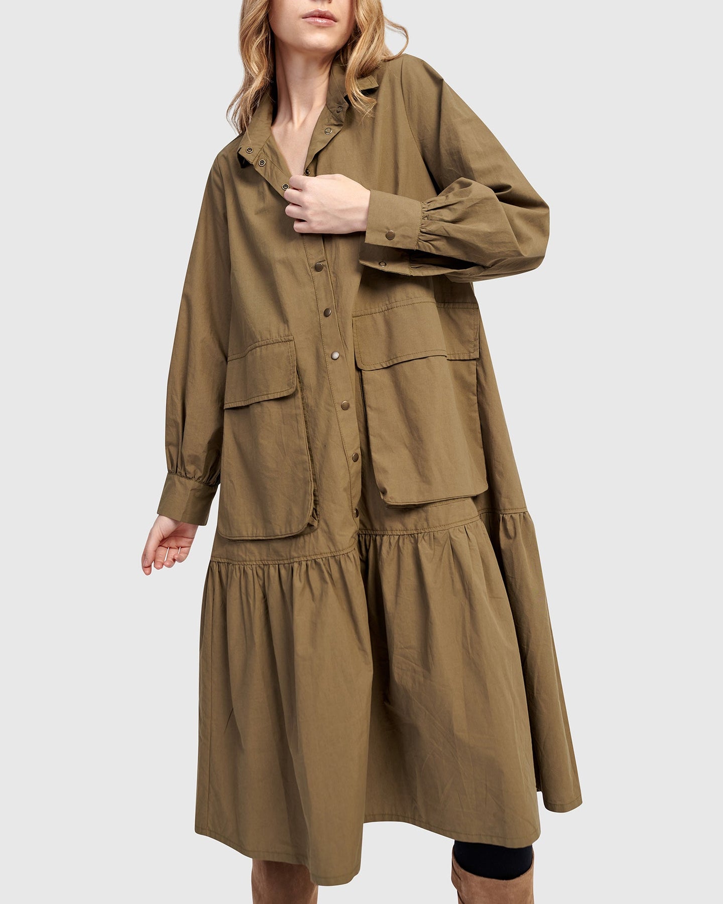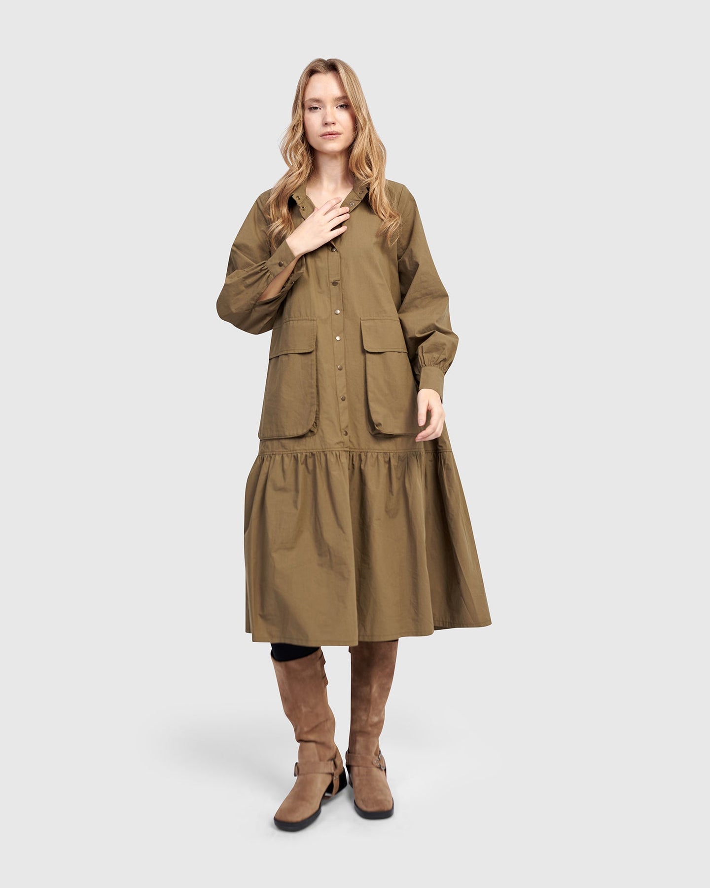 Cut in classic khaki poplin, this dress nods to utilitarian roots with oversized pockets and crisp tailoring. The blouson sleeves and full skirt soften the structure, creating a timeless silhouette with everyday ease.