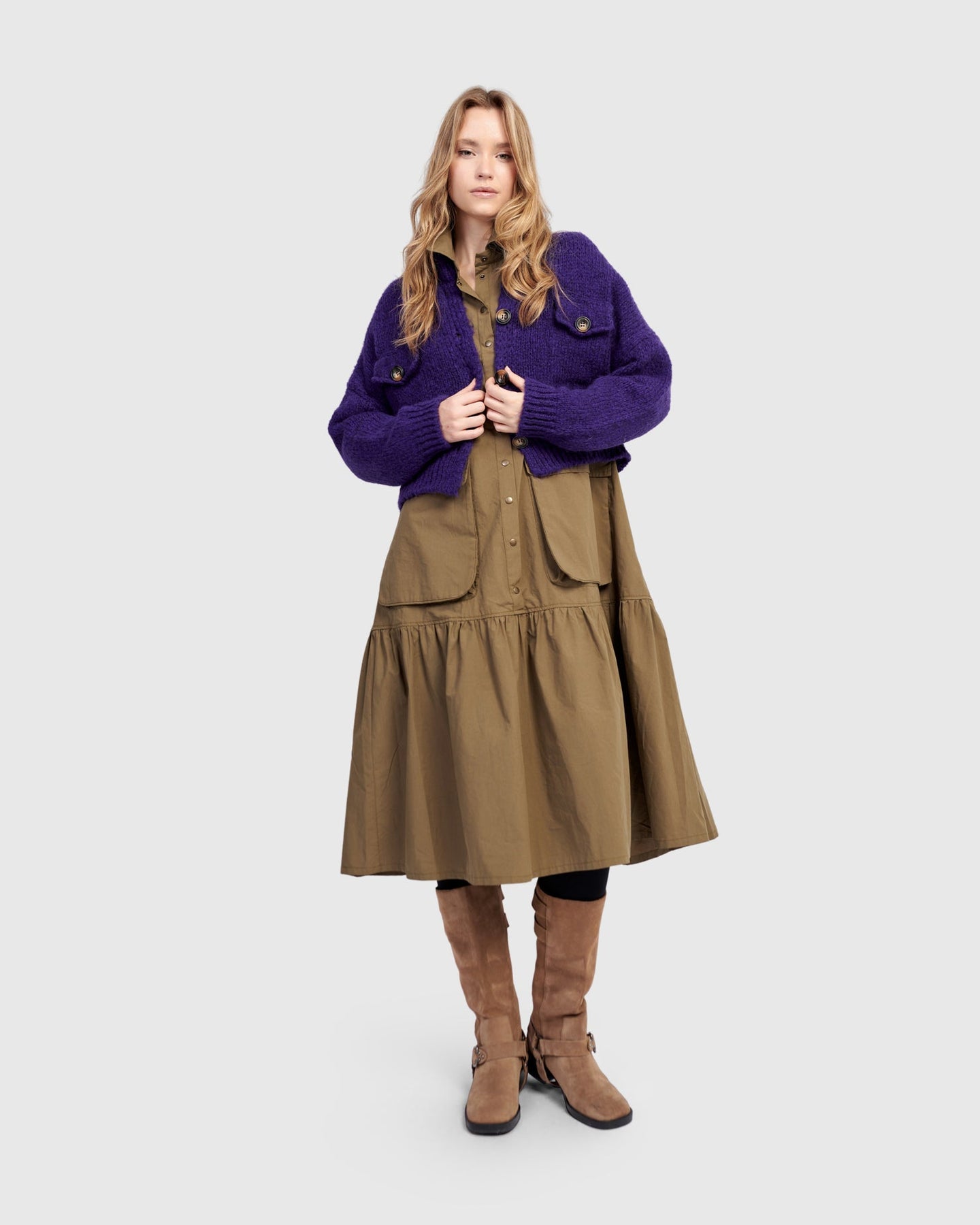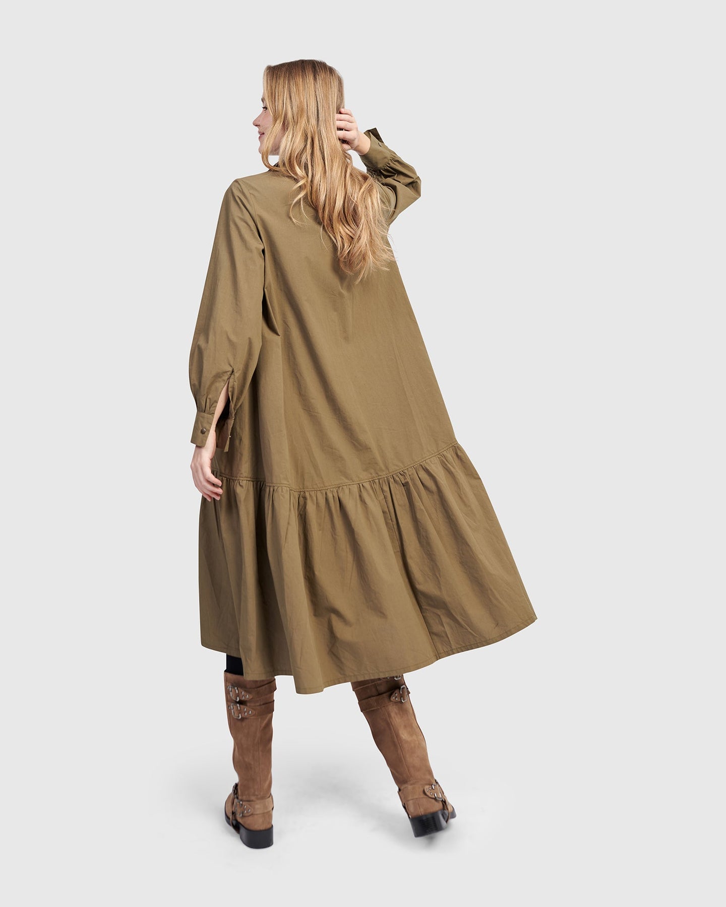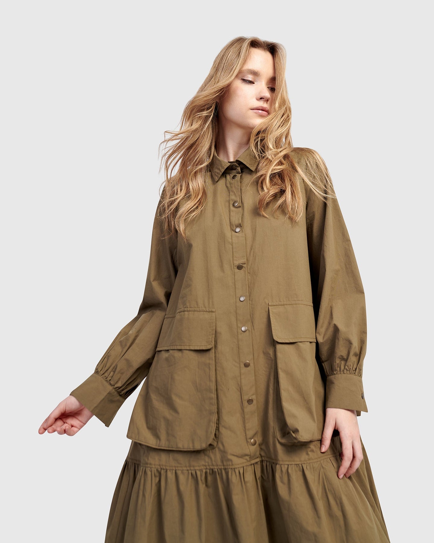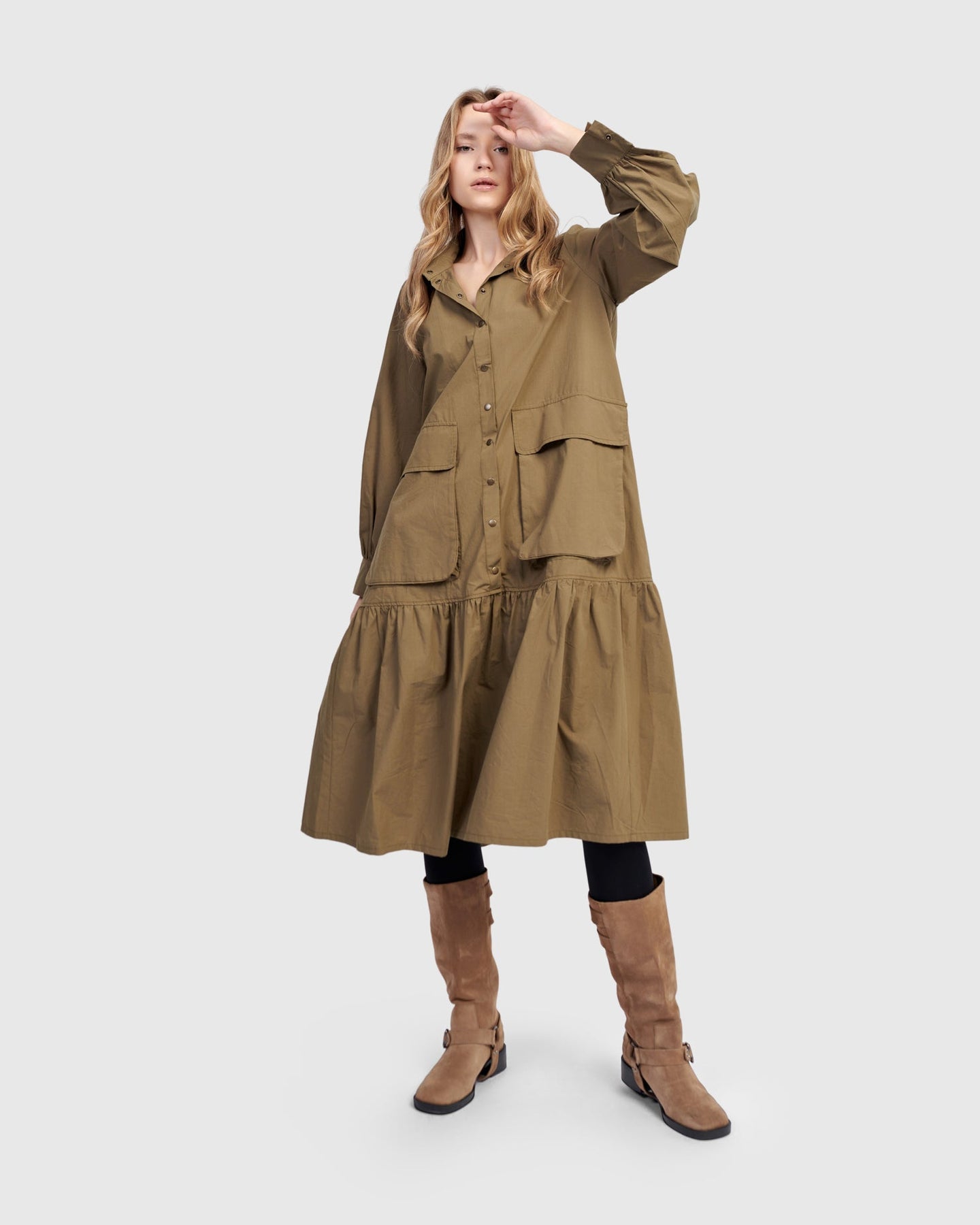 Cut in classic khaki poplin, this dress nods to utilitarian roots with oversized pockets and crisp tailoring. The blouson sleeves and full skirt soften the structure, creating a timeless silhouette with everyday ease.