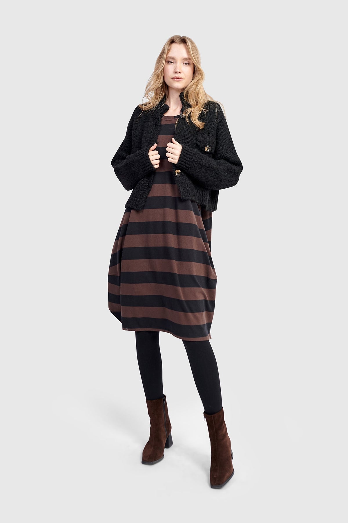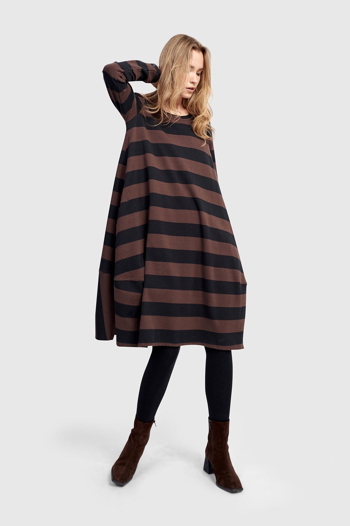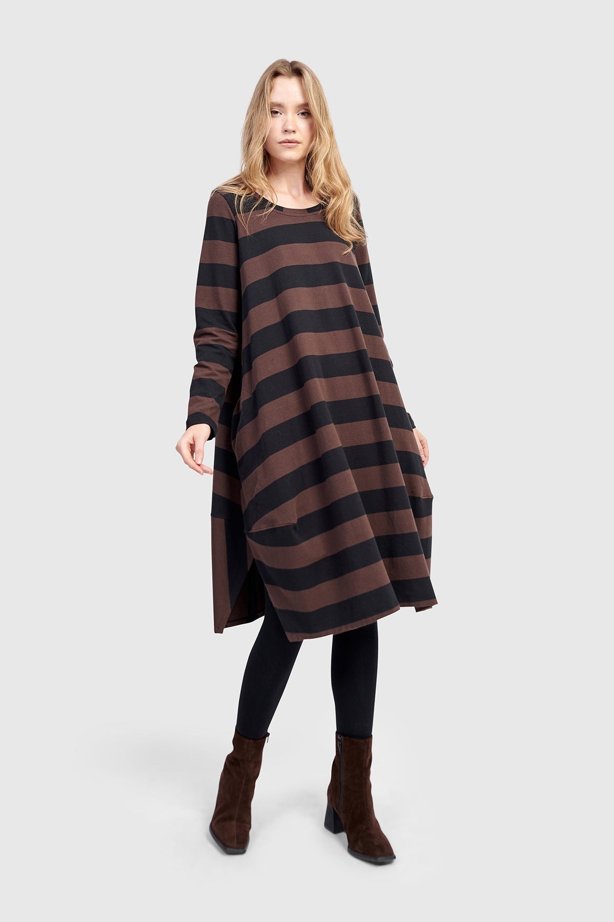 Soft structure meets laid-back polish in this cocoon-shaped dress. A fitted shoulder balances the voluminous A-line silhouette, with a gently tapered hem and generous skirting. The stretch cotton jersey offers substantial drape with breathable ease, while sporty side slits and discreet pockets add everyday function. Finished with a wide scoop neck, this modern midi flatters with minimal effort.