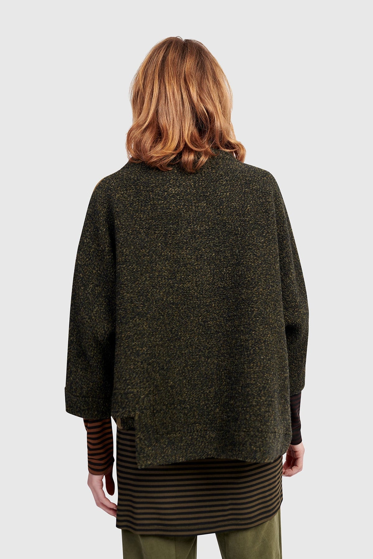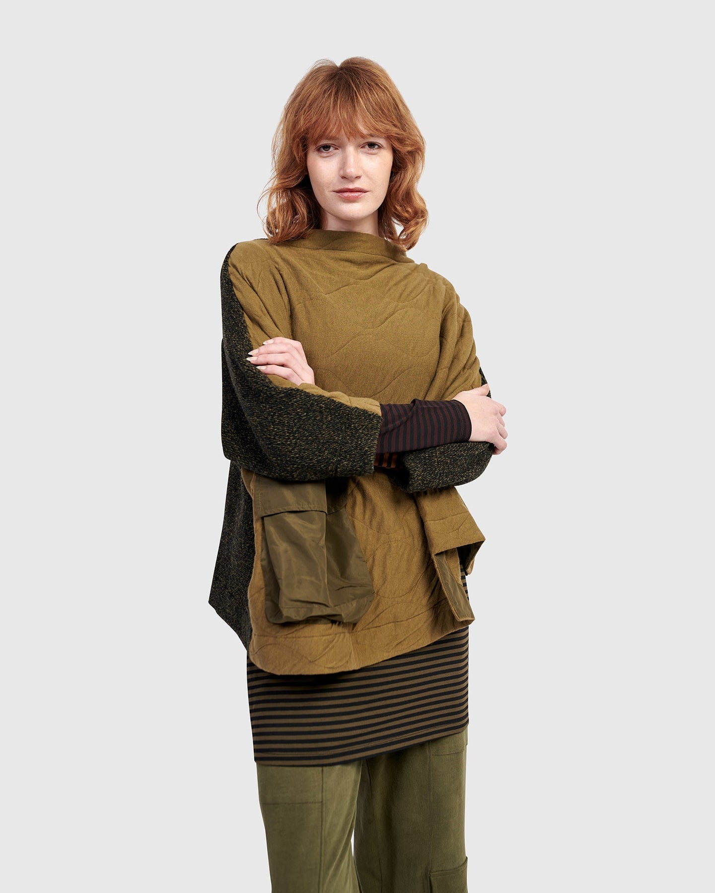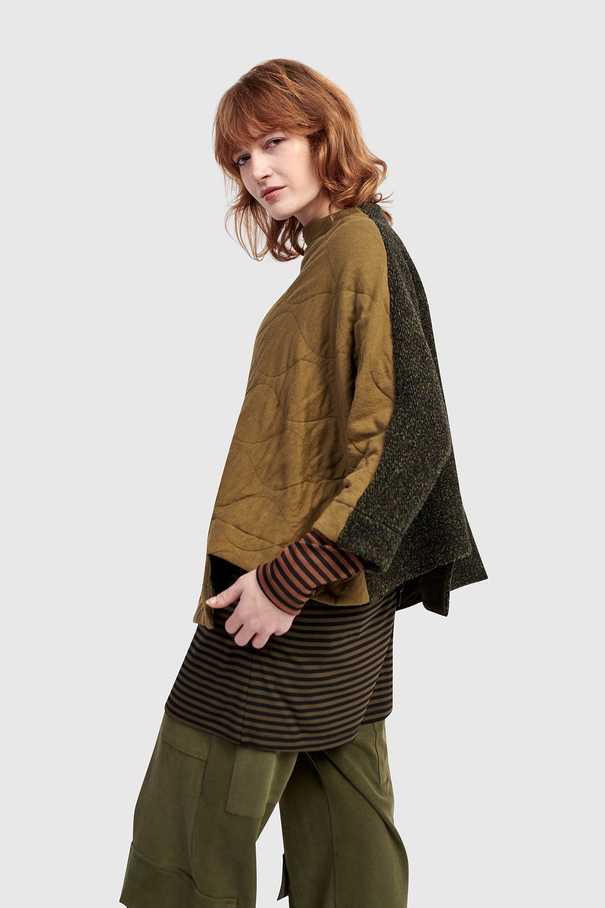 This sculptural pullover in soft khaki brings a layered look to modern comfort. The asymmetrical hem and funnel neck offer fresh proportion, while double-knit quilting delivers plush, cozy structure. A roomy fit and patch pocket make it as functional as it is distinctive.