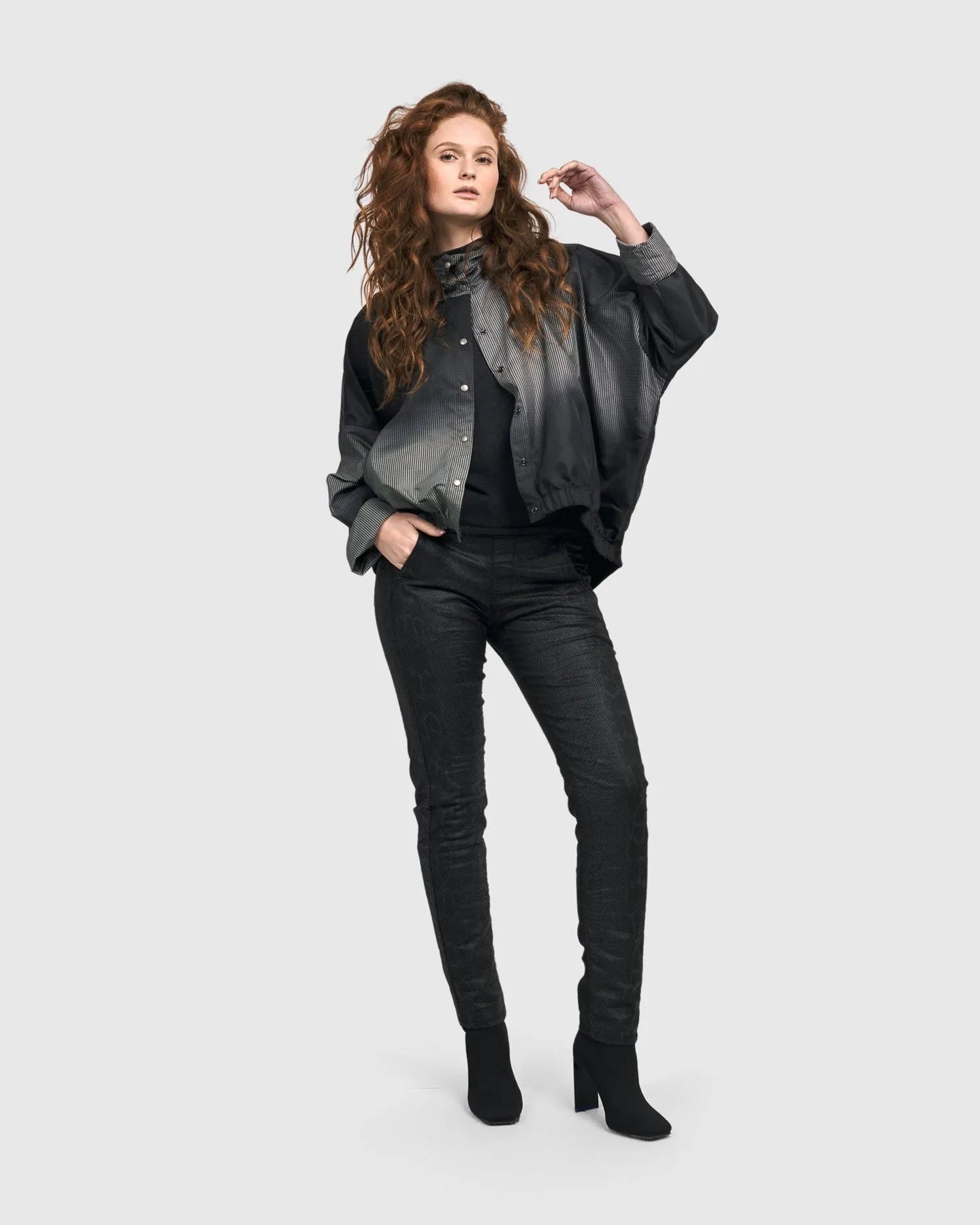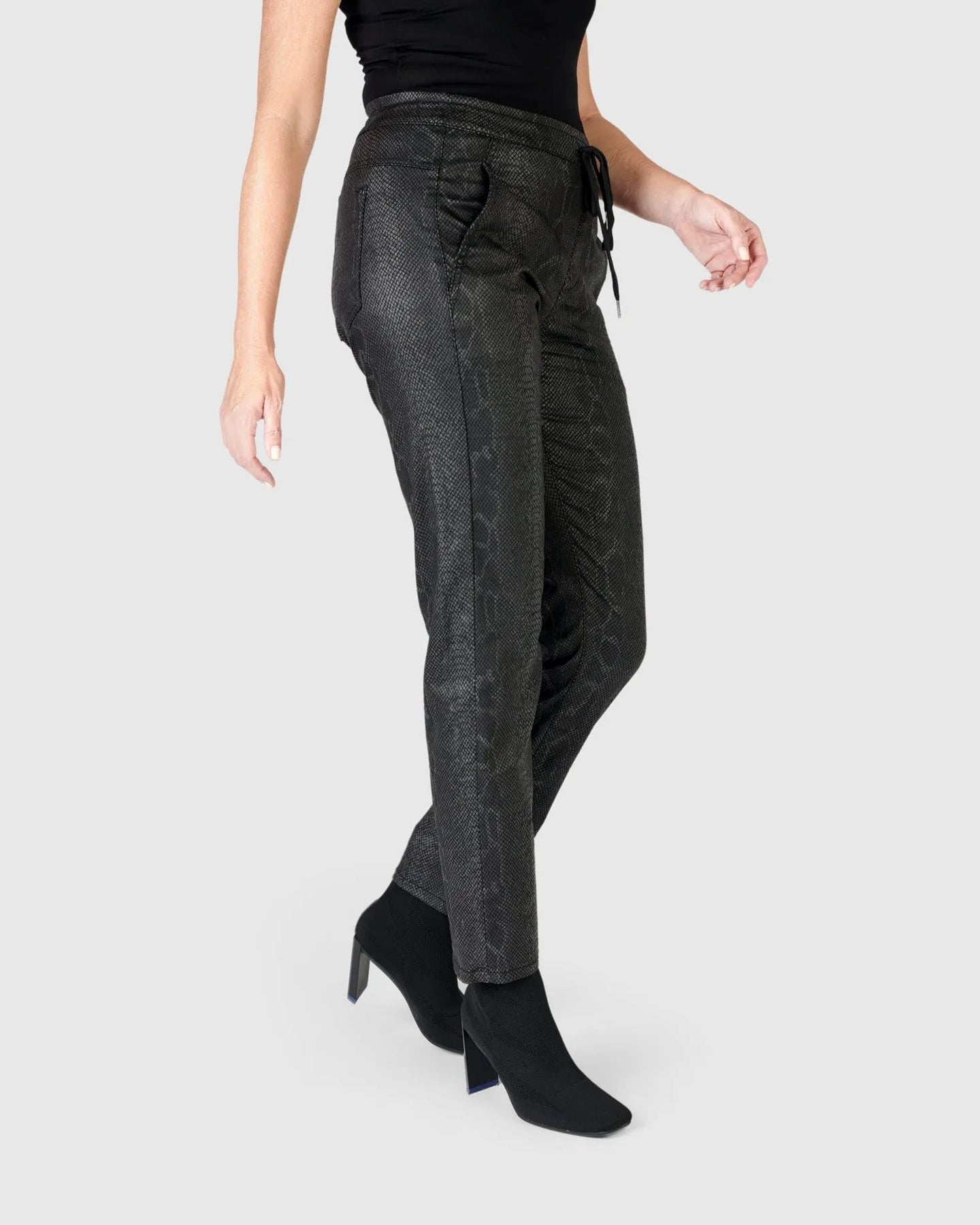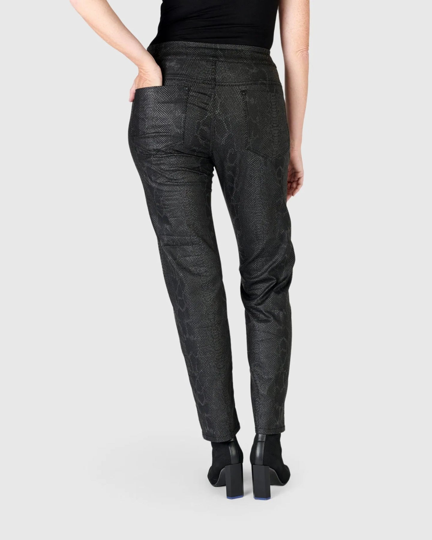 Voted best jeans for women over 50! You'll rock these subtle snake-print beauties with everything. Up close, the snake print has a sleek tonal grey sheen. The fit is soft, stretchy and amazing with a mid rise and relaxed taper. Stretch drawstring waist looks clean and neat. Mock fly, side seam pockets, back patch pockets and rivet trim.