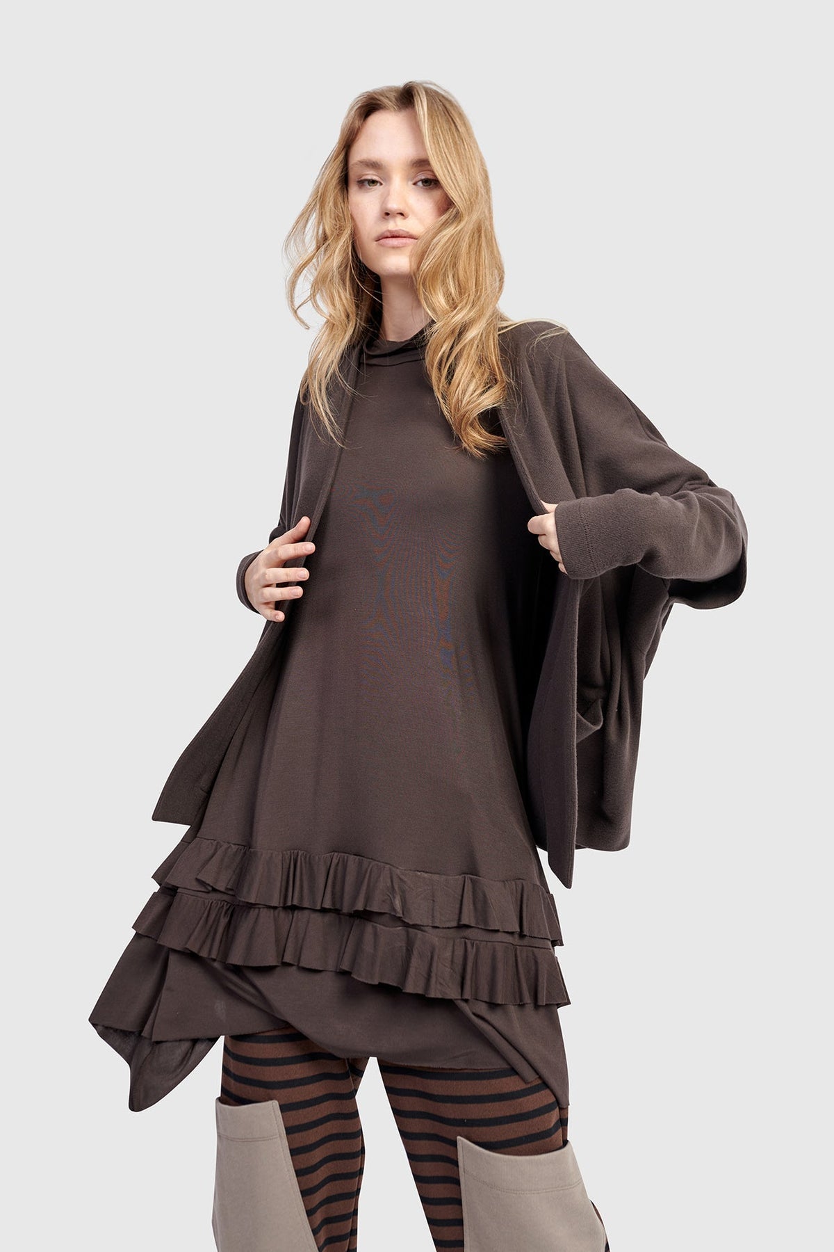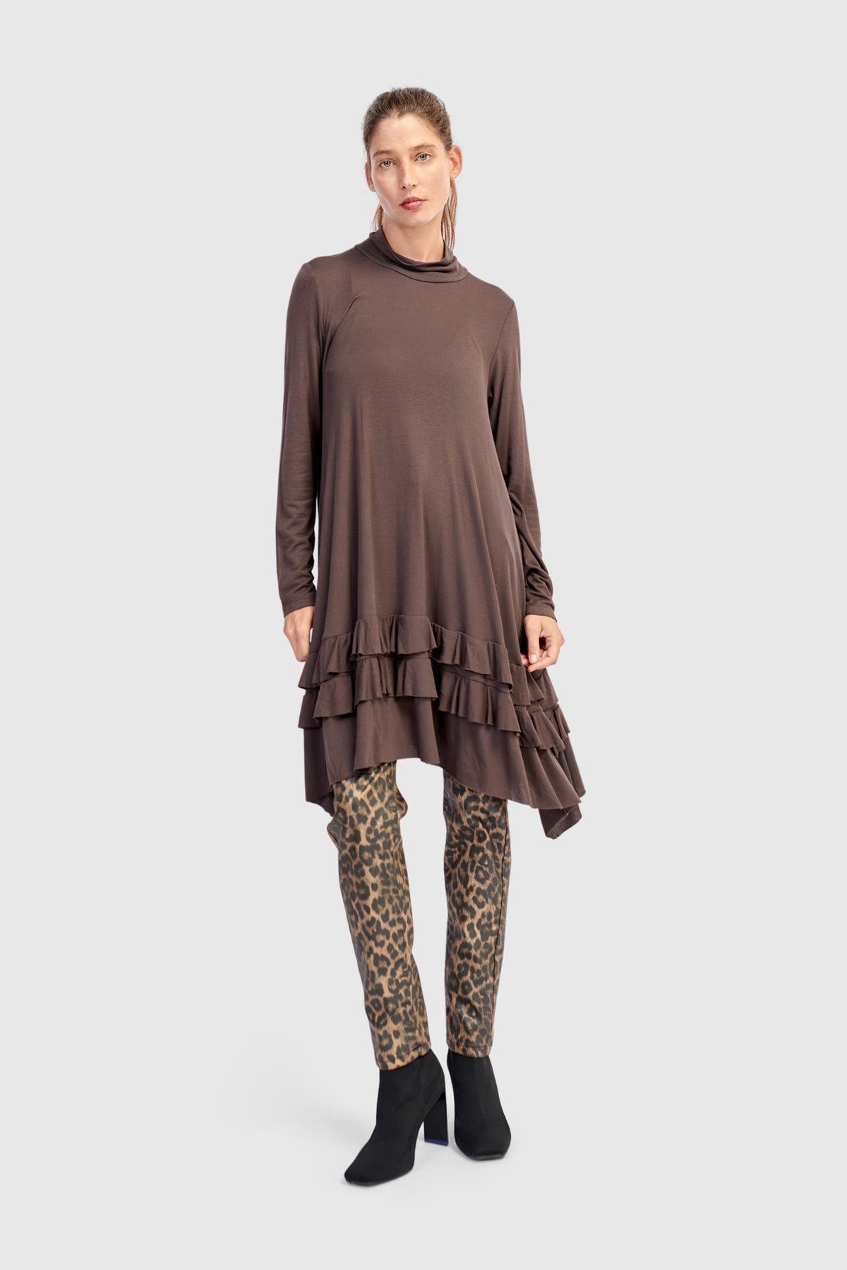 This ruffled tunic is soft yet tailored with a fitted upper bodice and flared hem. Made in a stretchy viscose blend, it flows gently while adding texture with tiered raw-edged panels.