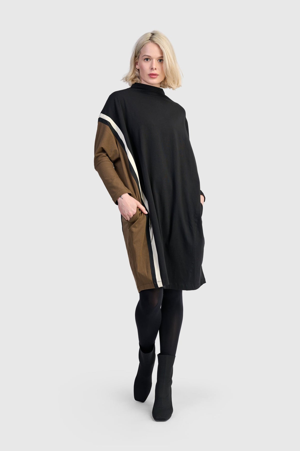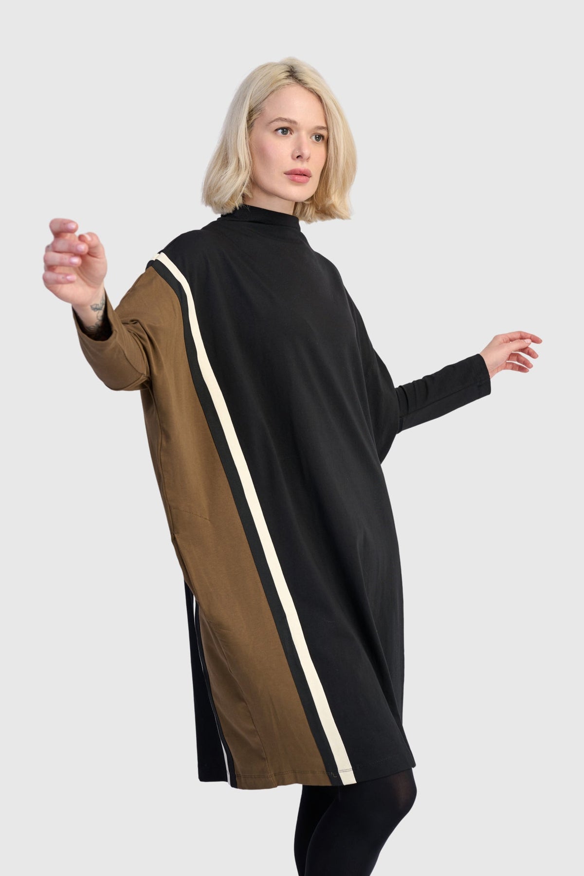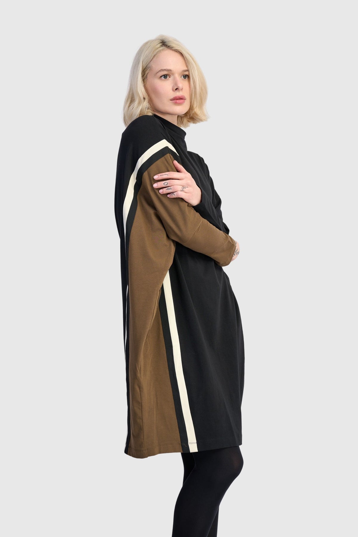 This energetic tee dress fuses sport and style with bold colorblocking and a tapered silhouette. The funnel neck and dolman sleeves add a sculptural edge, while the soft jersey fabric keeps it grounded in all-day comfort.
