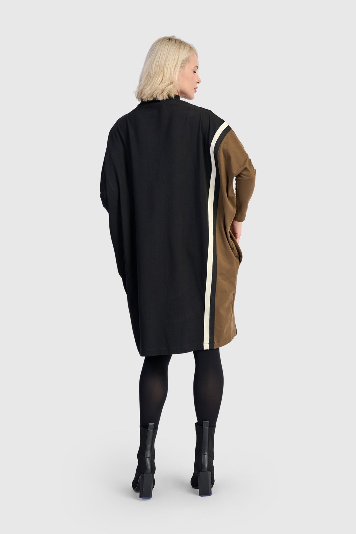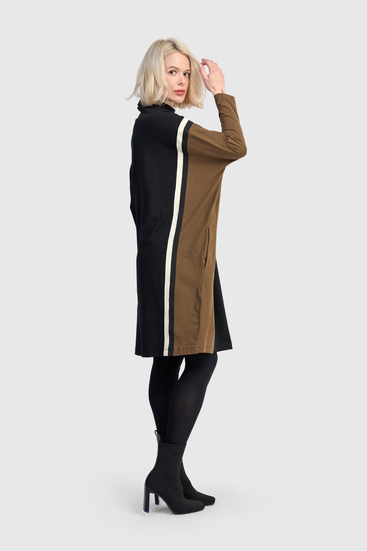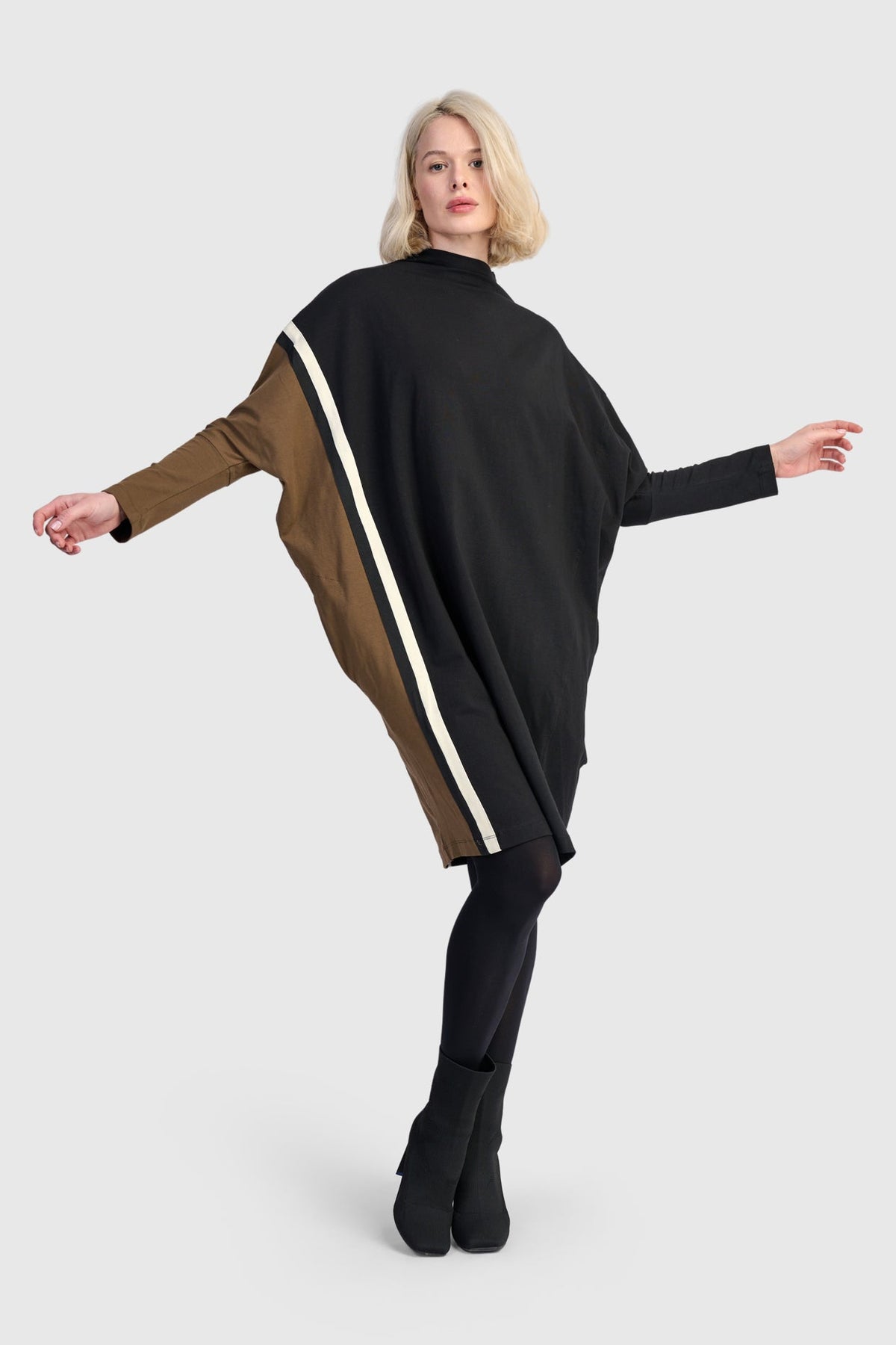 This energetic tee dress fuses sport and style with bold colorblocking and a tapered silhouette. The funnel neck and dolman sleeves add a sculptural edge, while the soft jersey fabric keeps it grounded in all-day comfort.