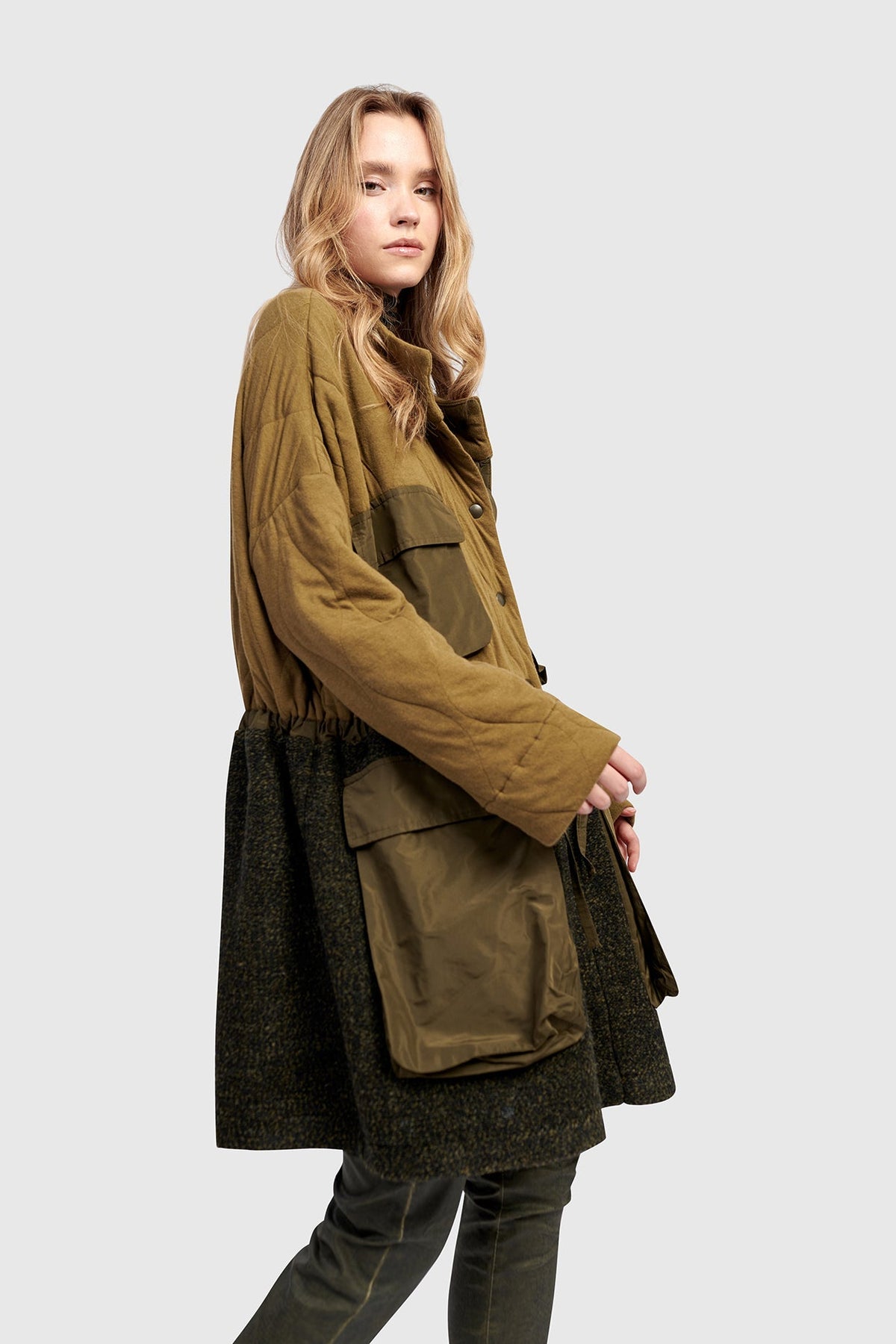 This oversized jacket plays with proportion and texture, combining a straight silhouette with boxy dropped shoulders and cuffed sleeves. Quilted and taffeta panels punctuate the brushed cotton blend, offering subtle contrast and warmth. Finished with front patch pockets, side slits, and button front, it layers with ease over anything from knits to woven separates.